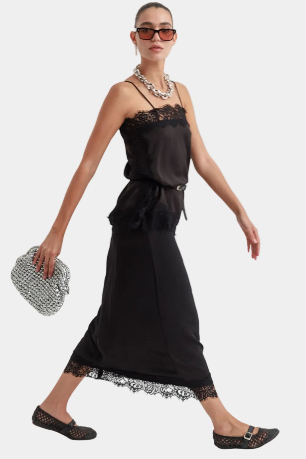 שמלת מידי עדינה בגזרה ישרה עם כתפיות דקות, שילוב תחרה ומראה רך ואלגנטי.