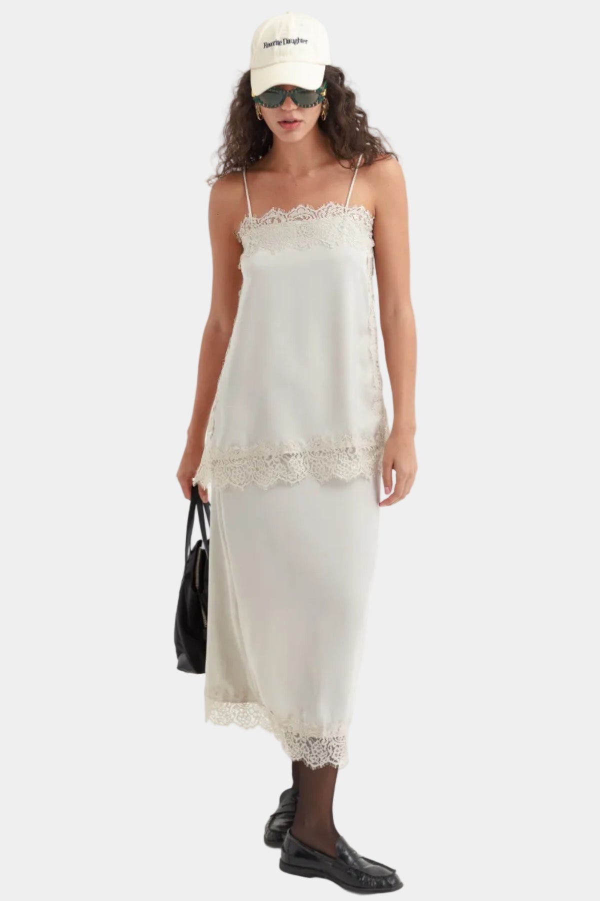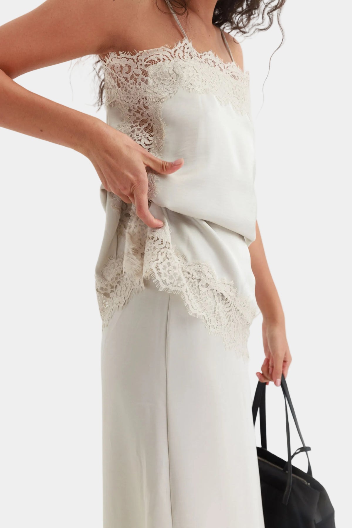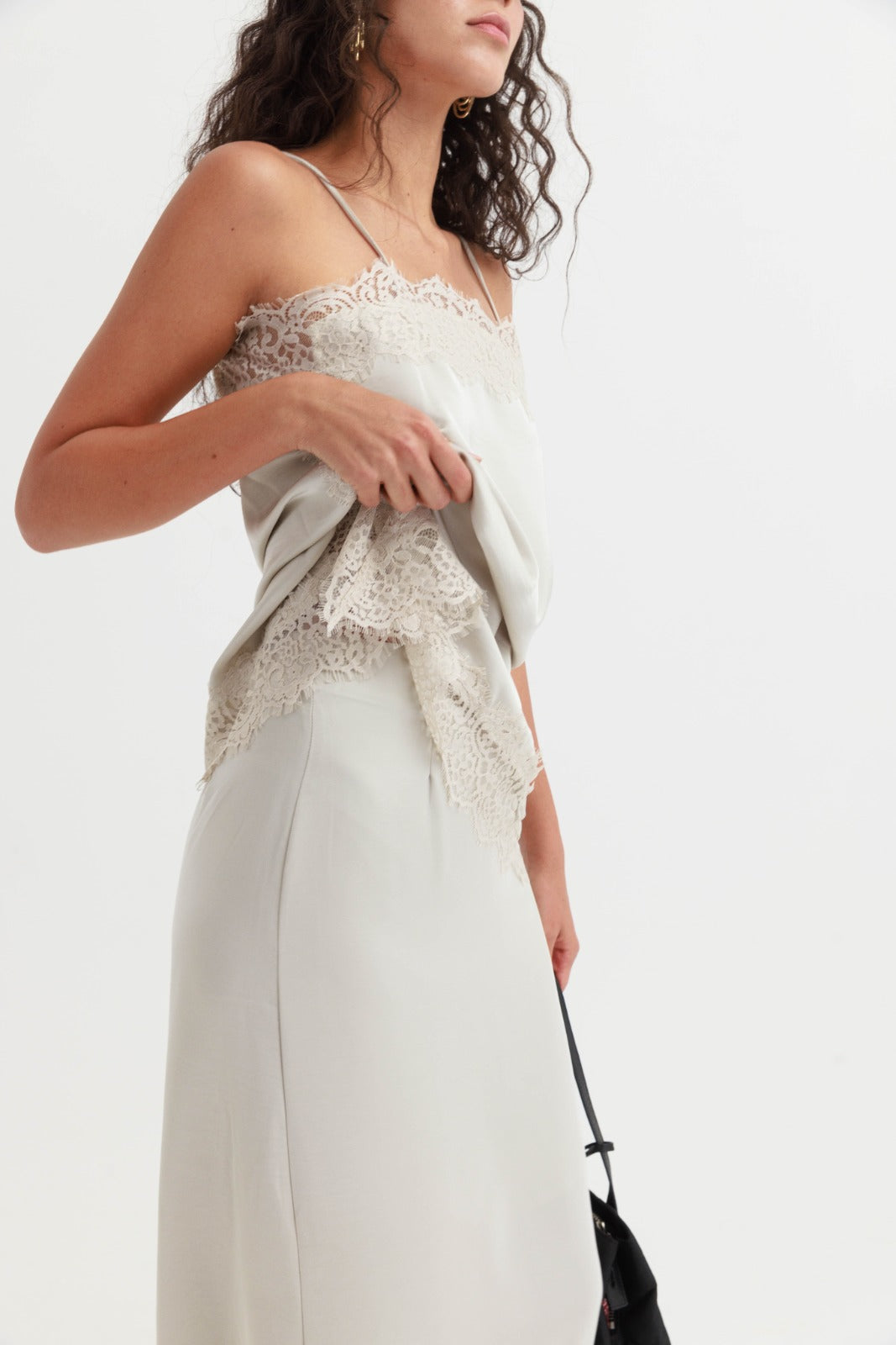 שמלת מידי עדינה בגזרה ישרה עם כתפיות דקות, שילוב תחרה ומראה רך ואלגנטי.