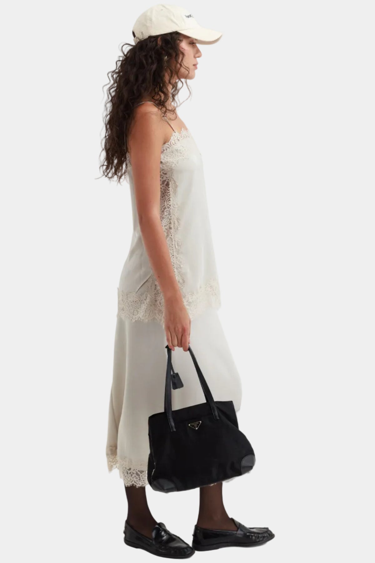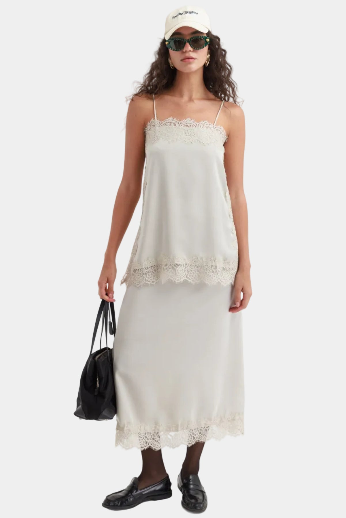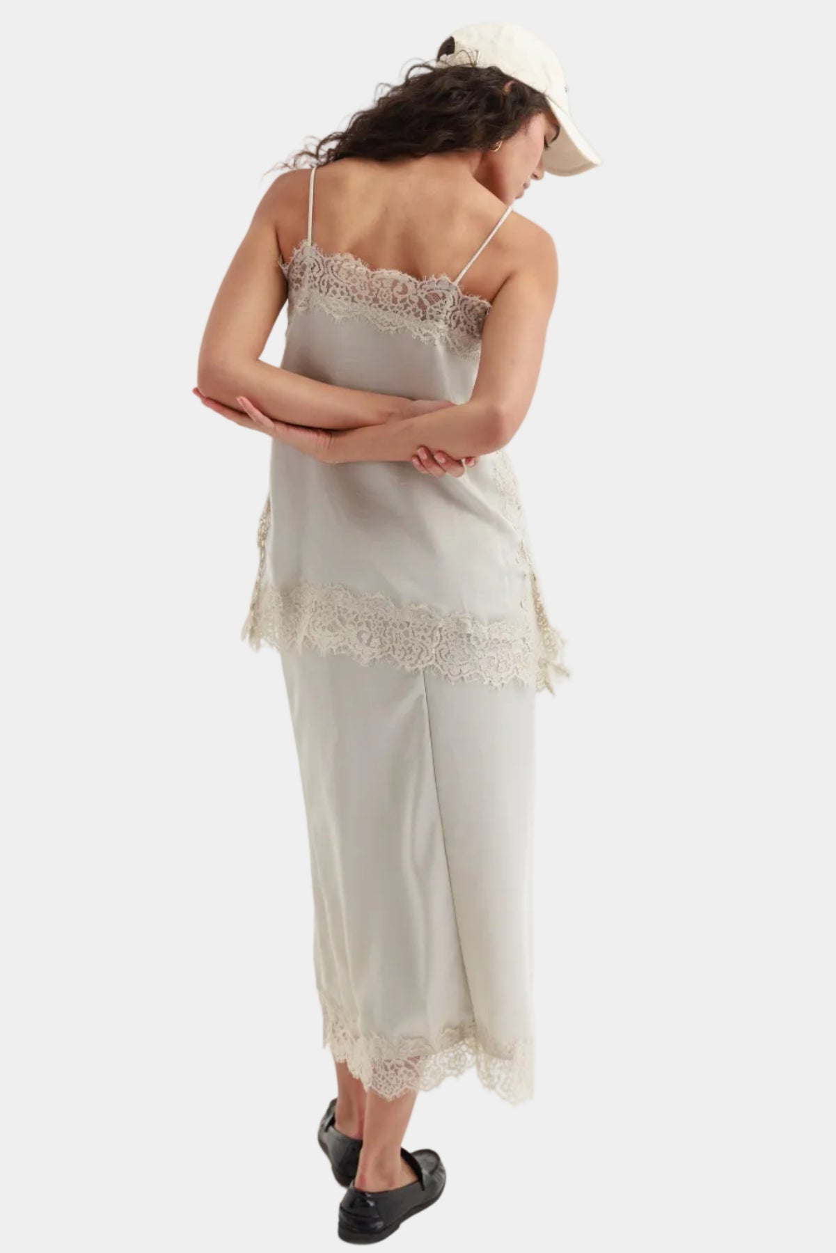 שמלת מידי עדינה בגזרה ישרה עם כתפיות דקות, שילוב תחרה ומראה רך ואלגנטי.