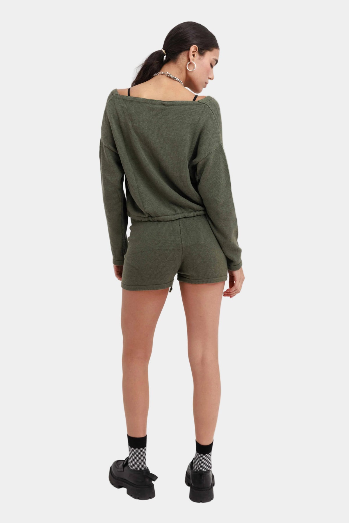 חליפת מכנס קצר בגזרה נינוחה עם קרדיגן תואם, שרוך קשירה ומראה קז’ואלי ונוח.