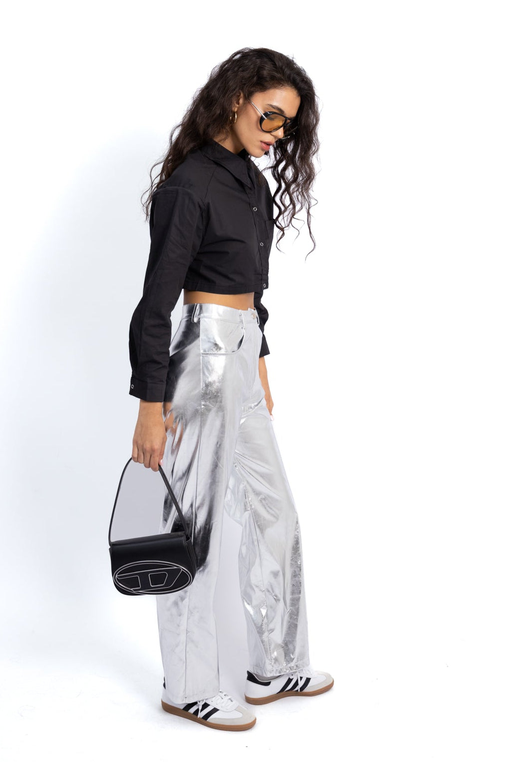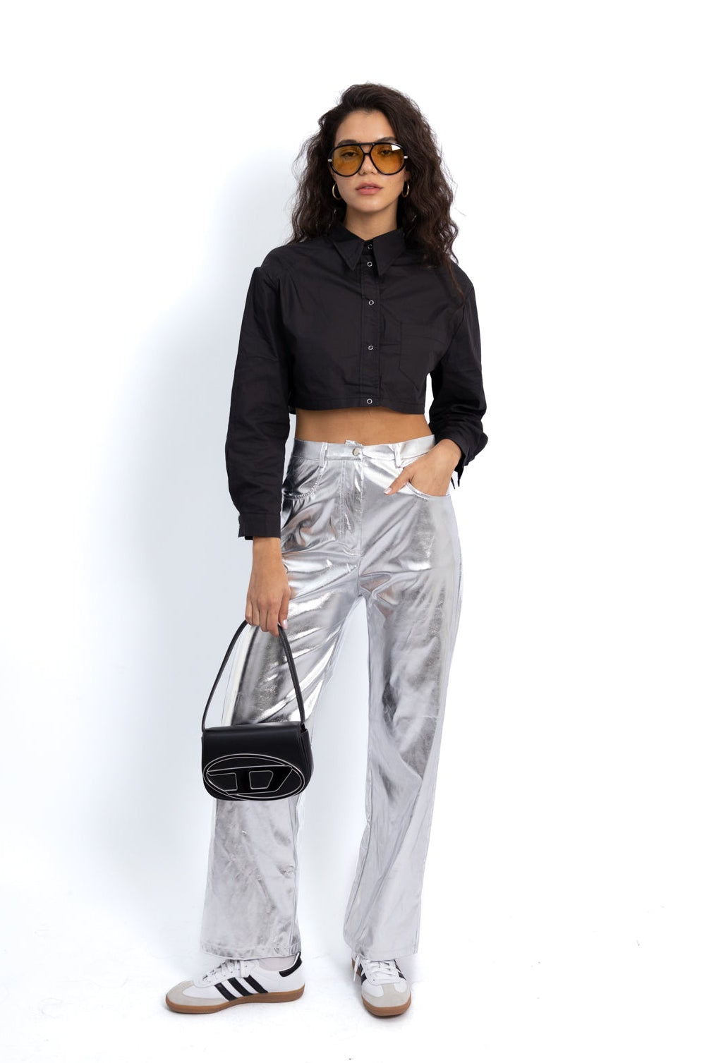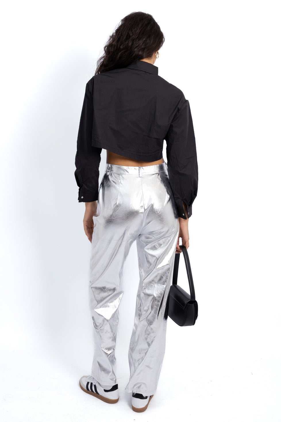 מכנס כסוף ארוך זוהר ומבריק עם סט כיסים קדמי וסגירת כפתור ורוכסן