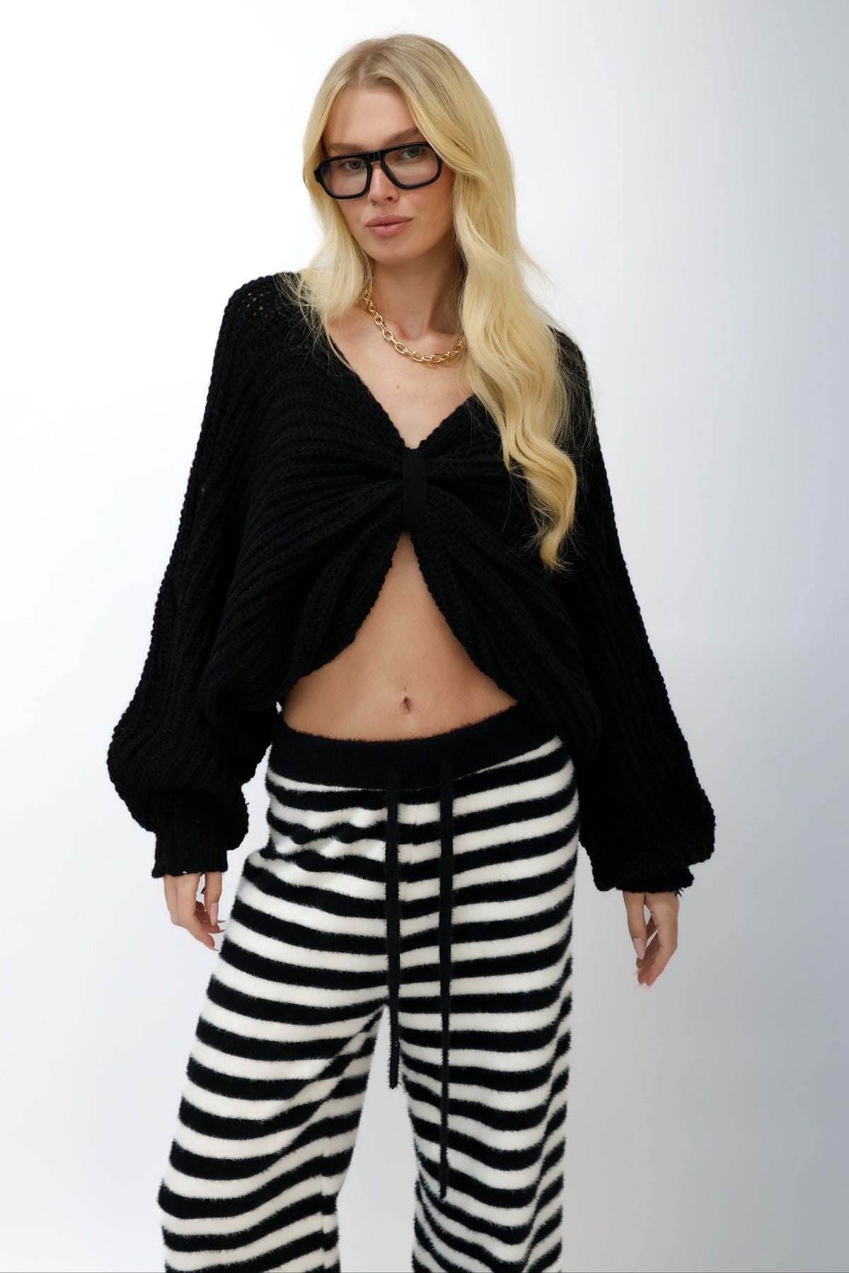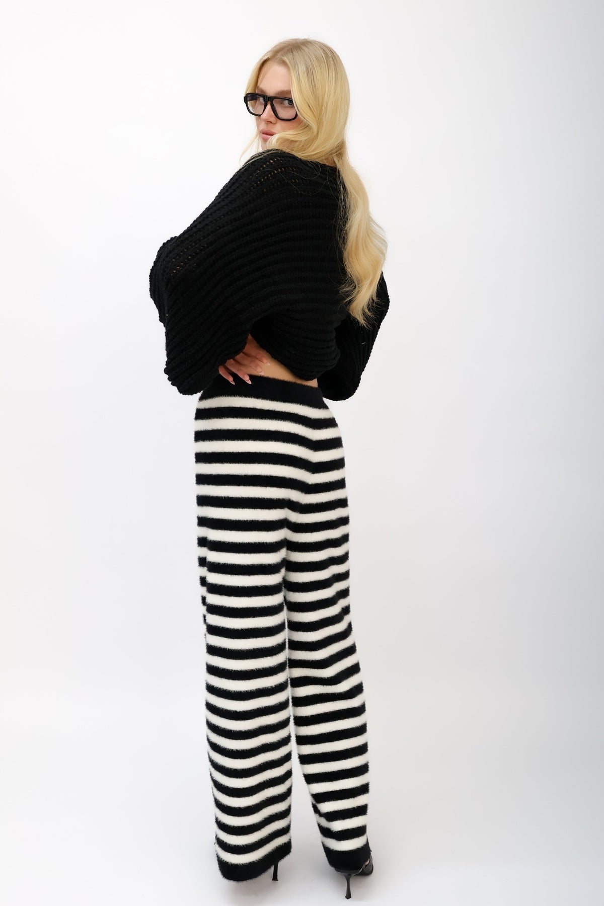 מכנסי סריג רכים בדוגמת פסים שחור–לבן בגזרה רחבה