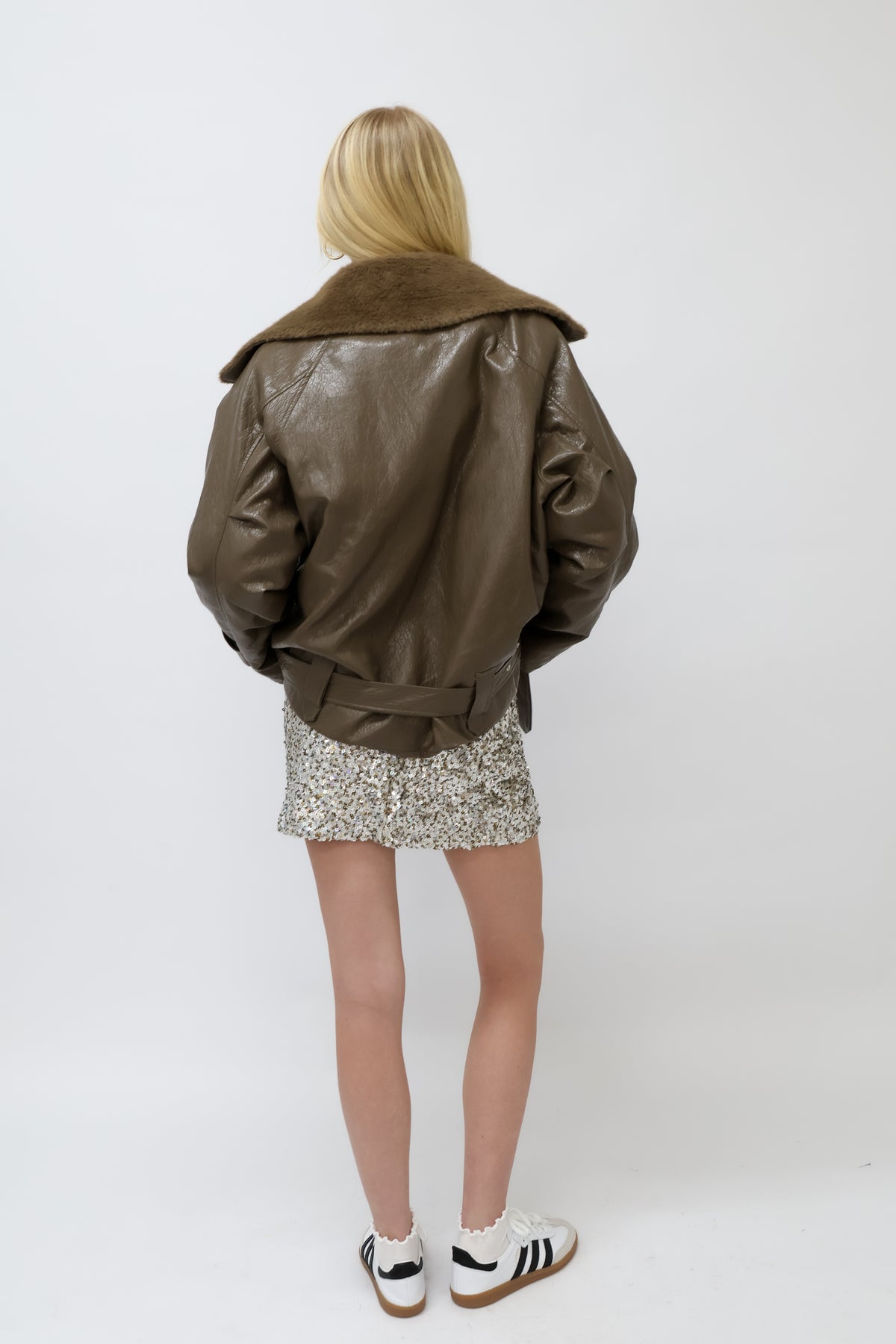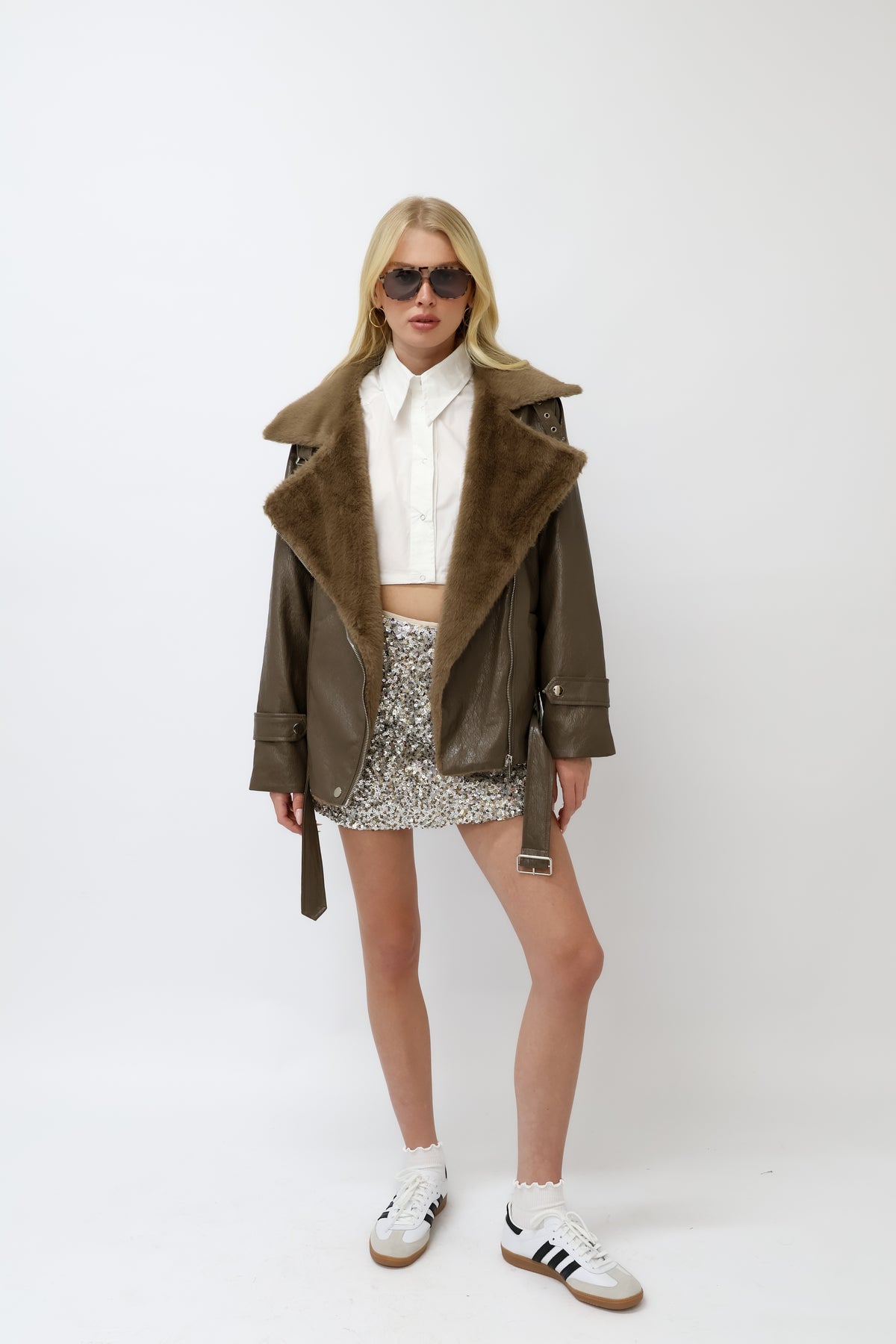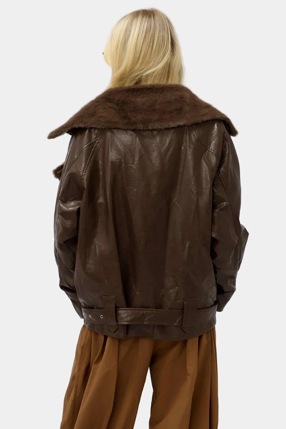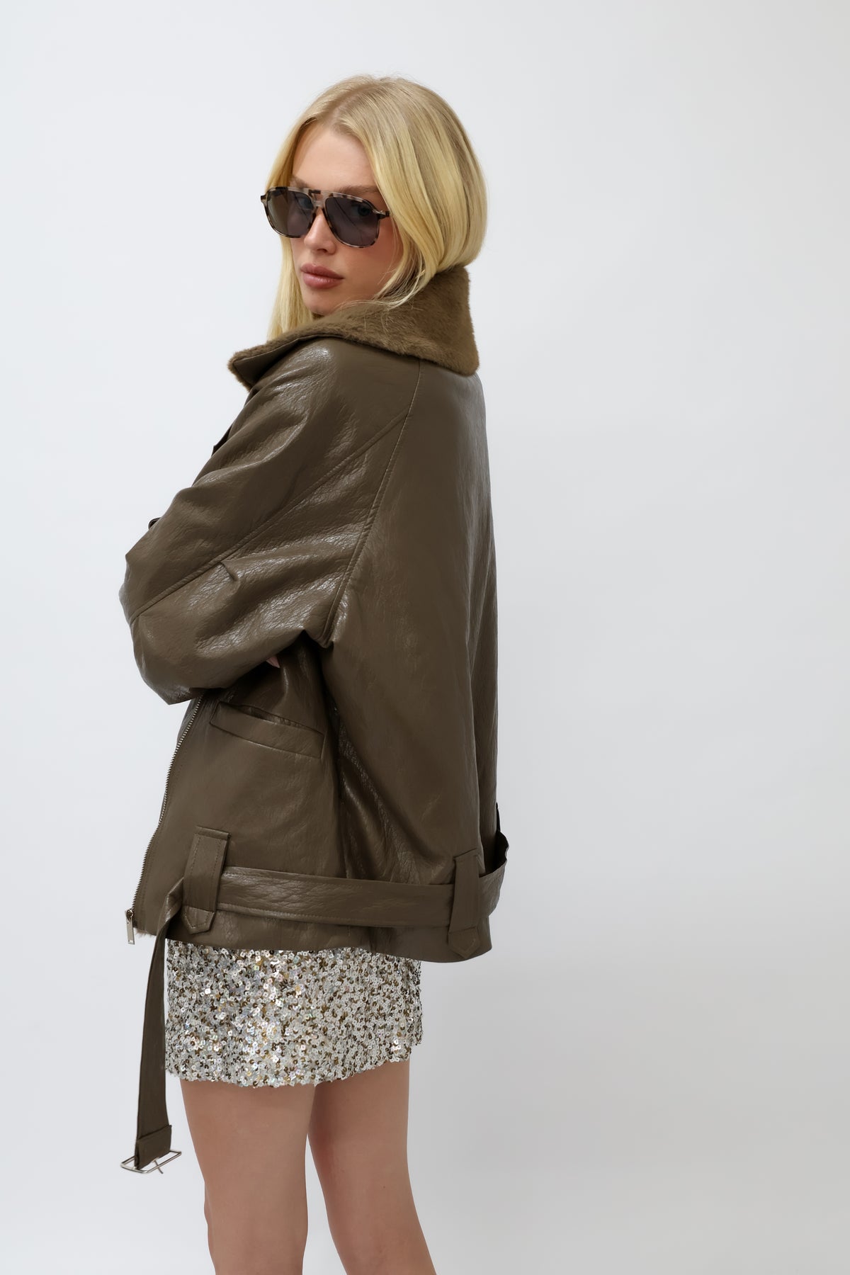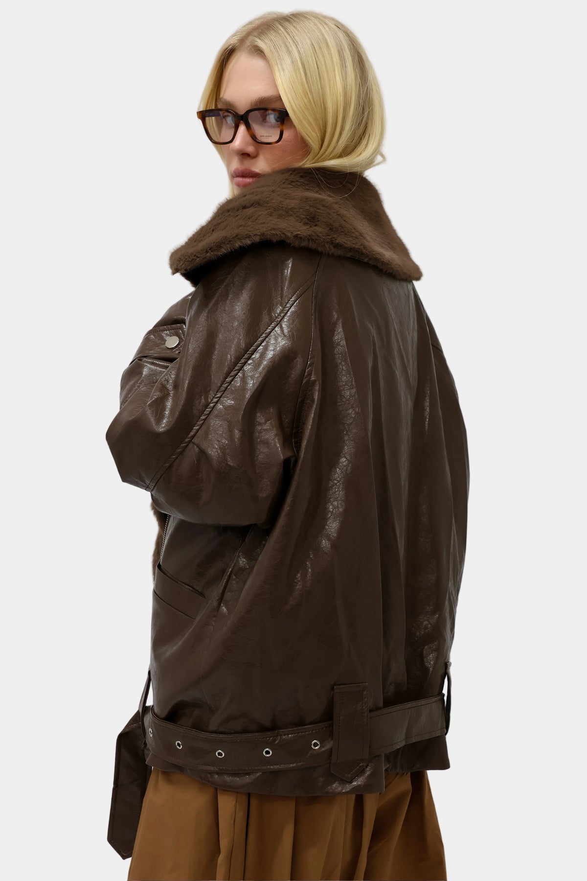 מעיל דמוי עור בגזרה משוחררת עם בטנת פרווה רכה, צווארון רחב וסגירת רוכסן.