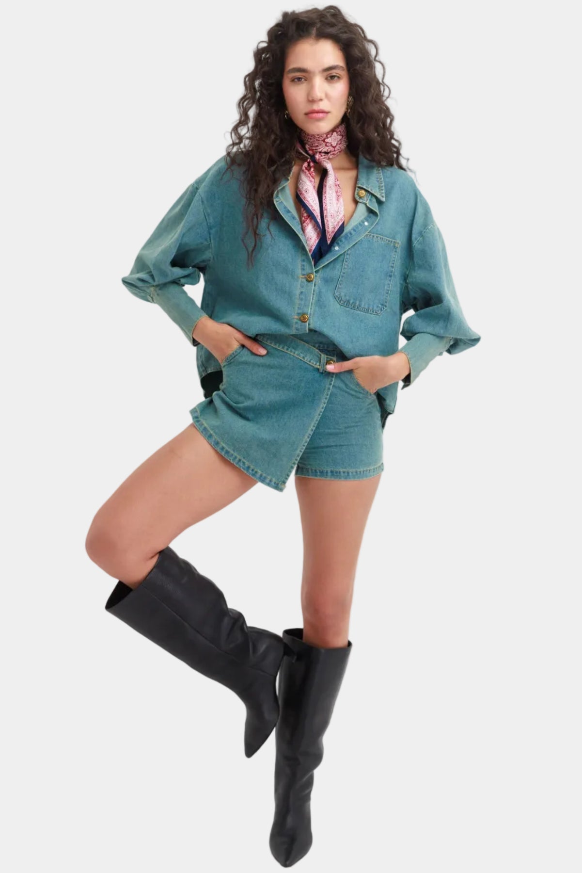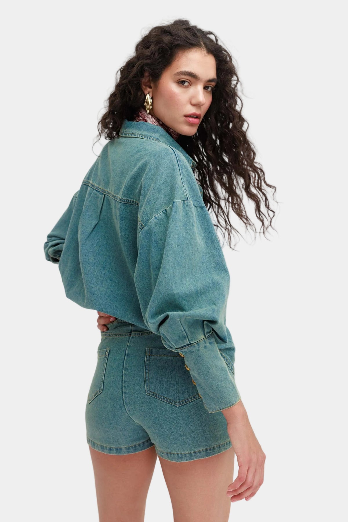 חליפת חצאית ג’ינס בגזרה משוחררת עם חולצה מכופתרת תואמת ומראה אורבני קליל.