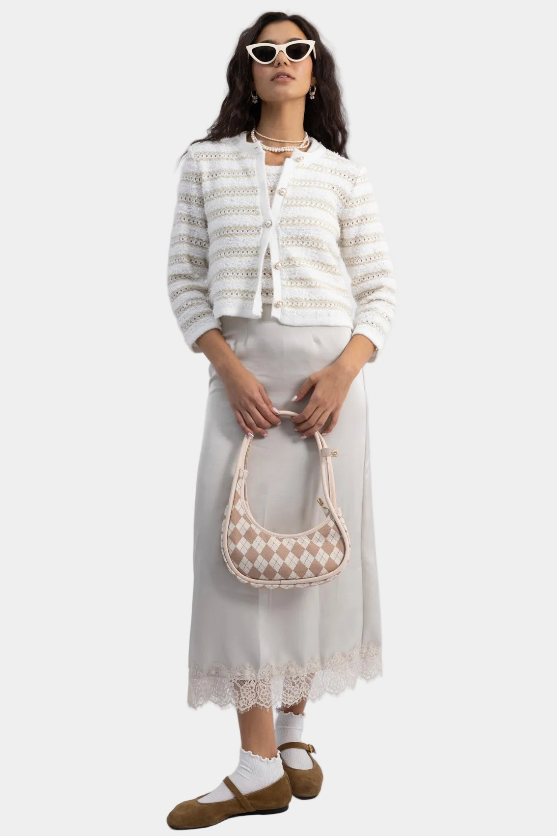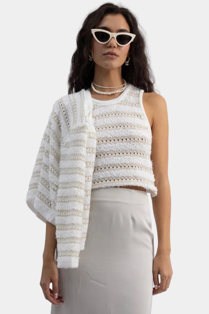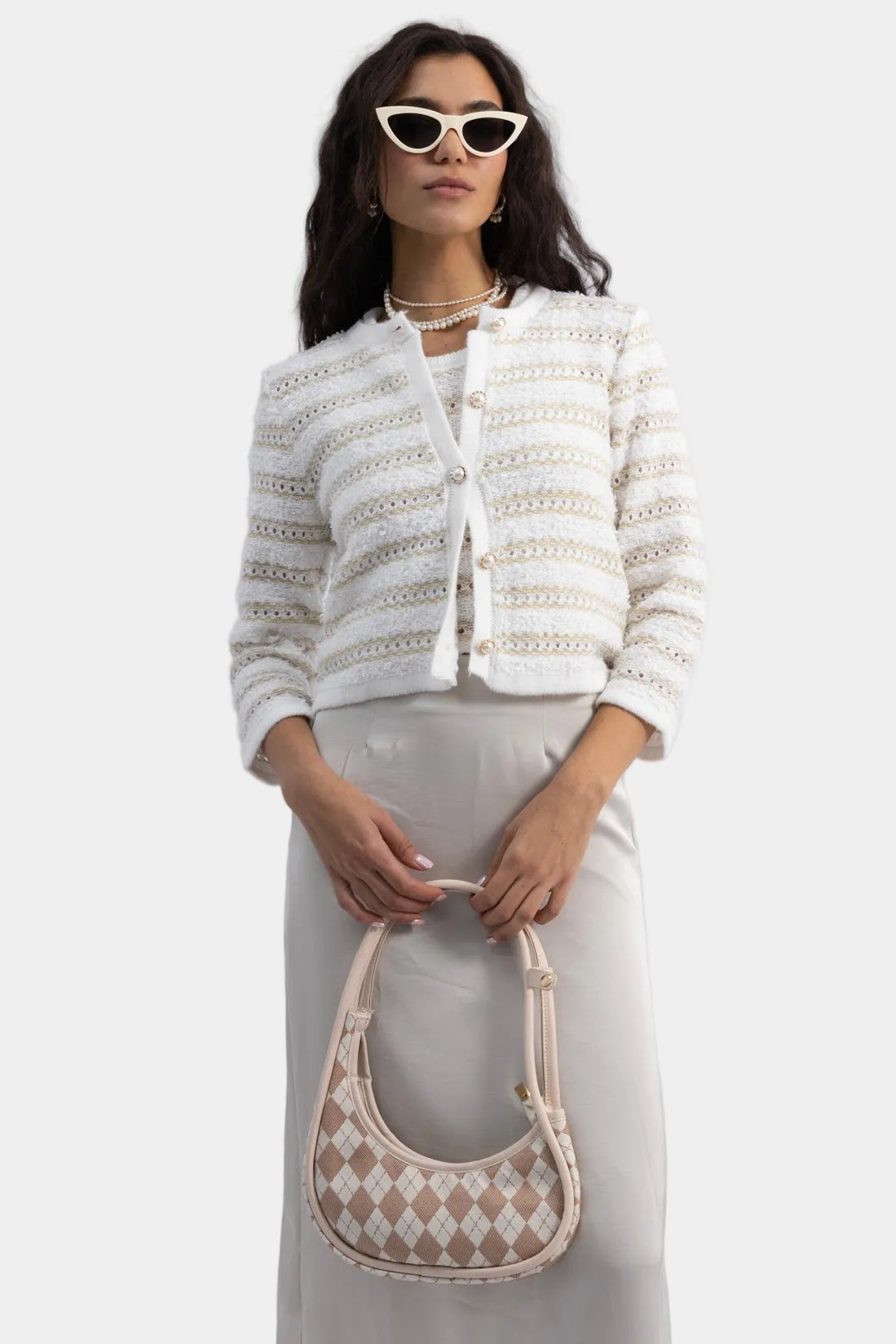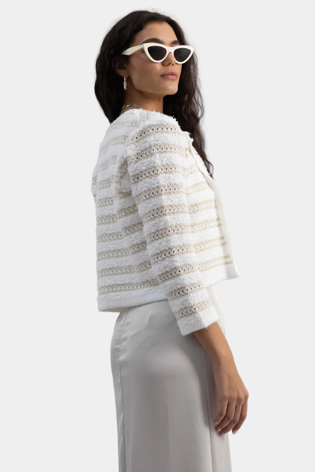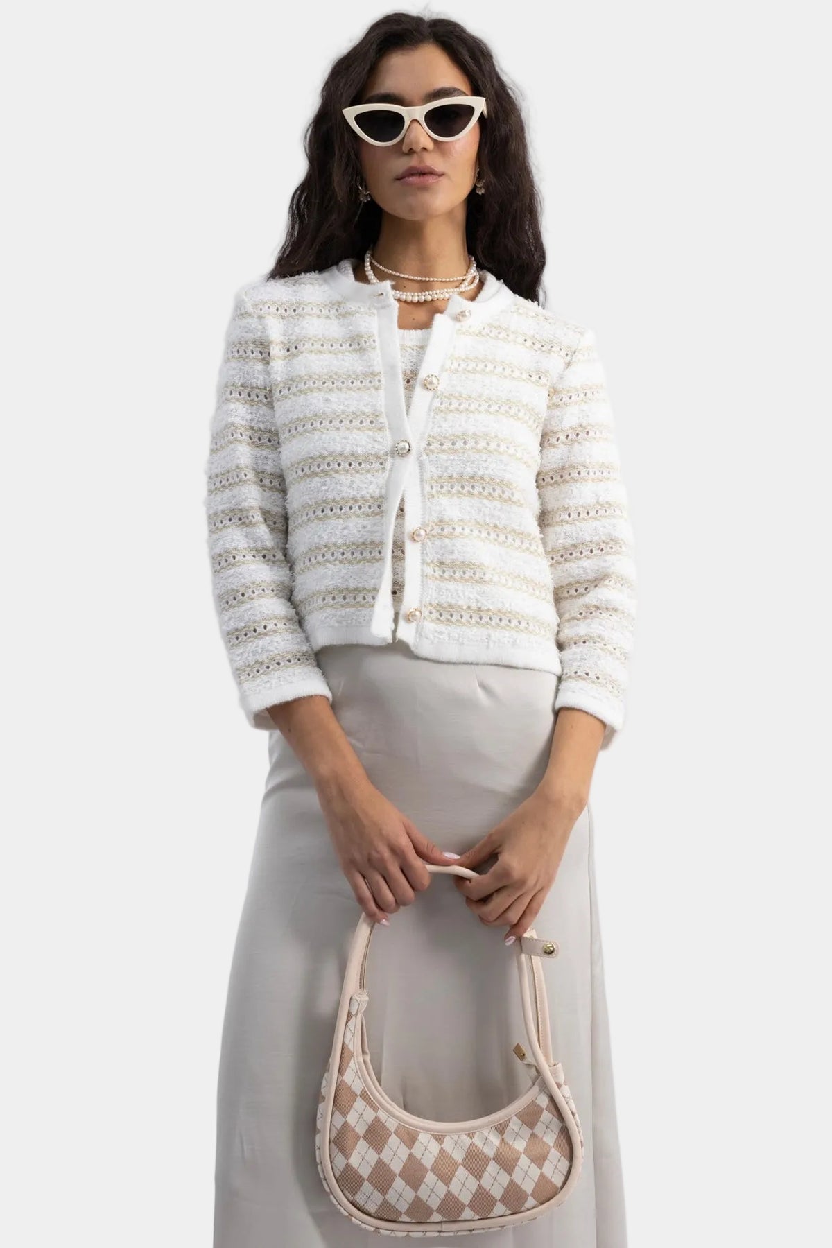סט סריג עדין בגזרה נקייה, כולל קרדיגן קצר עם כפתורים וחולצה תואמת. טקסטורה עשירה עם דוגמה מחוררת למראה אלגנטי ומעודכן – מתאים לשילוב יומיומי וגם לערב.