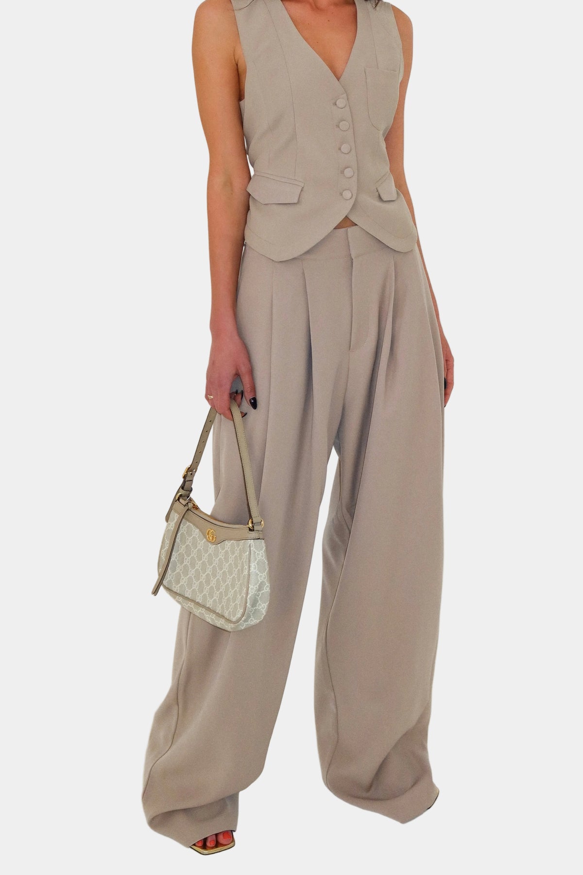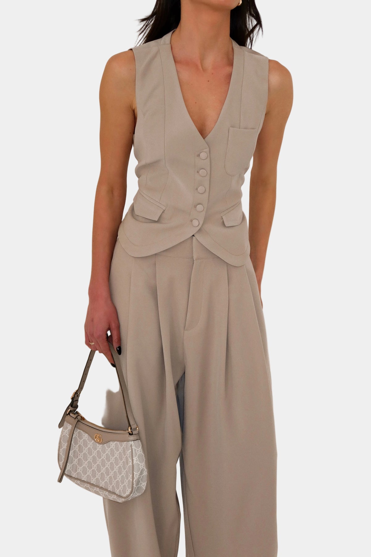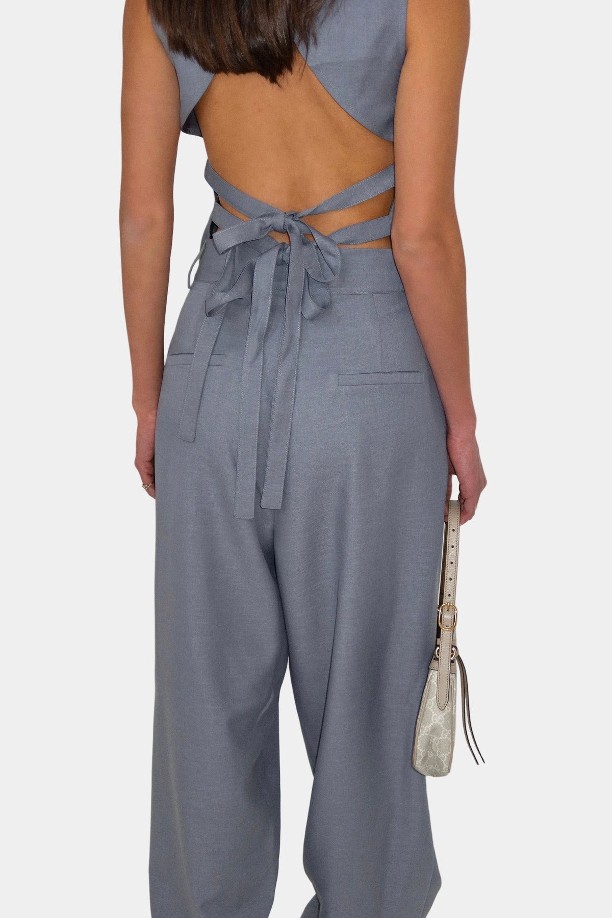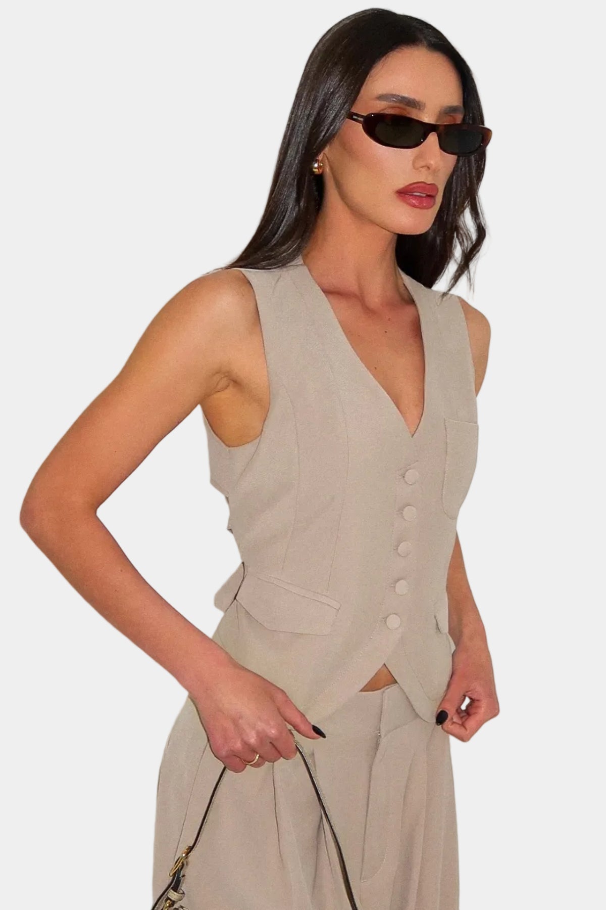 וסט מחויט בגזרה נשית עם מפתח V קדמי, גב פתוח וקשירה אחורית לדיוק המידה.