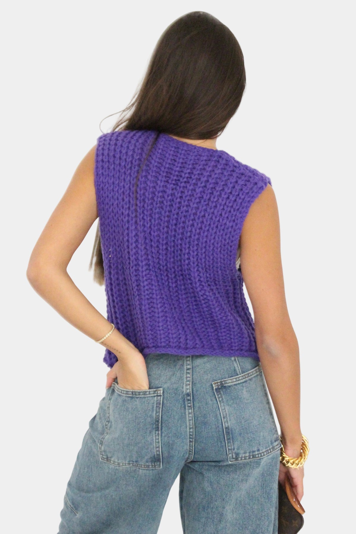 וסט סרוג ללא שרוולים בגזרה קלאסית, סריגה עבה ורכה עם כפתורים דקורטיביים וכיסים קדמיים למראה חמים וסטייליסטי.