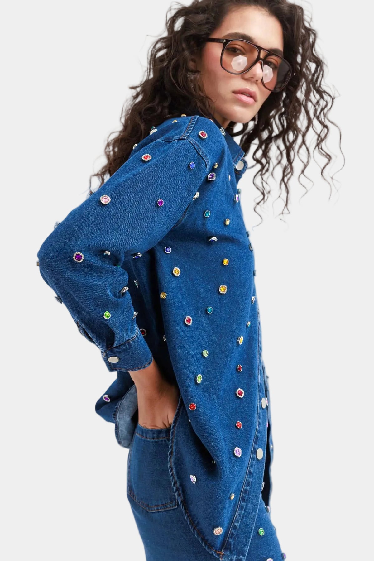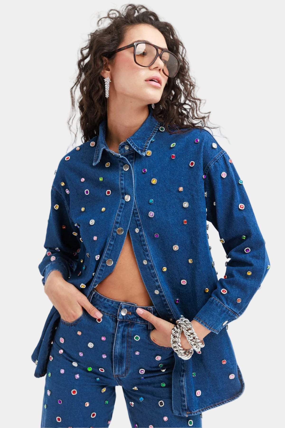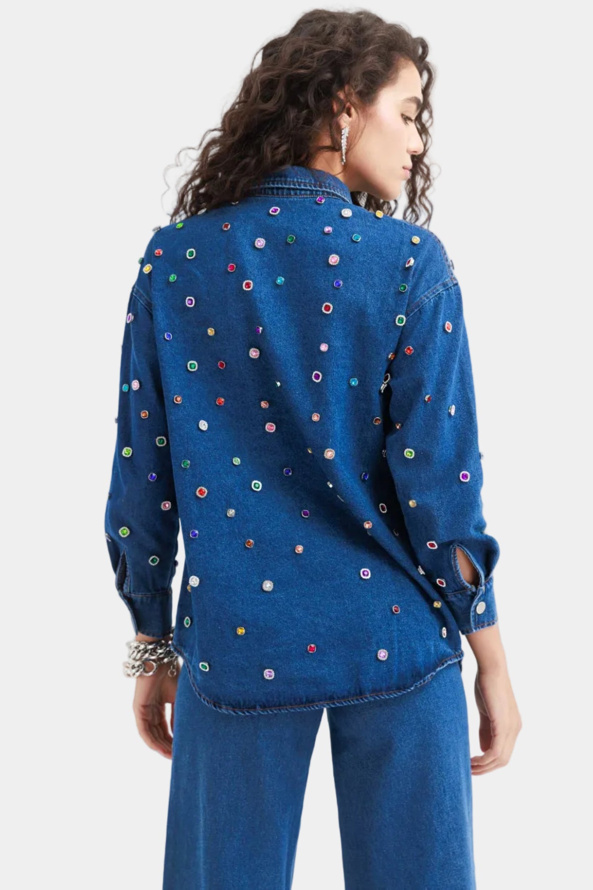 חולצת ג׳ינס מכופתרת בגזרה ישרה עם עיטורי אבנים צבעוניות לכל אורכה, מראה בולט ומלא סטייל שמשדרג כל הופעה.