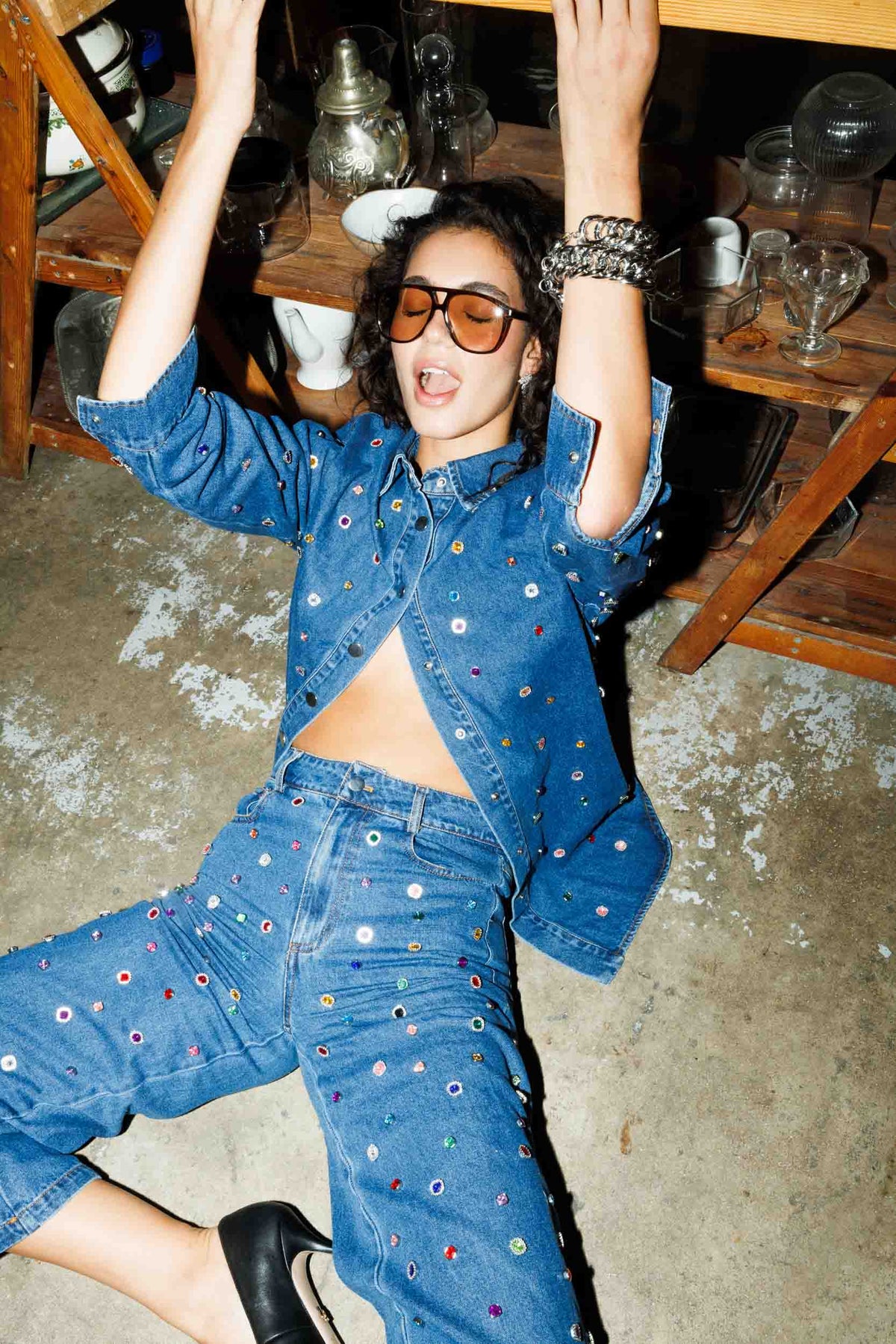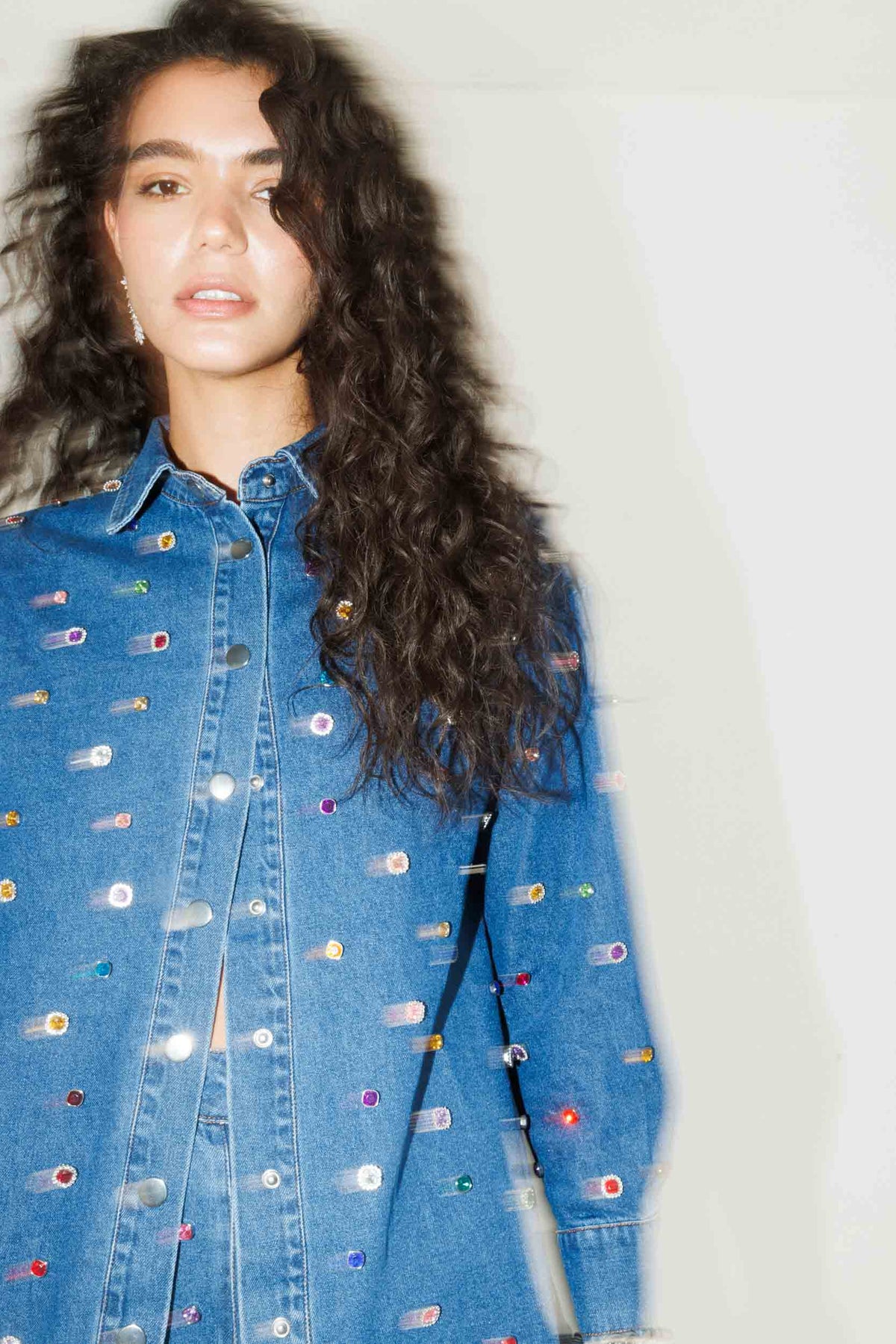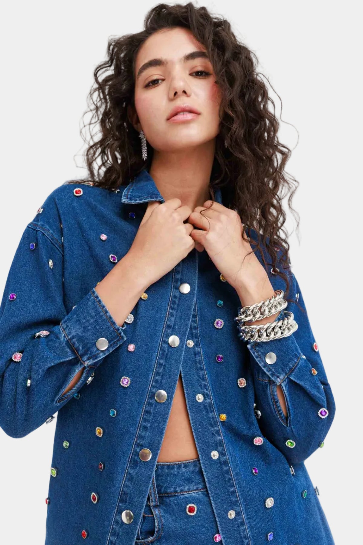 חולצת ג׳ינס מכופתרת בגזרה ישרה עם עיטורי אבנים צבעוניות לכל אורכה, מראה בולט ומלא סטייל שמשדרג כל הופעה.