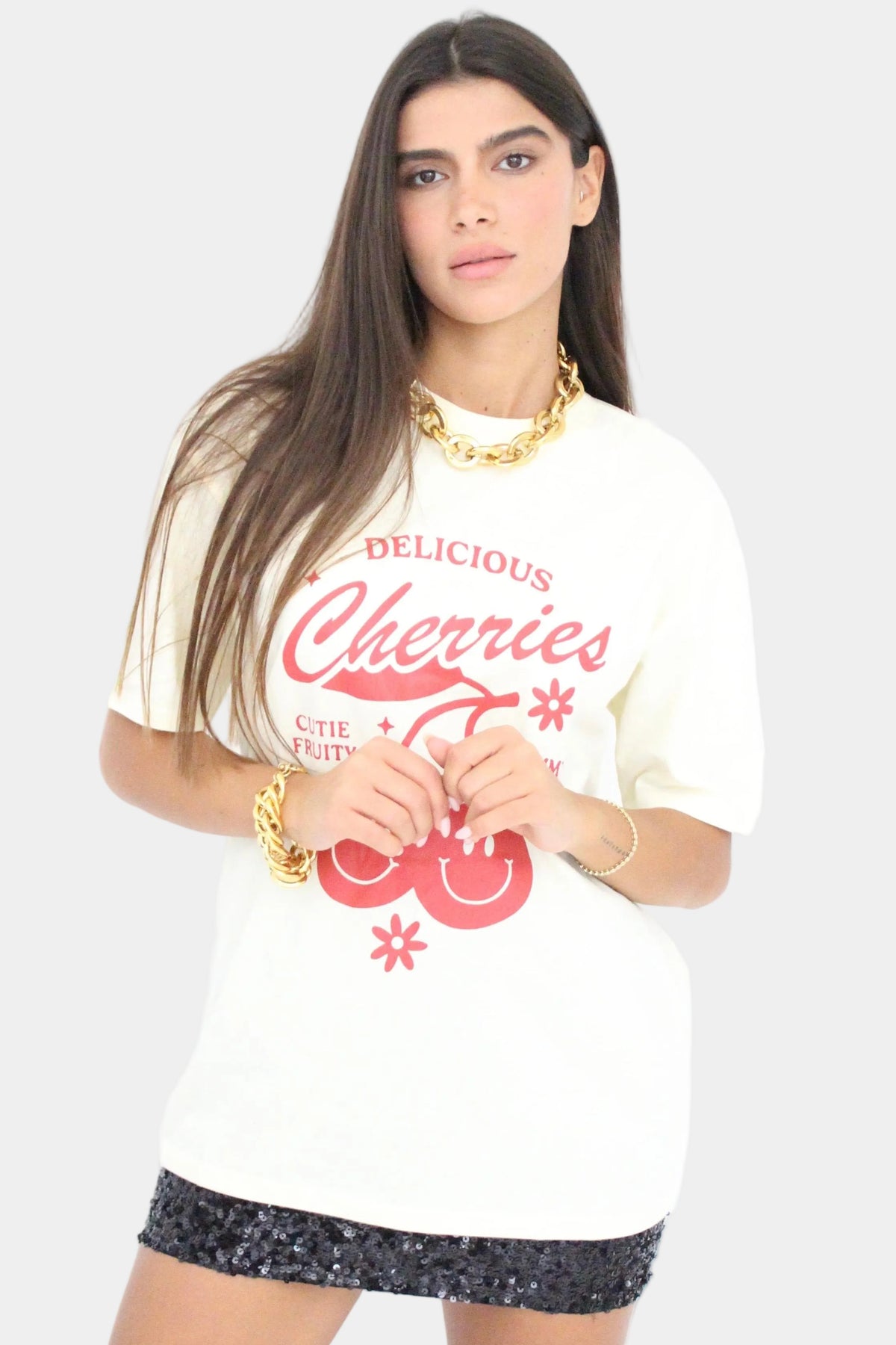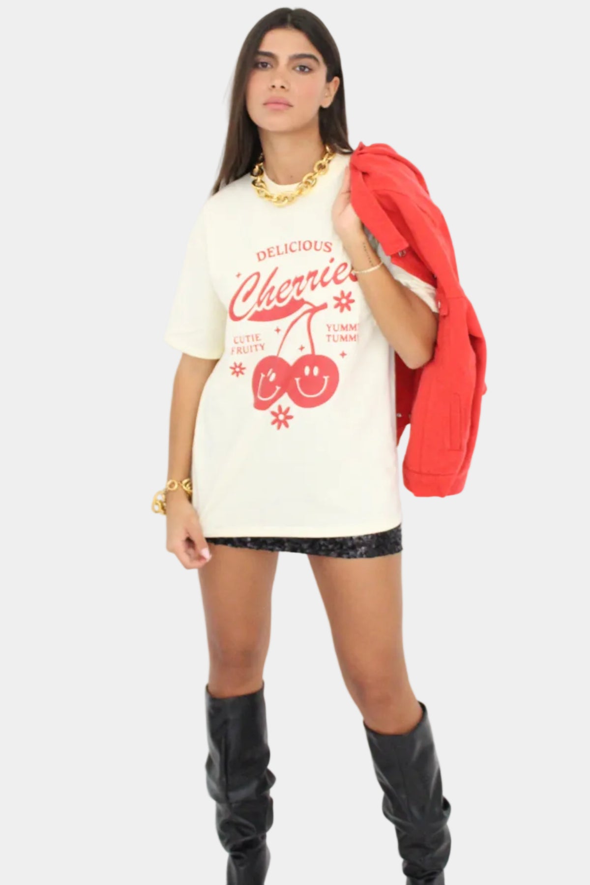 טי־שירט בגזרה רפויה עם הדפס גרפי קדמי של דובדבנים וטקסט וינטג׳, ללוק יומיומי עם נוכחות צבעונית.