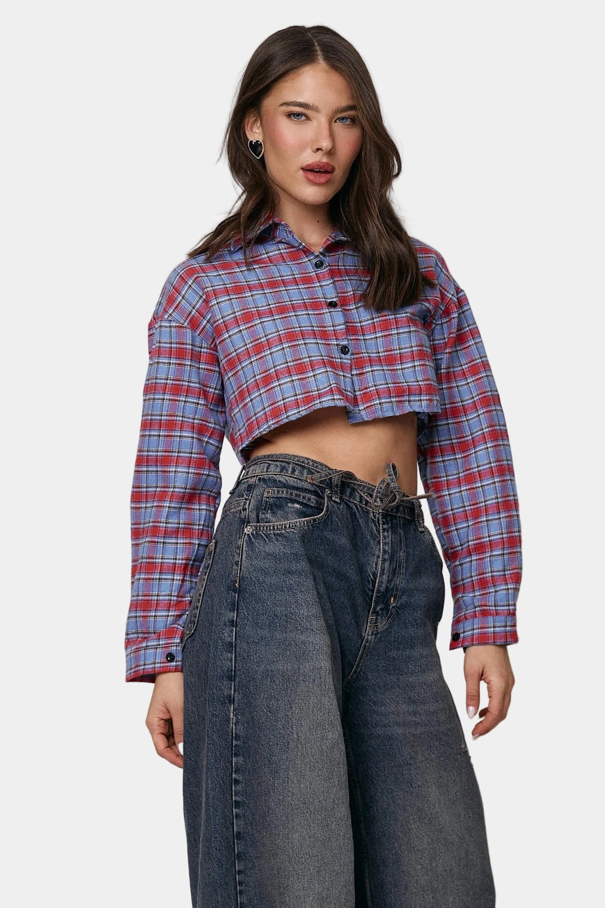 חולצת קרופ מכופתרת מבד פלנל בהדפס משבצות, בגזרה מחמיאה עם שרוולים ארוכים ולוק יומיומי־אופנתי.