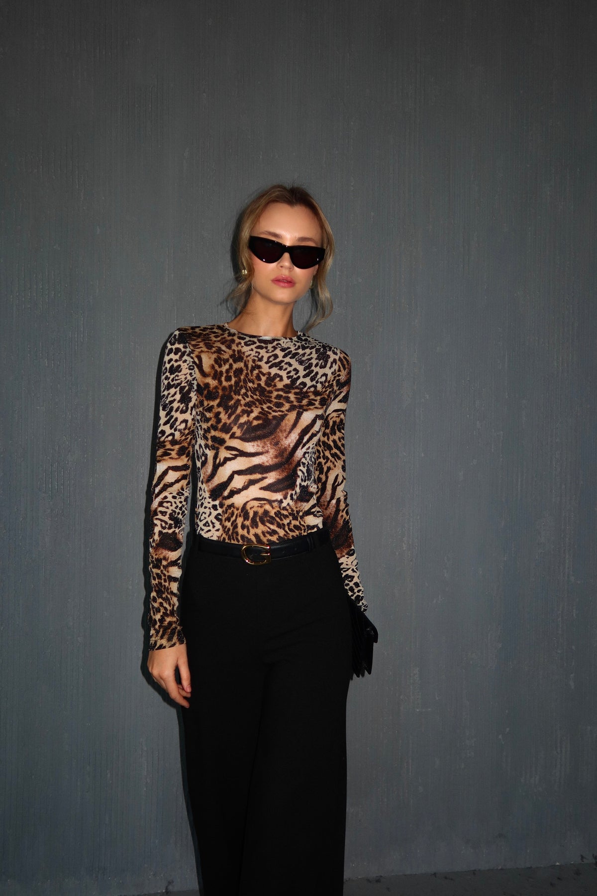 חולצה בהדפס מנומר/מזובר בד לייקרה | גזרה צמודה | שילוב לורקסS 34-36 M 36-38 מידות S הדוגמנית לובשת מידה