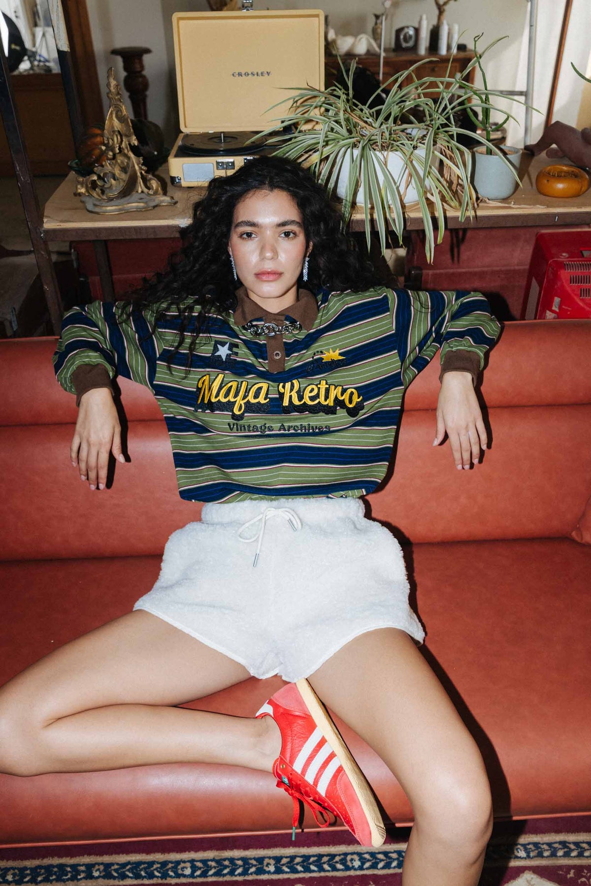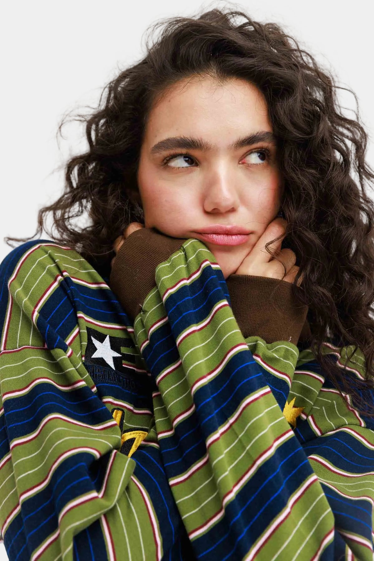 חולצת פסים בגזרה משוחררת עם צווארון וכפתורים, הדפס קדמי בסגנון רטרו ולוק יומיומי עם נוכחות.
