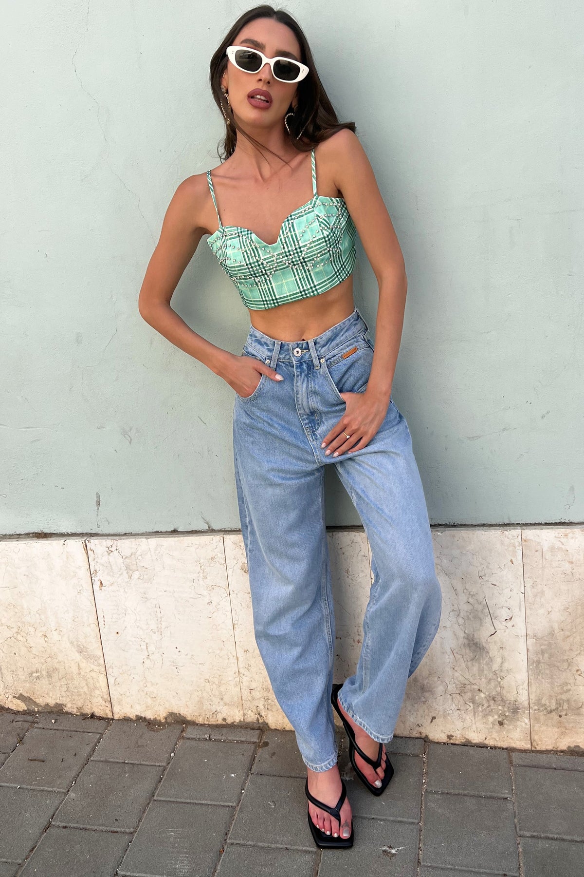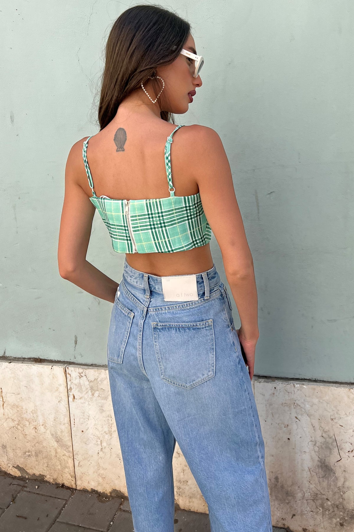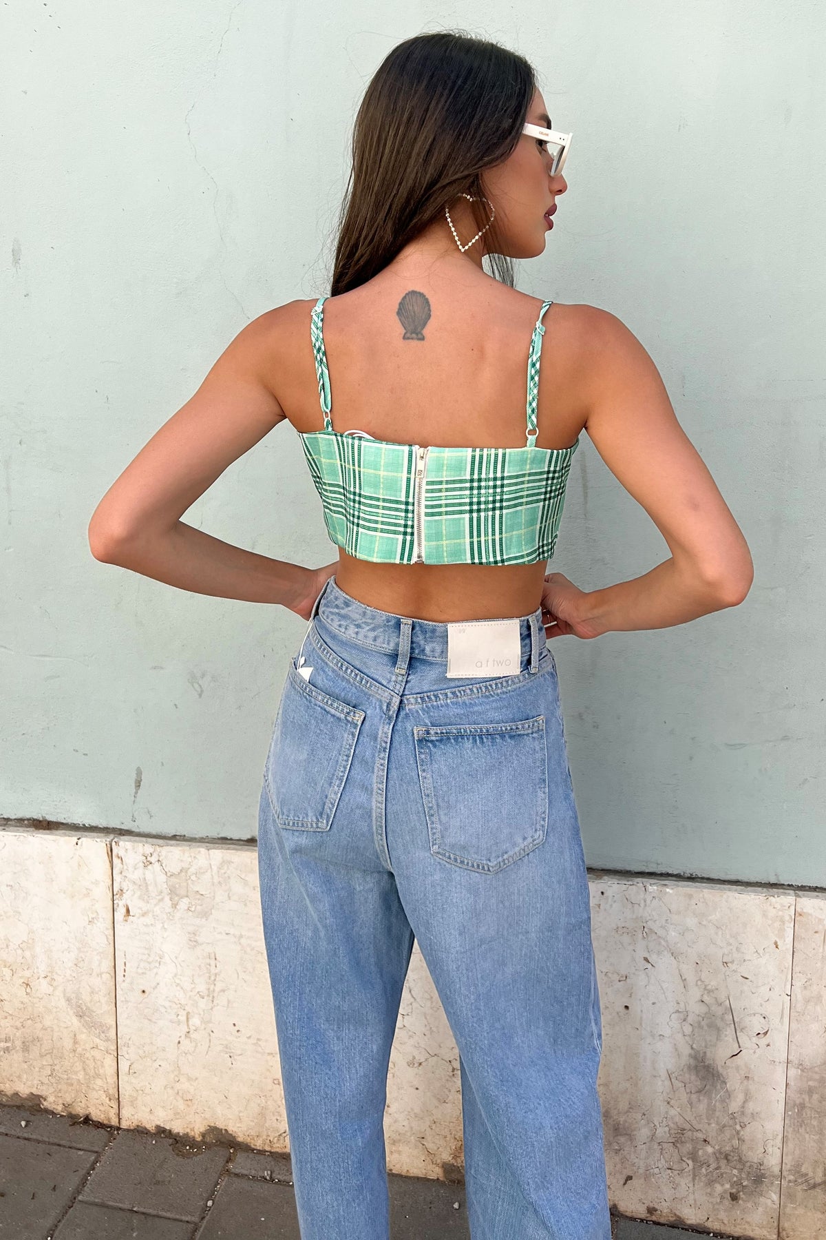 טופ שיקי משובץ עם הדפס משבצות, כתפיות דקות ורוכסן מאחור