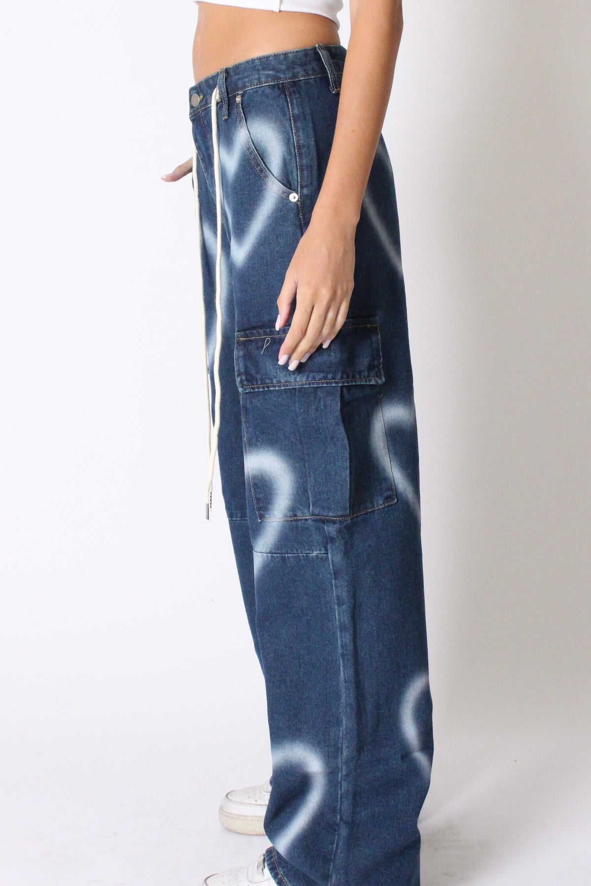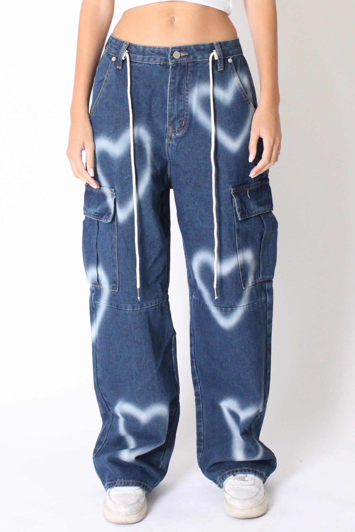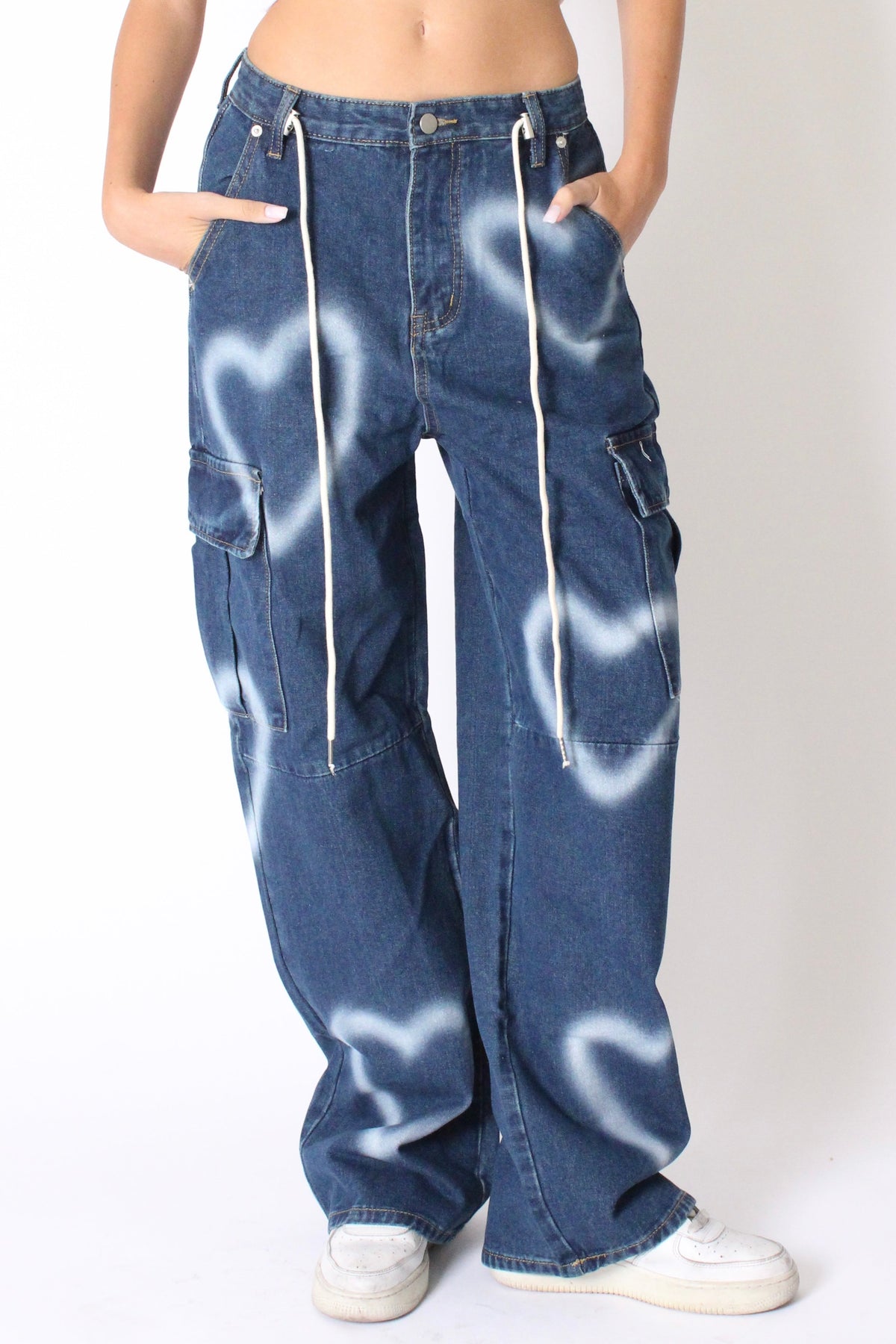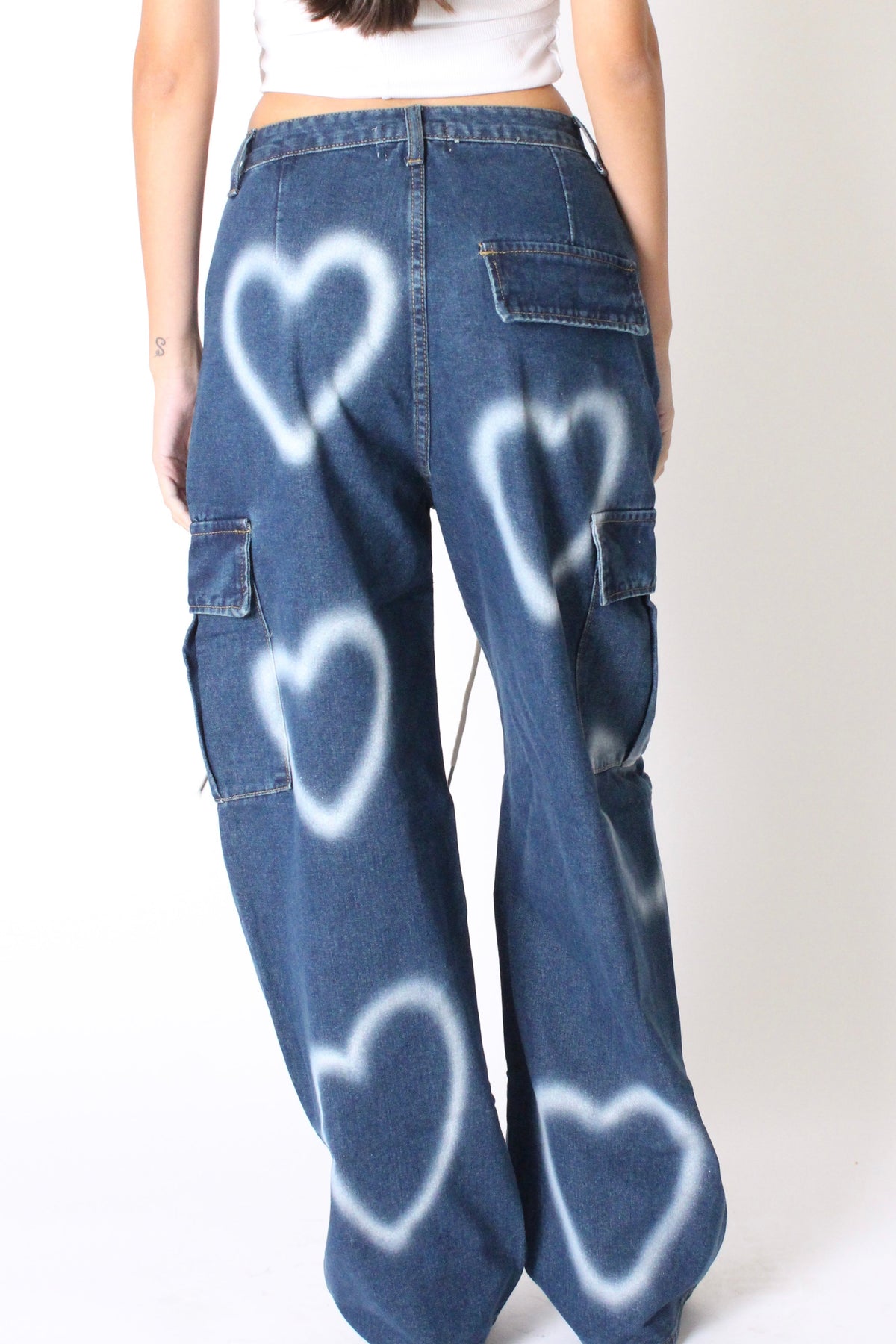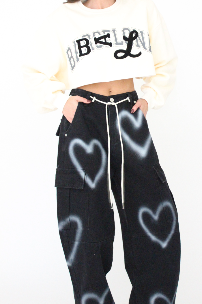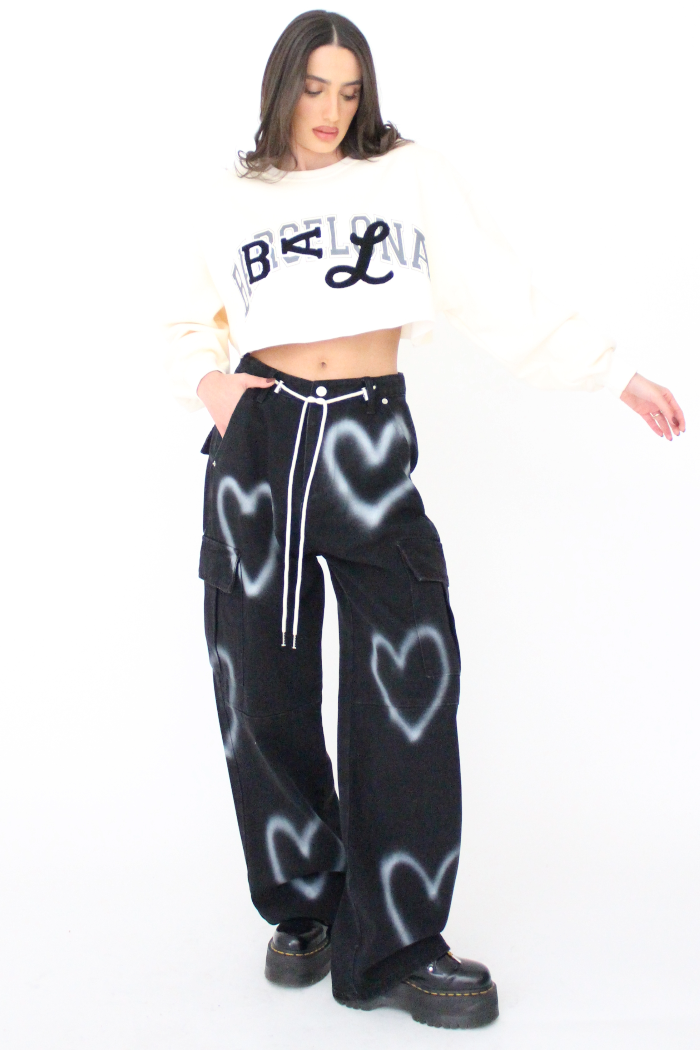מכנסי גינס ארוכים ורחבים בגזרת דגמח, עם כיסים מקדימה וכיסים גדולים בצדדים, עם פרינט לבבות משופשף וסגירת כפתור ורוכסן