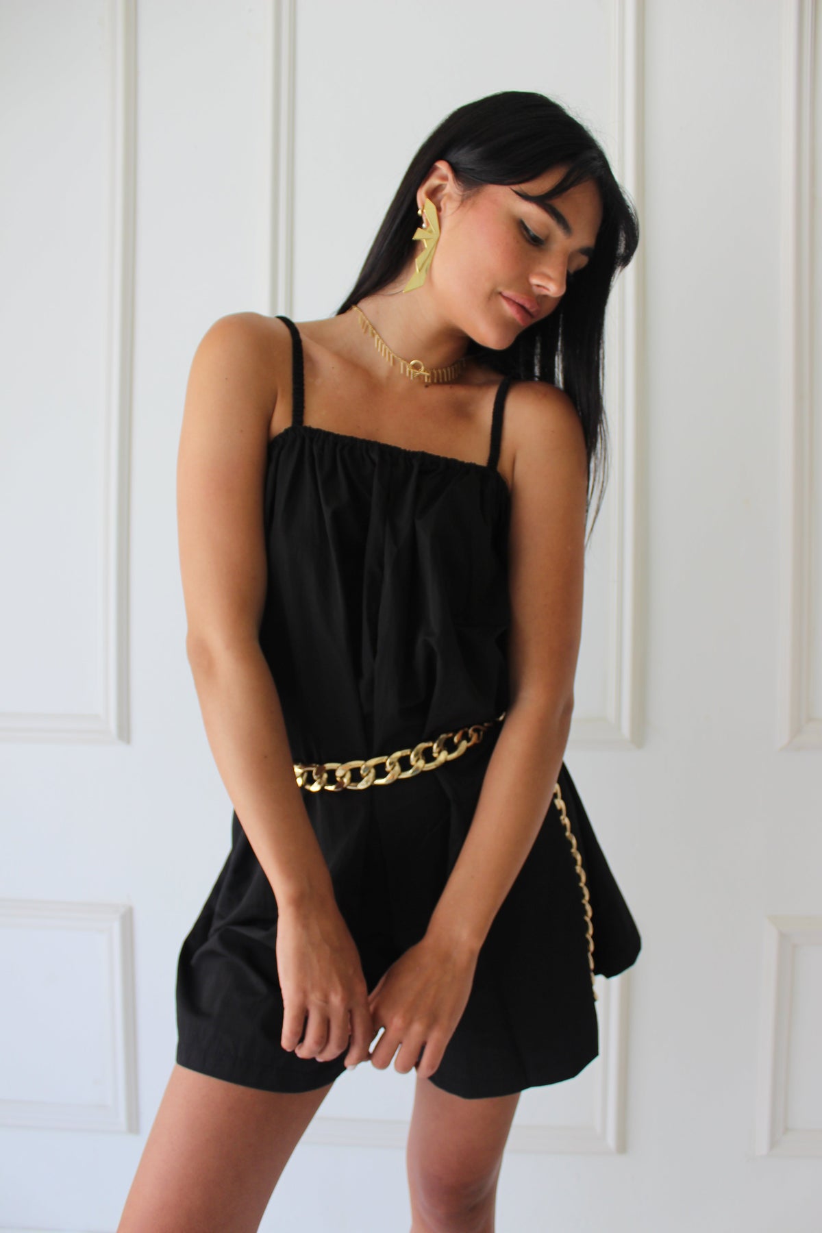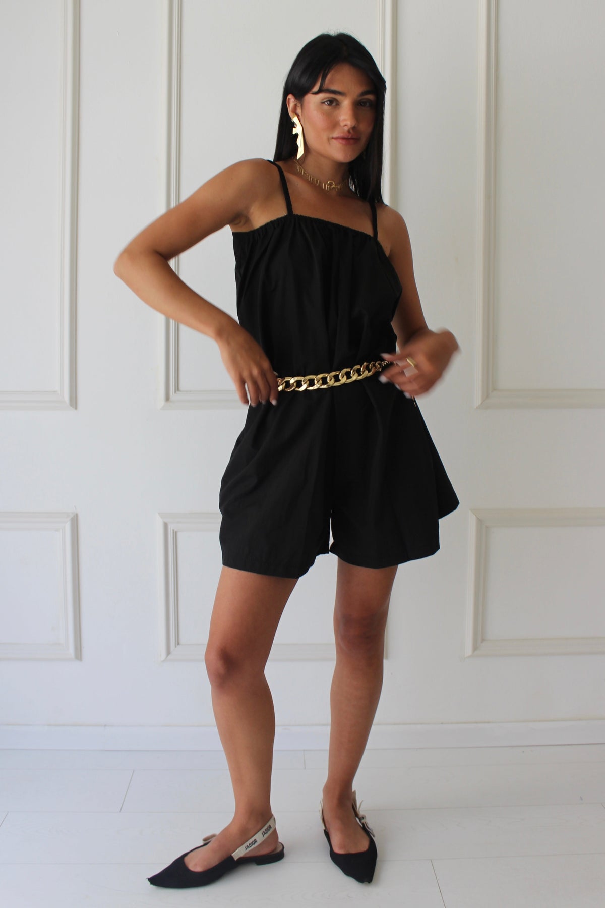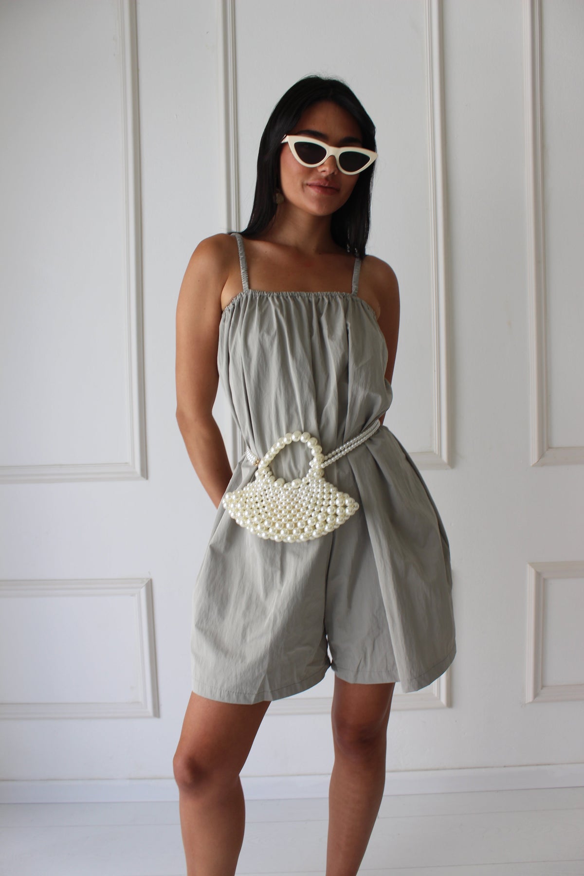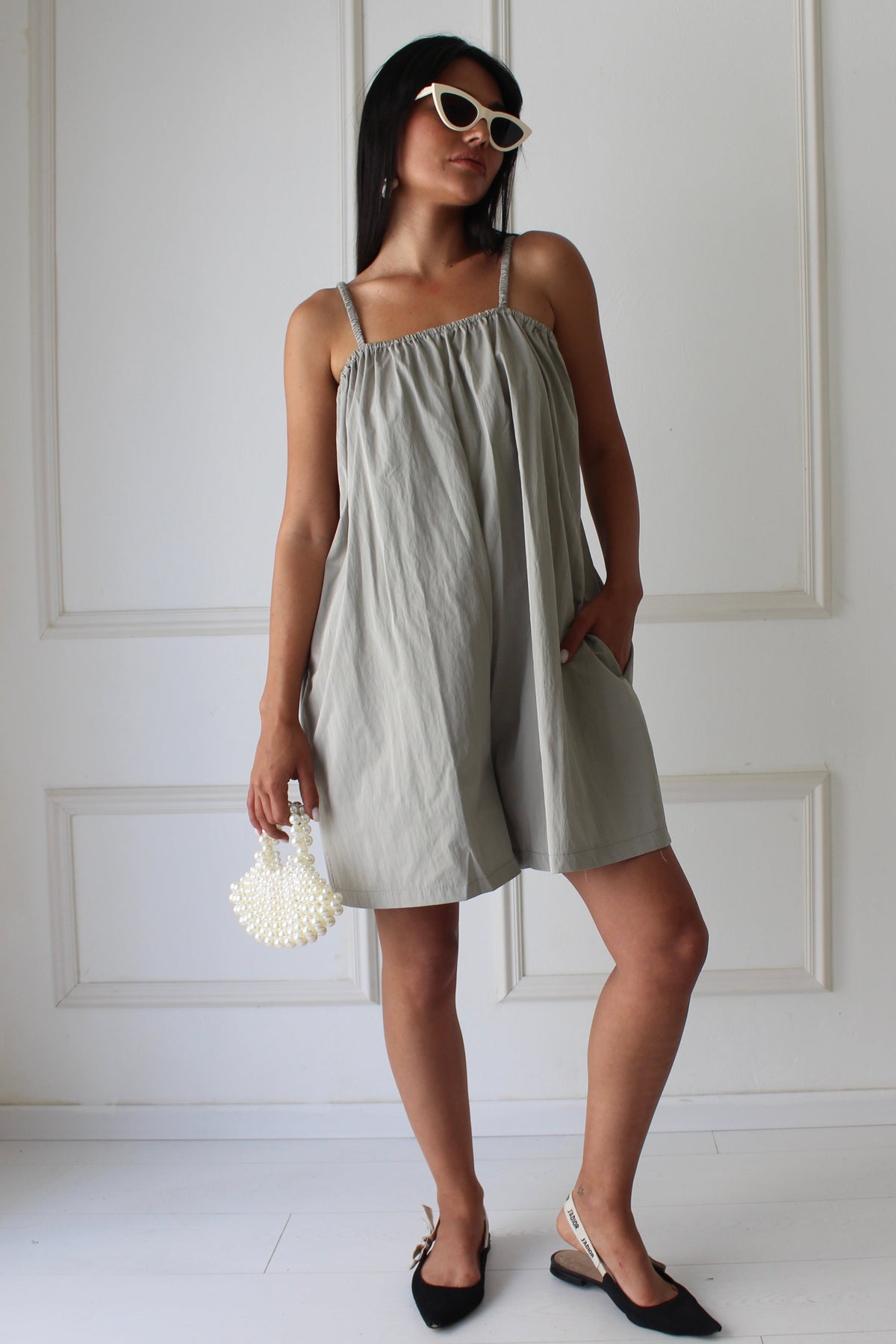 אוברול קצר עם כתפיות דקות בחלק העליון ומפתח צוואר מרובע, מתרחב באזור המכנס
