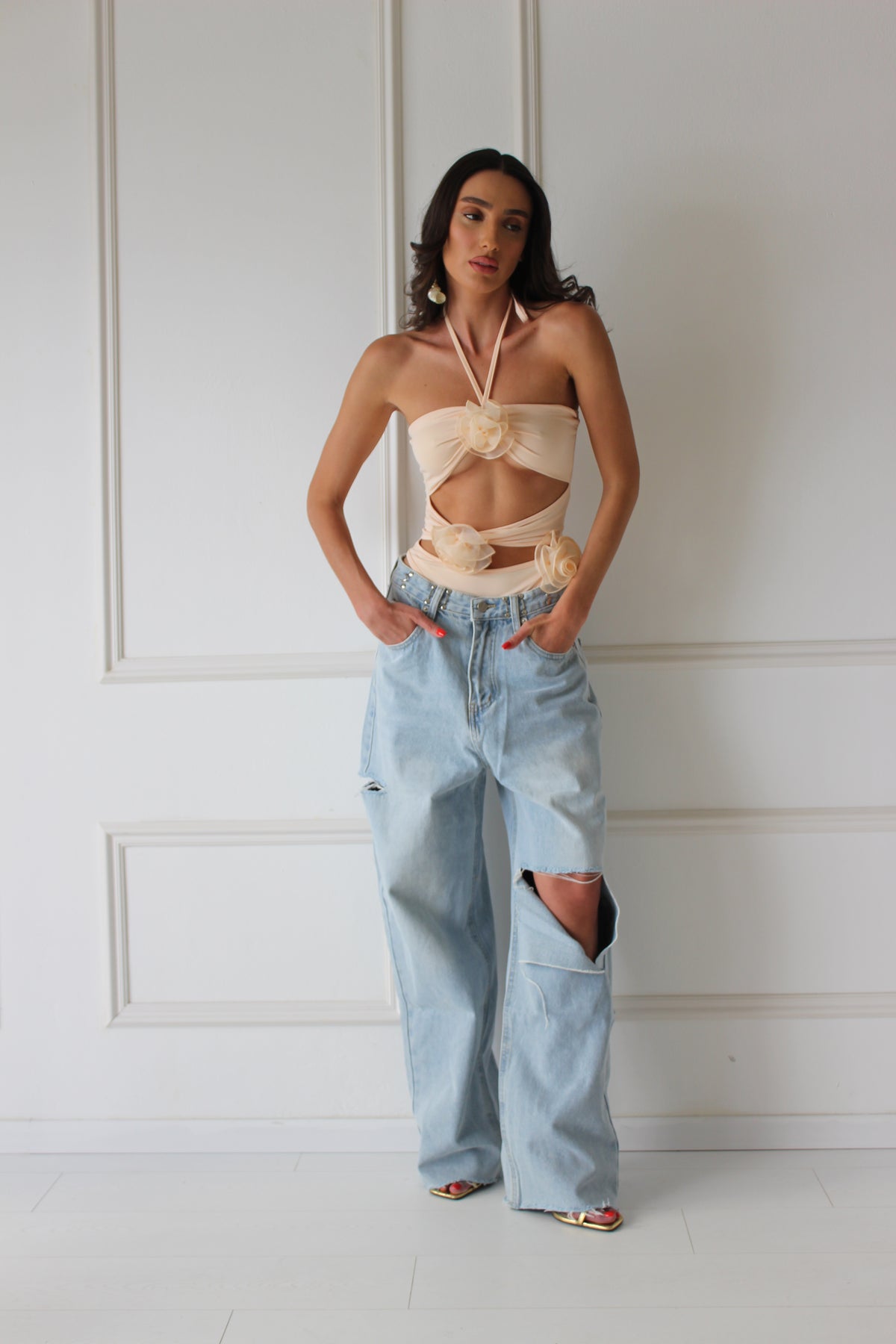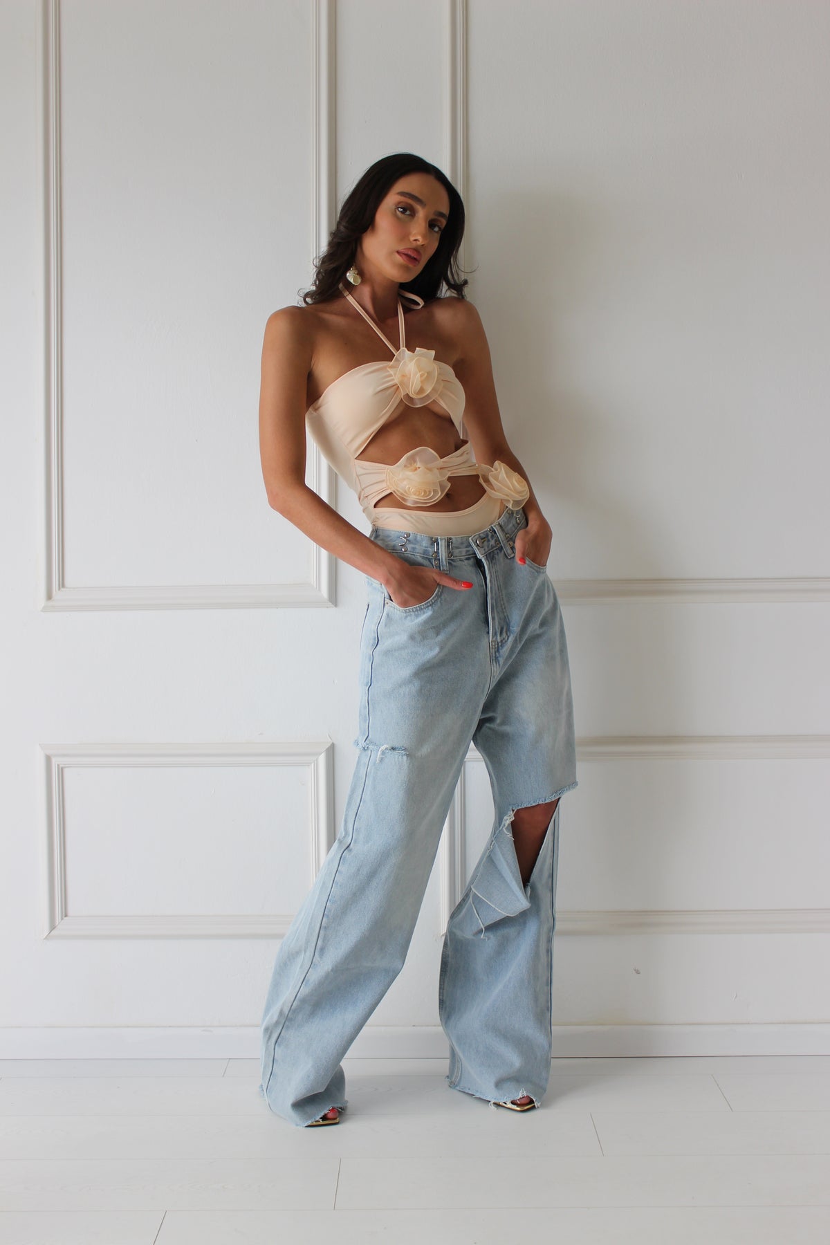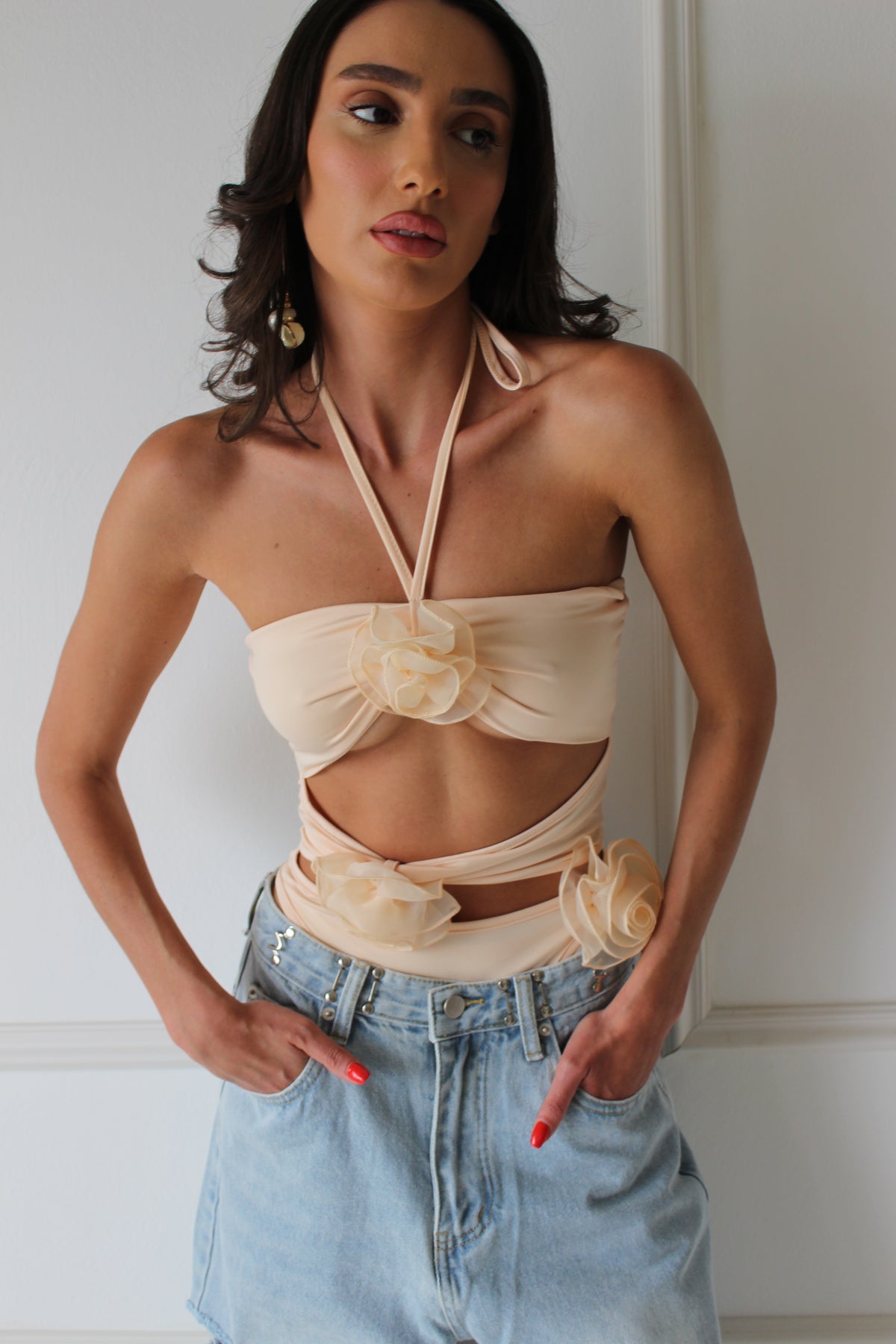 בגד גוף עם קשירה בצוואר ופתחי קאט אאוט היסטריים מקדימה, 3 עיטורי פרחים גדולים וסגירת טיק טק