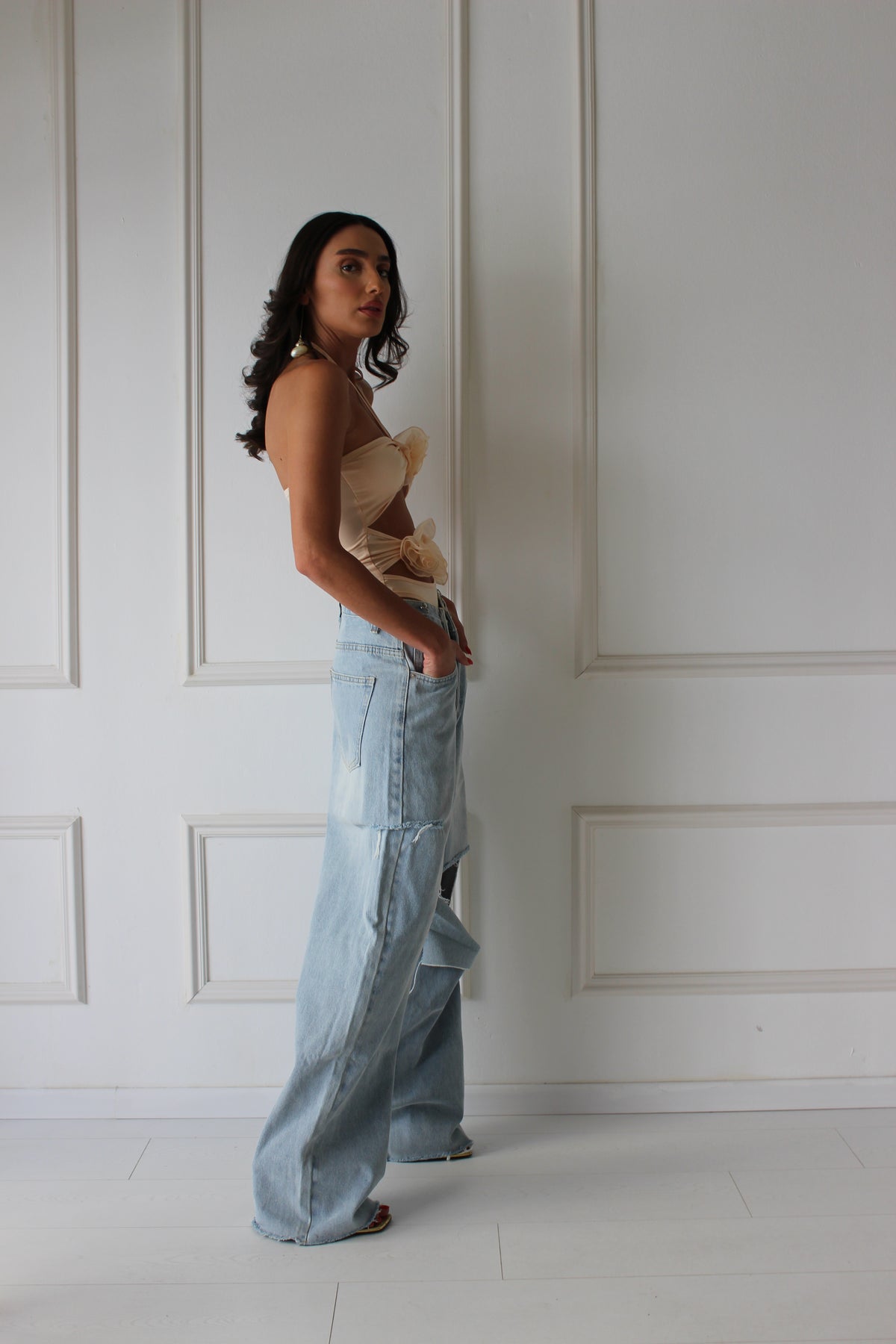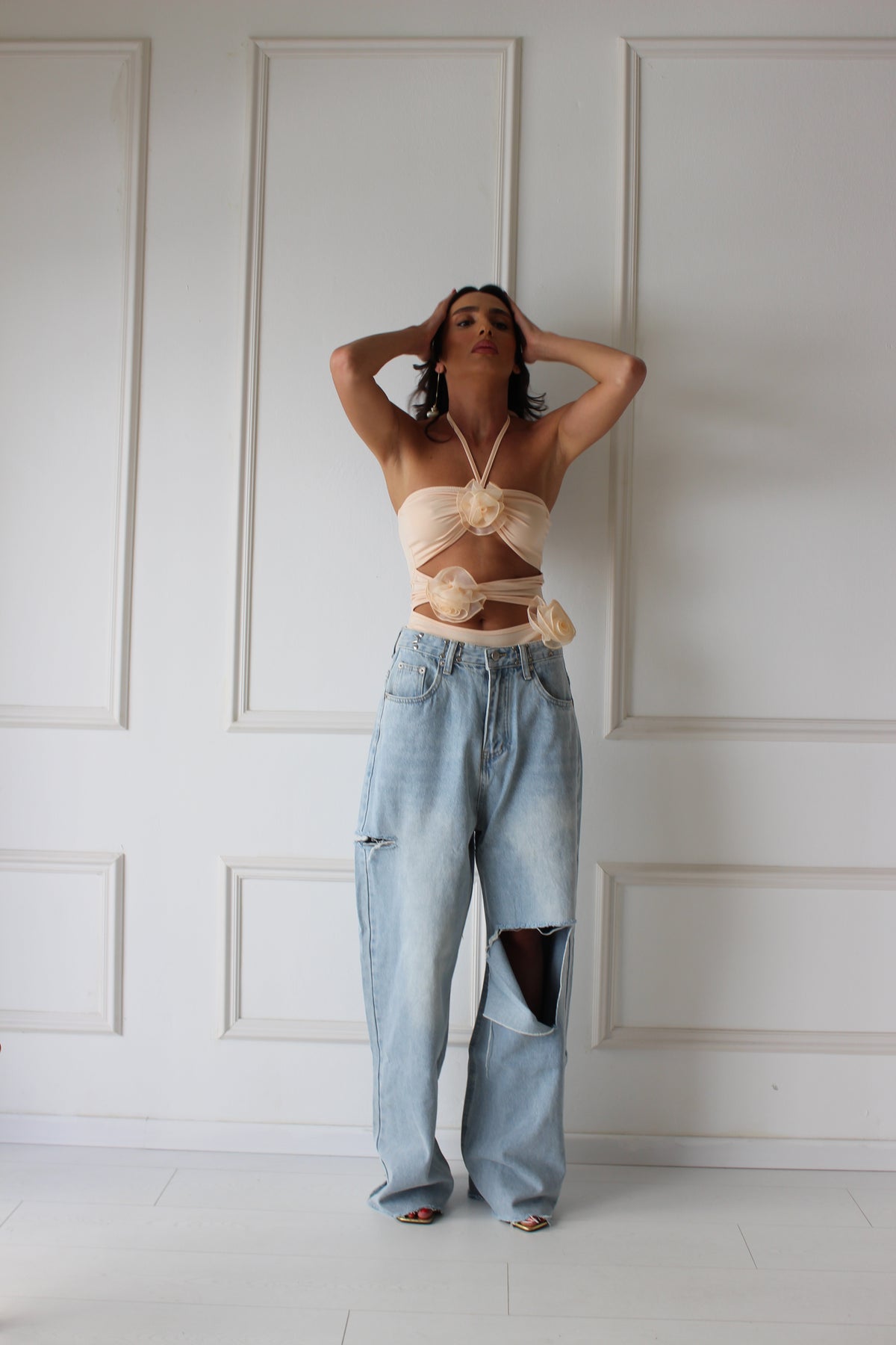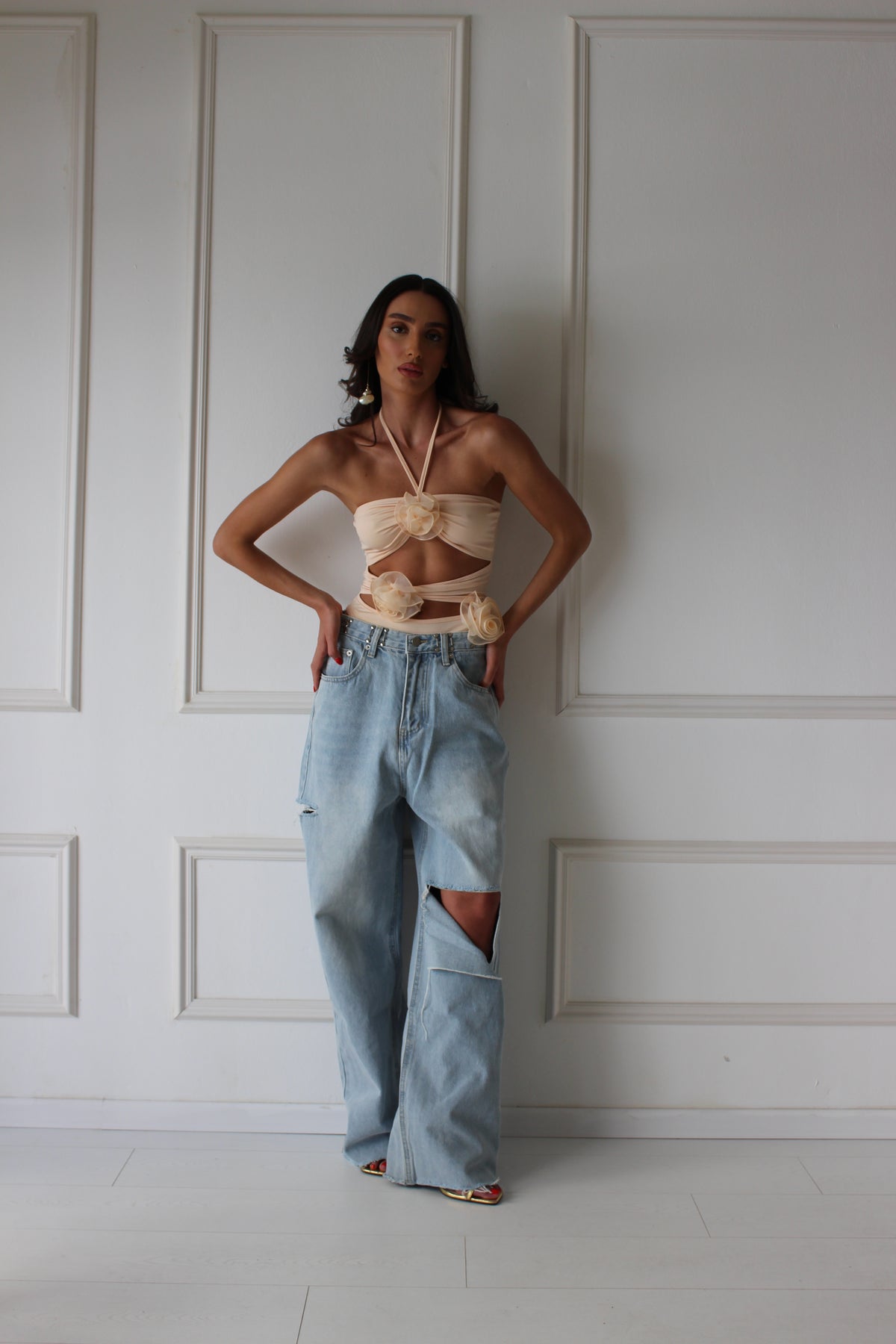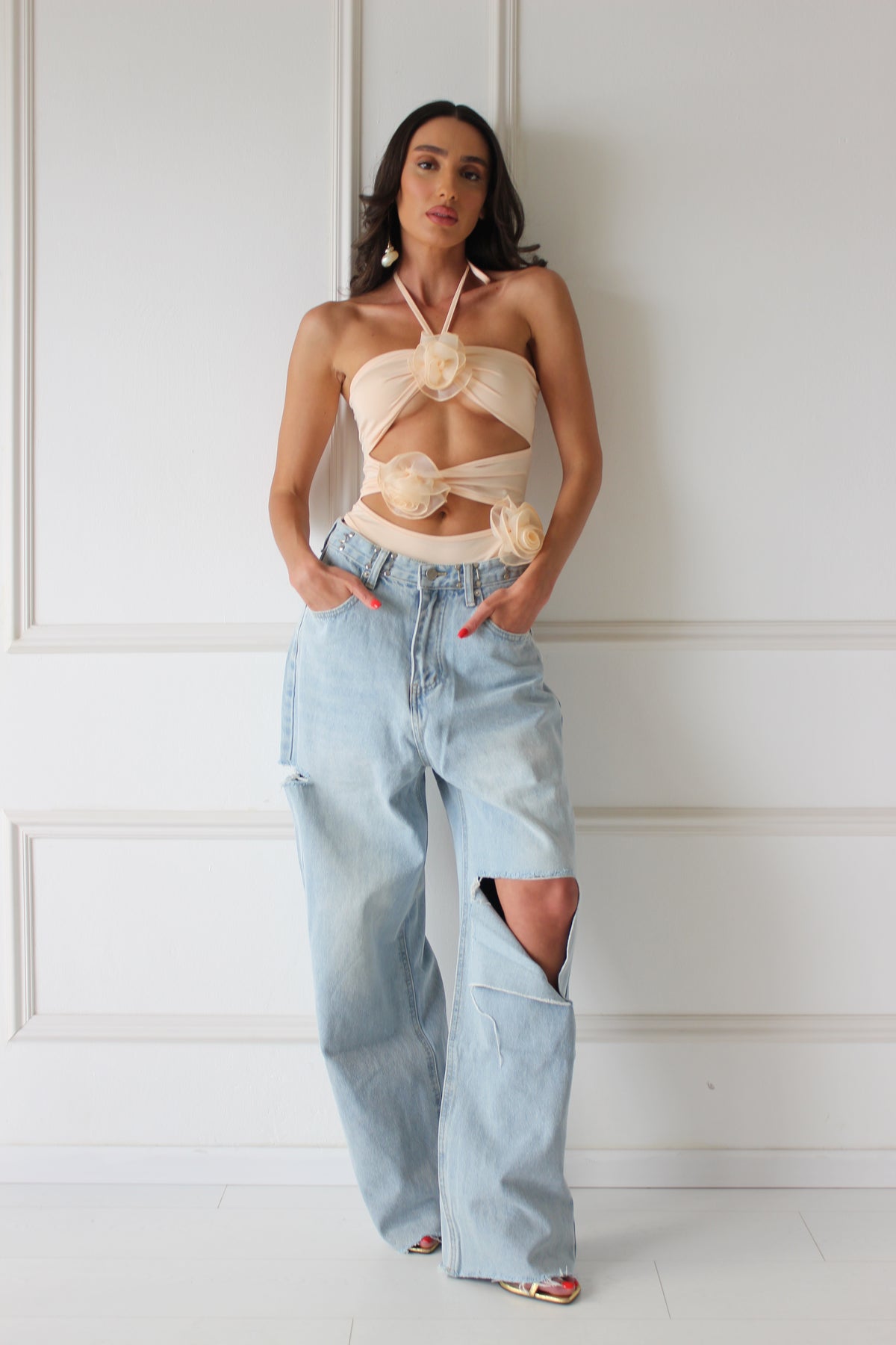 בגד גוף עם קשירה בצוואר ופתחי קאט אאוט היסטריים מקדימה, 3 עיטורי פרחים גדולים וסגירת טיק טק