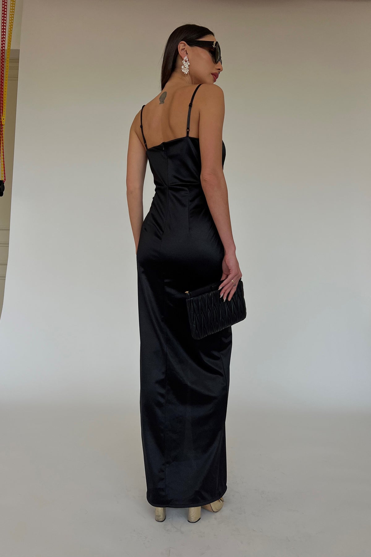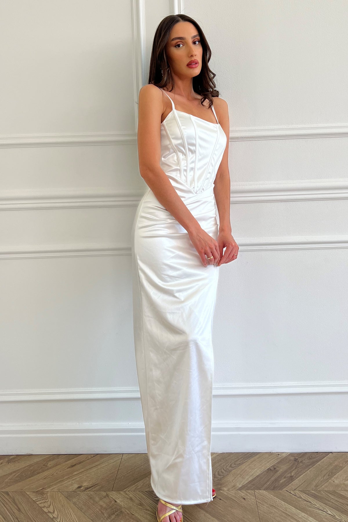 שמלת ערב קסומה מבד חלק ומבריק באורך מקסי, כתפיות דקות, מפתח צוואר מרובע, תיפורים מודגשים בחלק העליון ושסע עדין בחלק התחתון