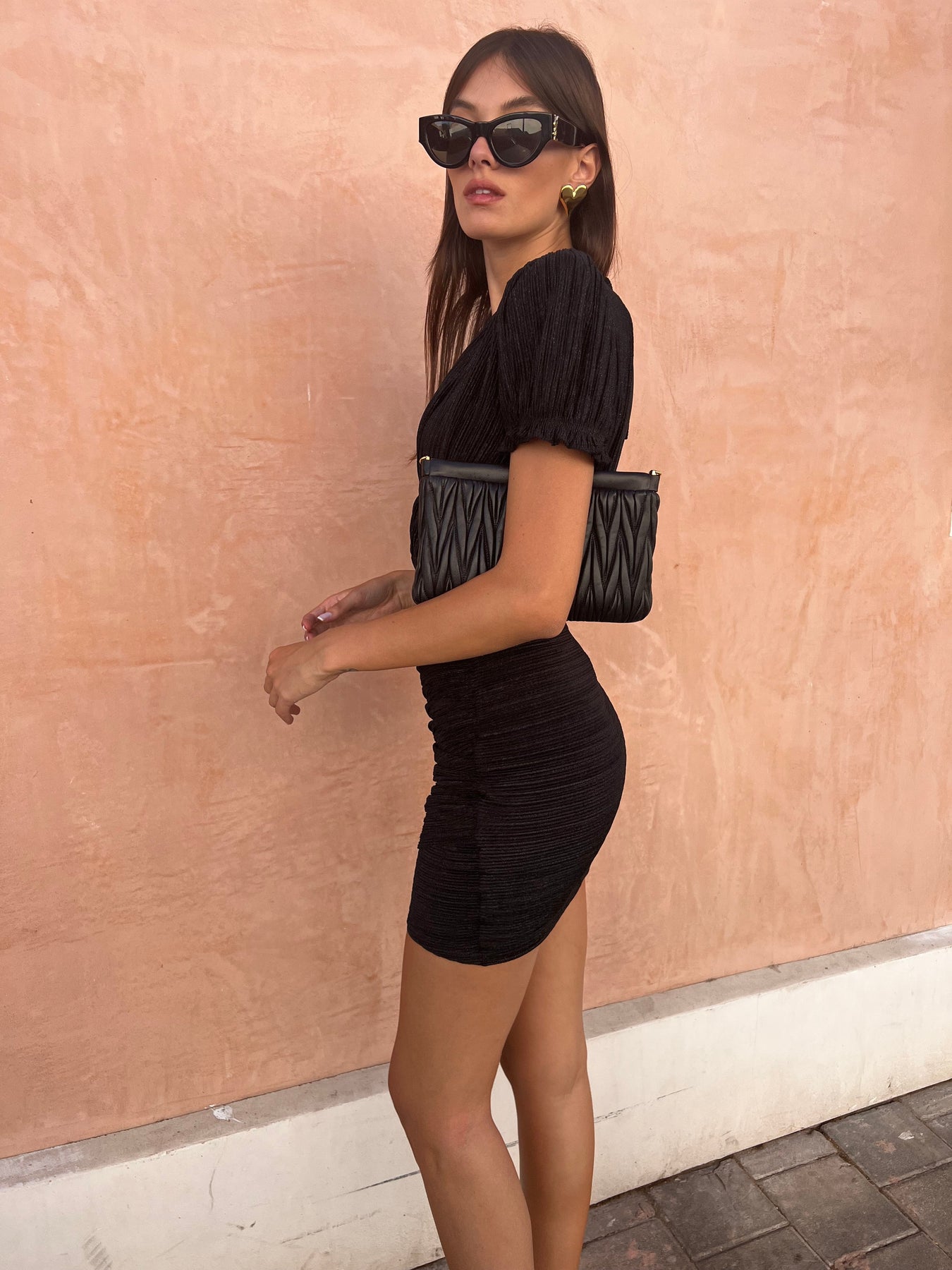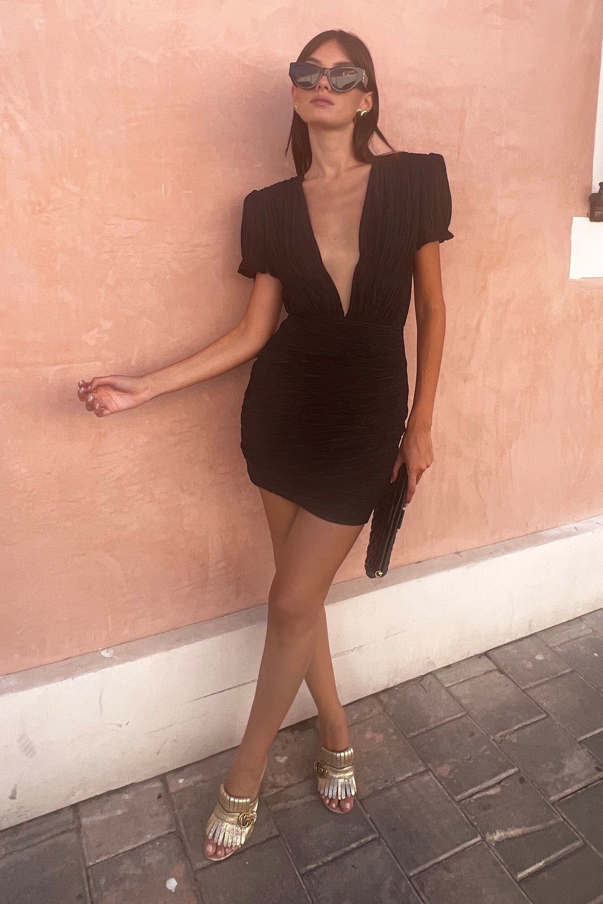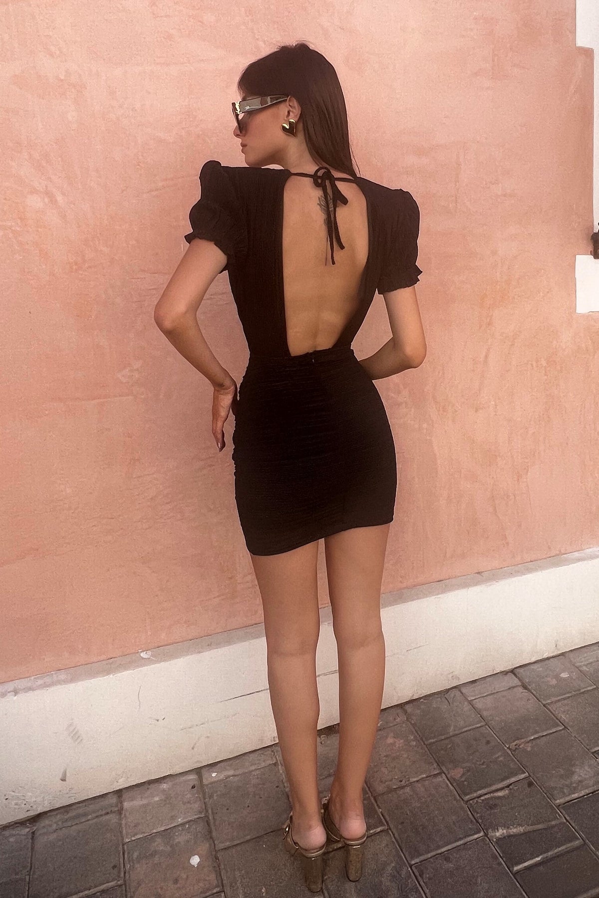שמלה קצרה נשית ואלגנטית עם שרוולים קצרים מנופחים מעט, כיווצים ומחשוף עמוק