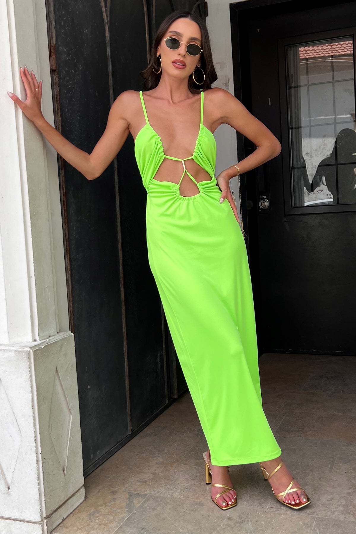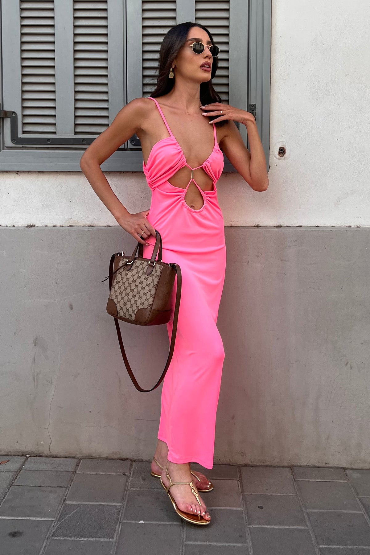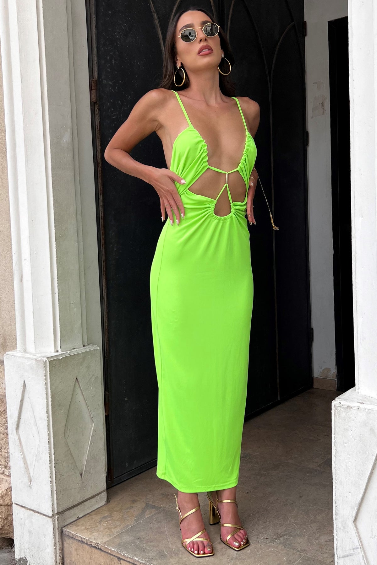שמלה באורך מקסי עם פתחי קאט אאוט היסטריים, מחשוף עמוק וכתפיות דקות