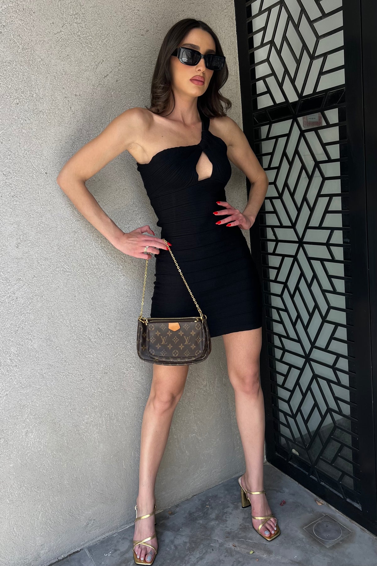 שמלה קצרה צמודה ומחמיאה לגוף בגזרת וואן שולדר, כתפייה מעט עבה עם טוויסט ופתח קאט אאוט מהפנט באזור החזה