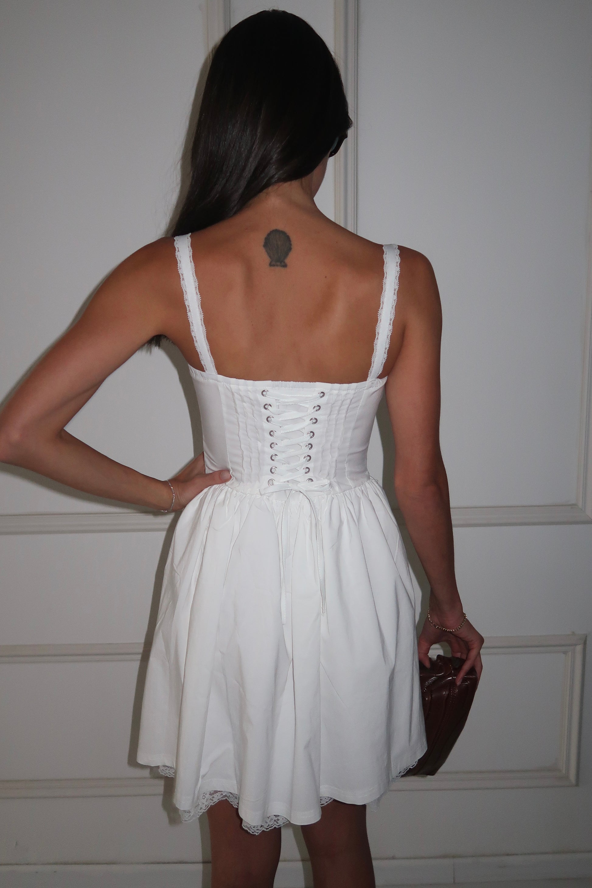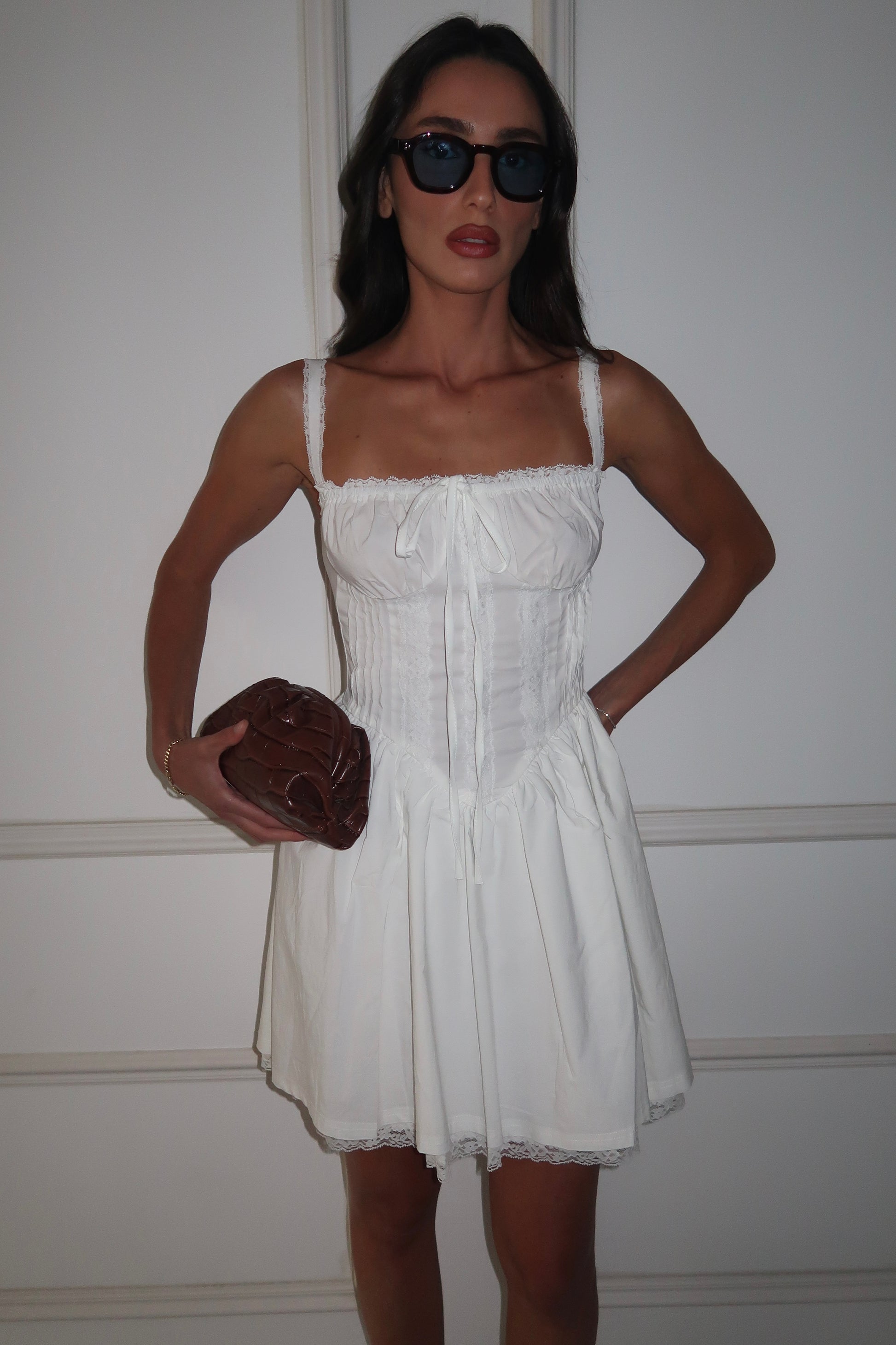 השמלה שכל תשומת הלב עליה. מיני לבנה בגזרת מחוך רכה – חגיגית, נועזת ומדויקת. 🤍