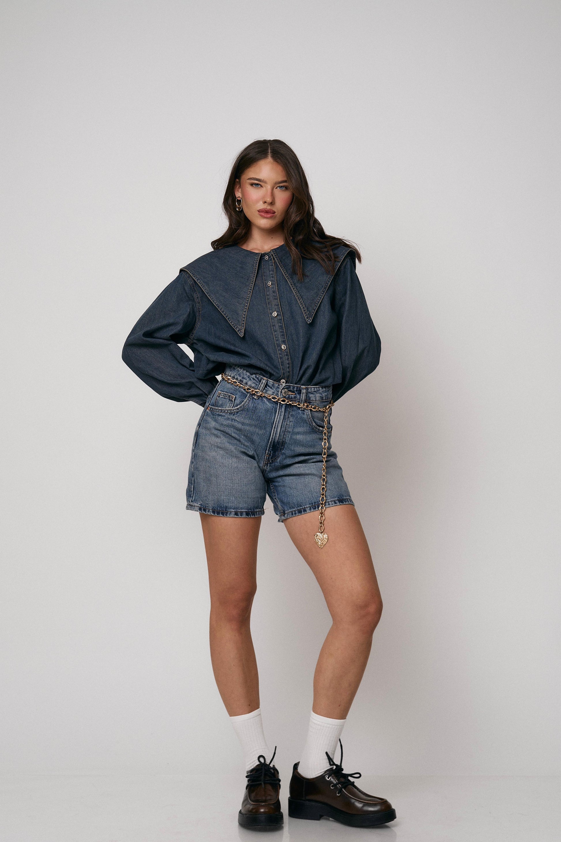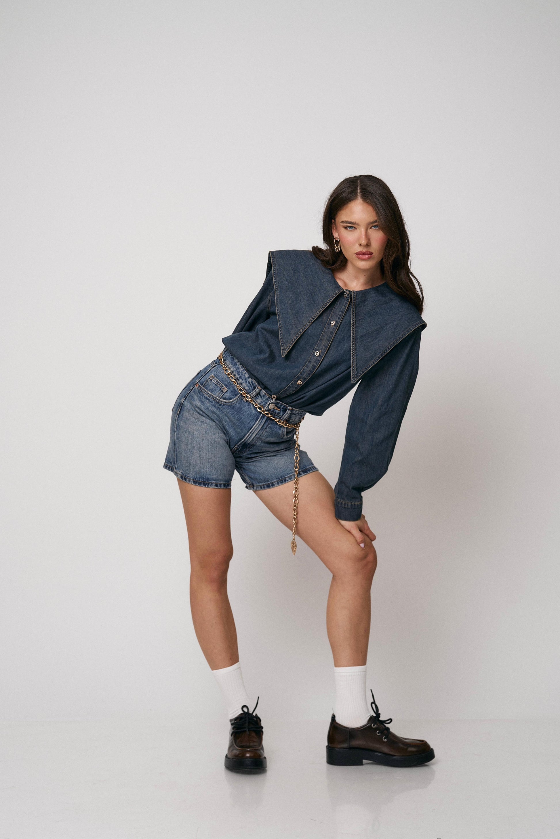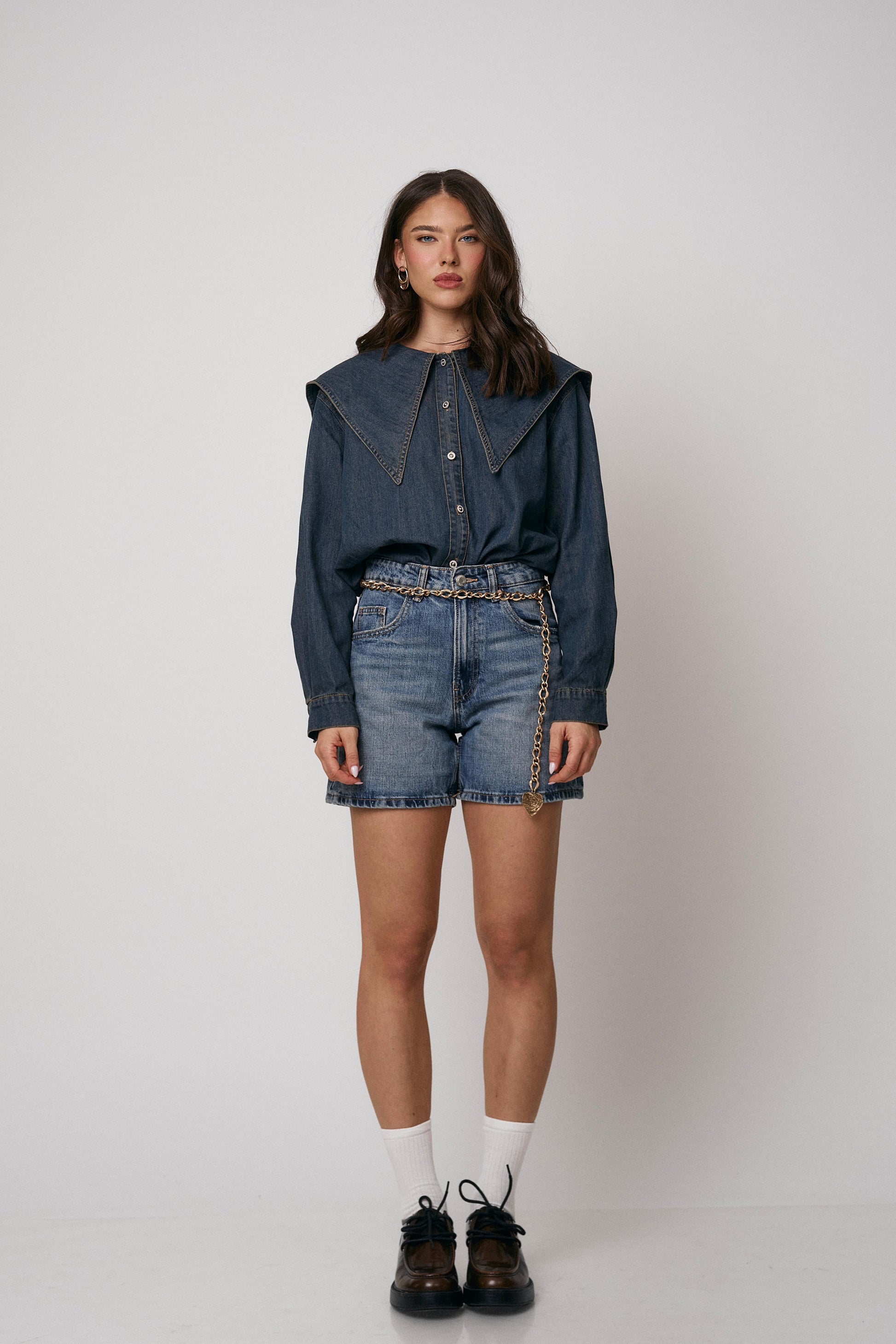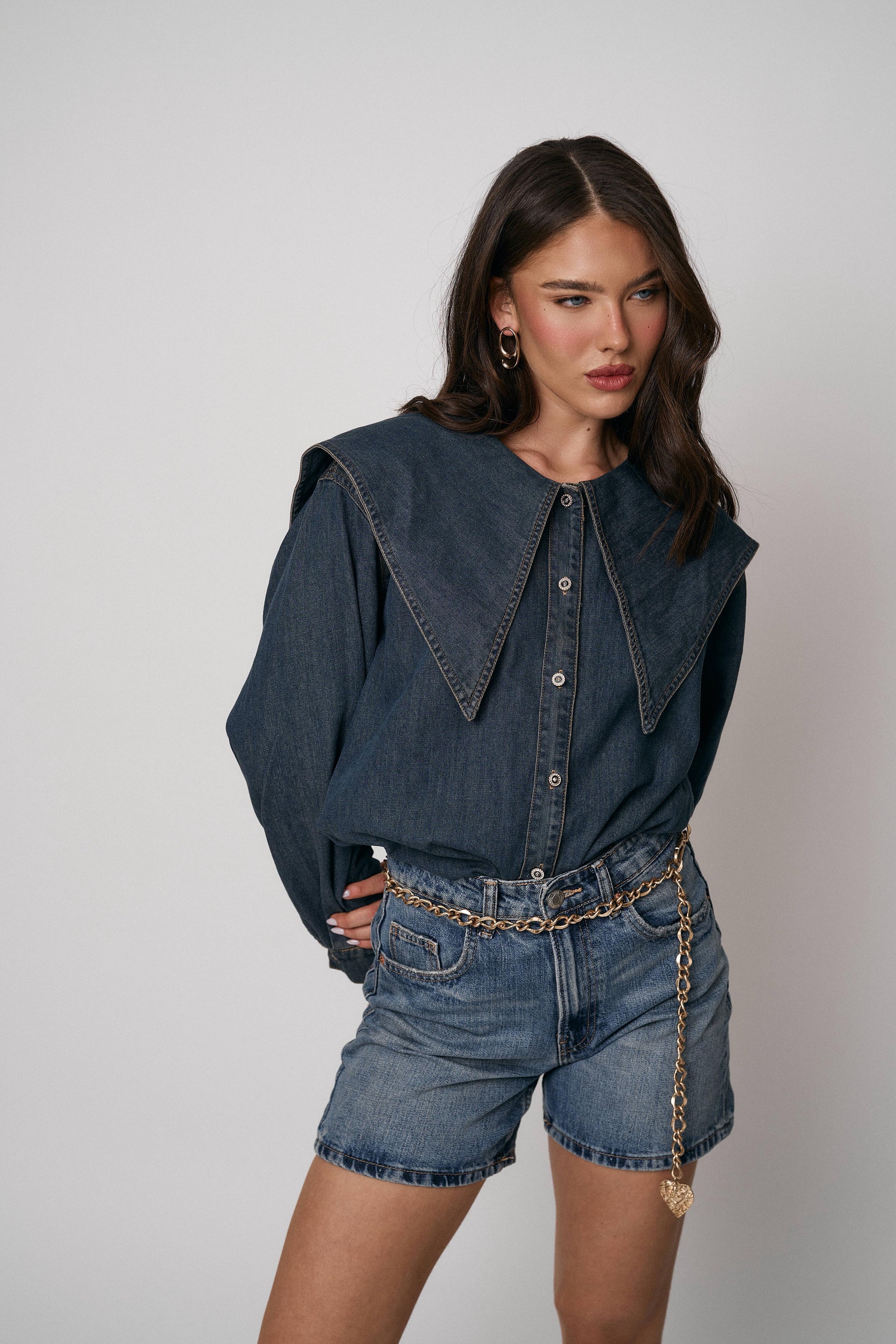 חולצת דנים ייחודית עם צווארון גדול ומודגש, גזרה משוחררת ומדויקת לסטייל אורבני וצעיר