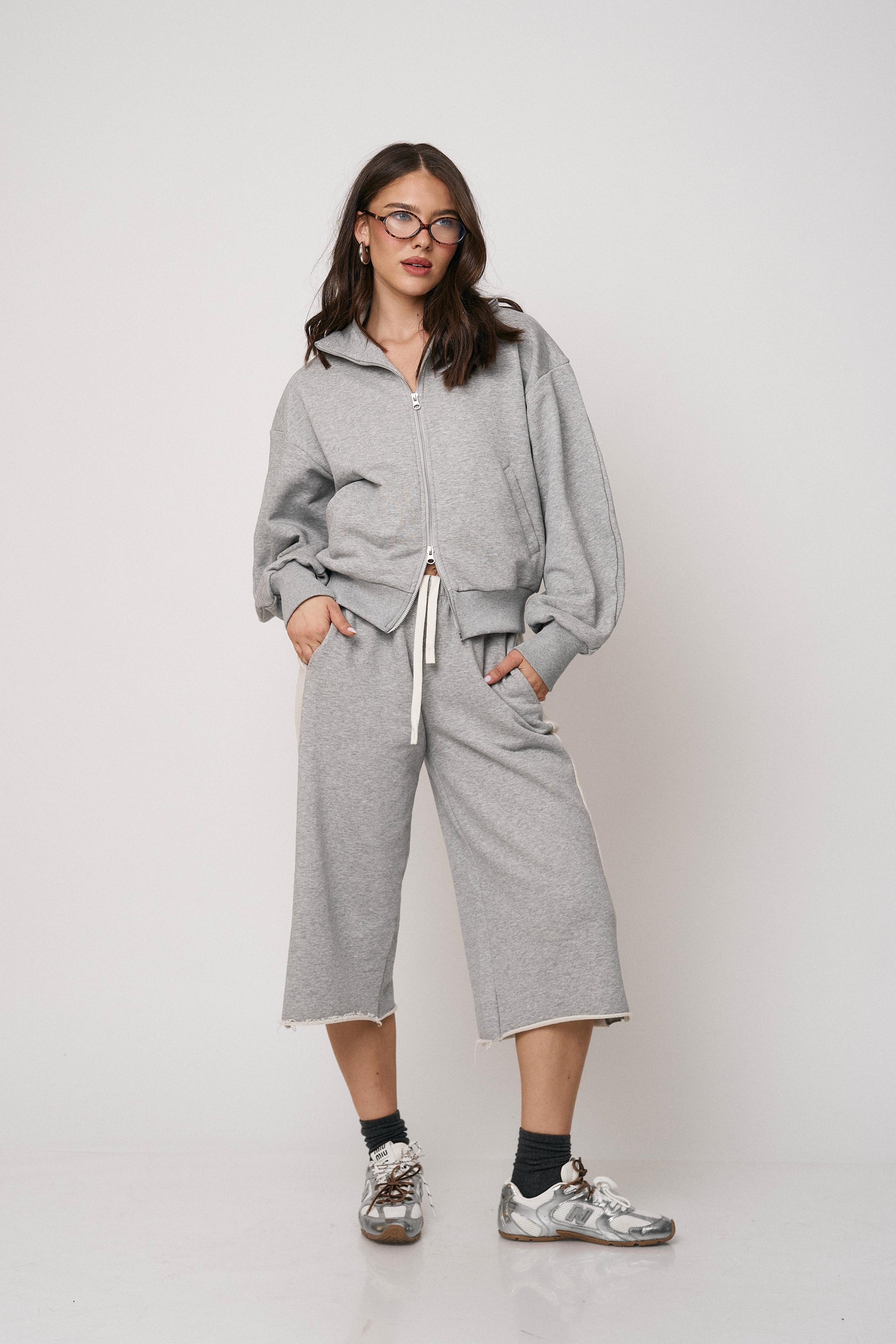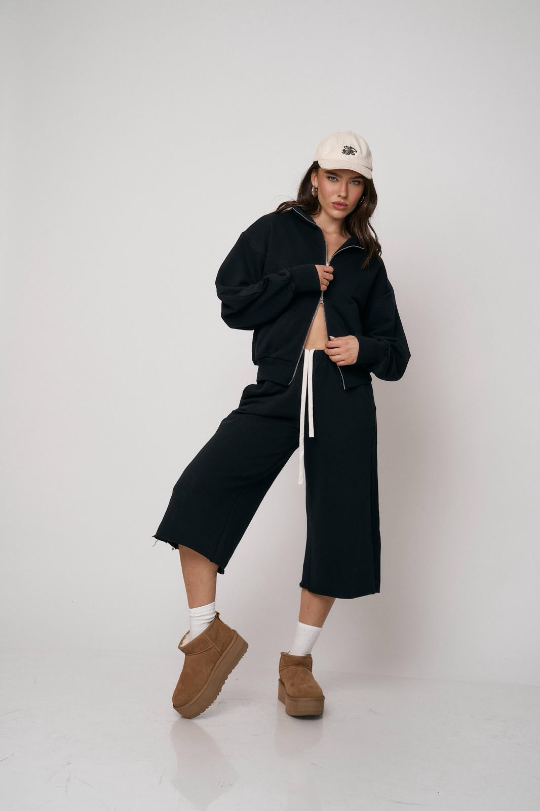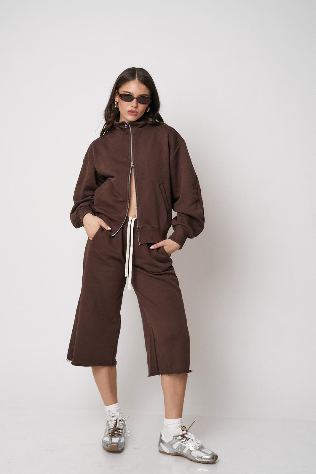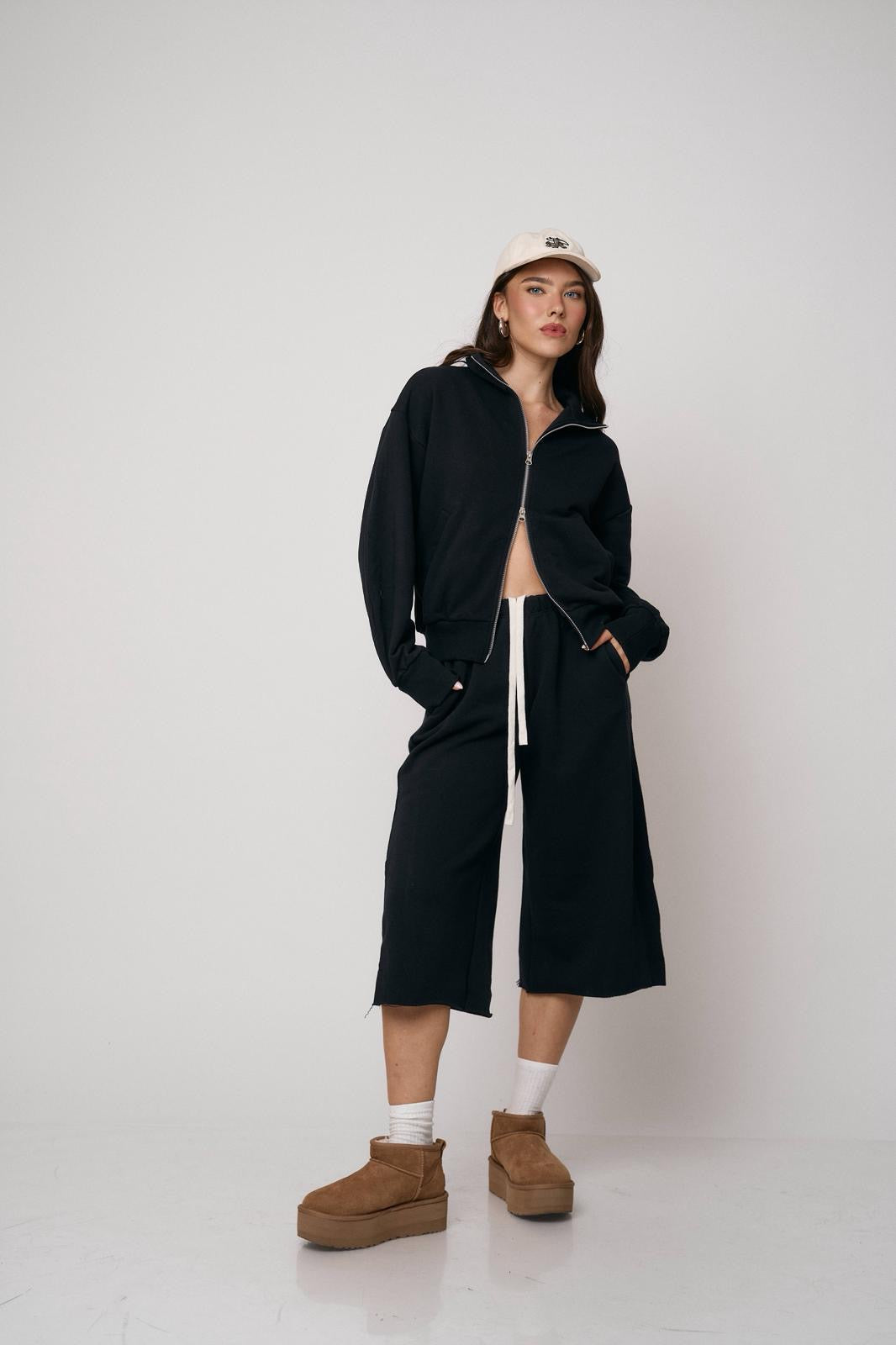 סט נוח ומחמיא הכולל ז’קט עם רוכסן וסרגלים רחבים. שילוב מושלם של נוחות וסטייל מודרני ליום-יום
