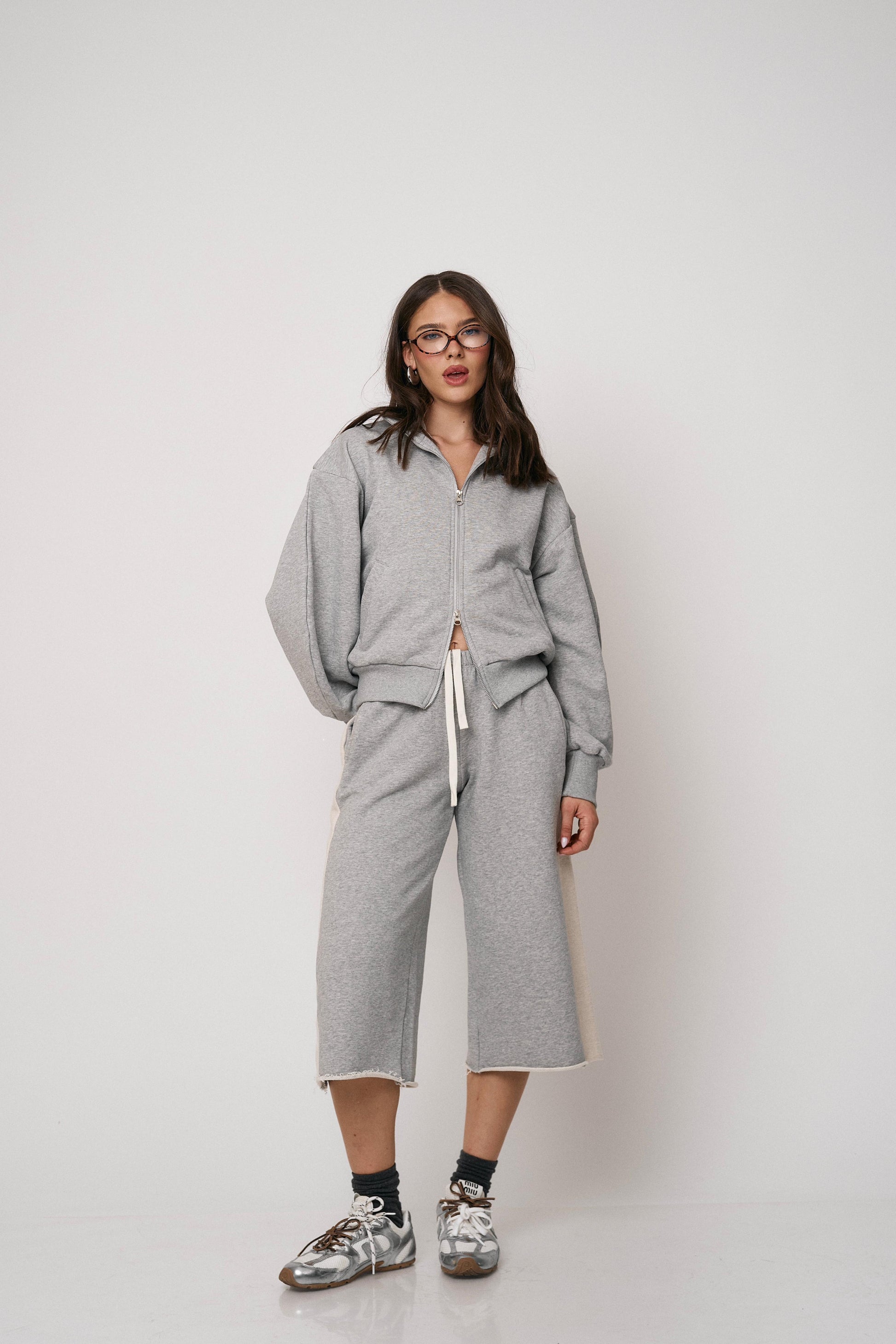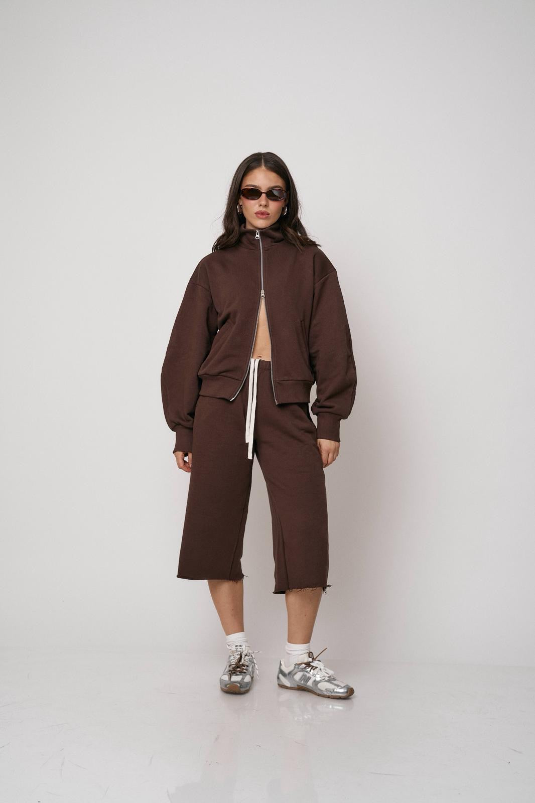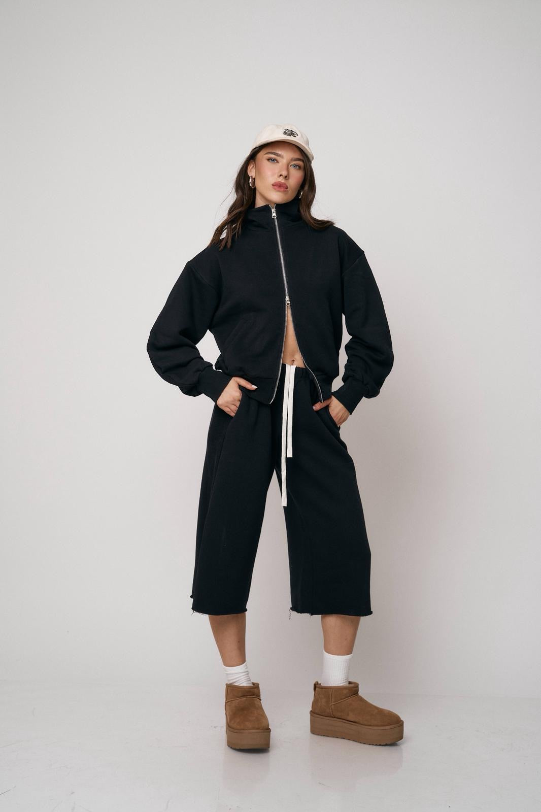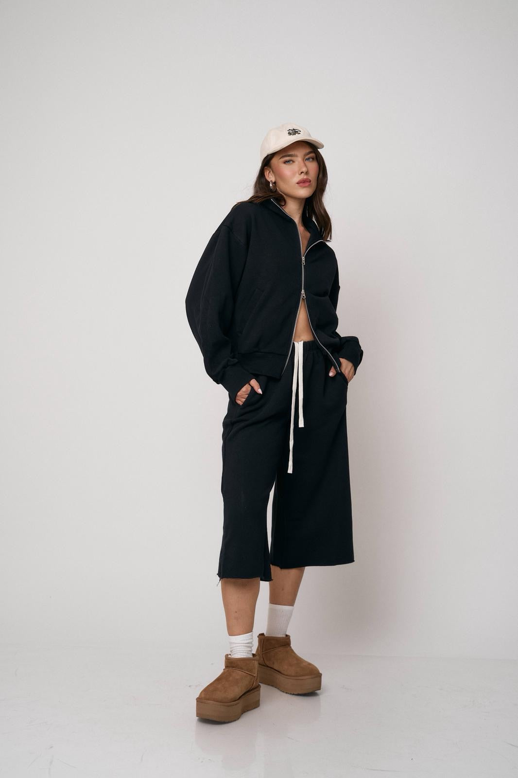 סט נוח ומחמיא הכולל ז’קט עם רוכסן וסרגלים רחבים. שילוב מושלם של נוחות וסטייל מודרני ליום-יום