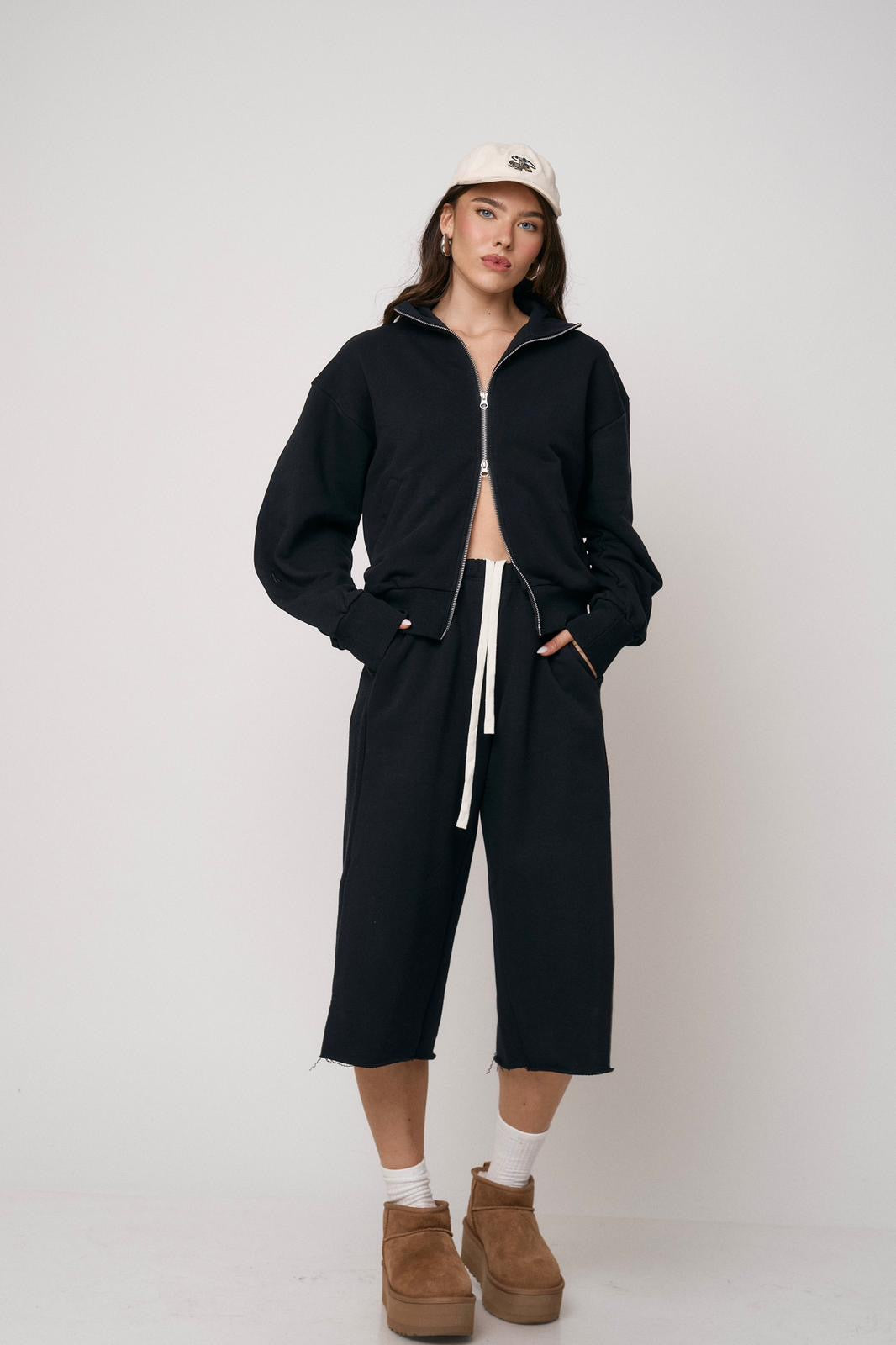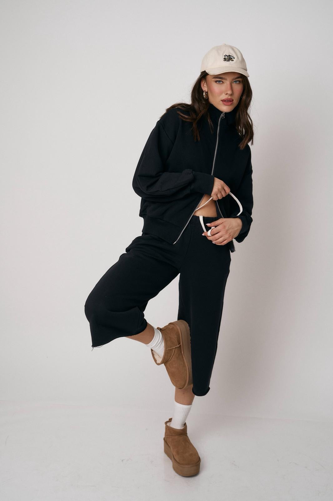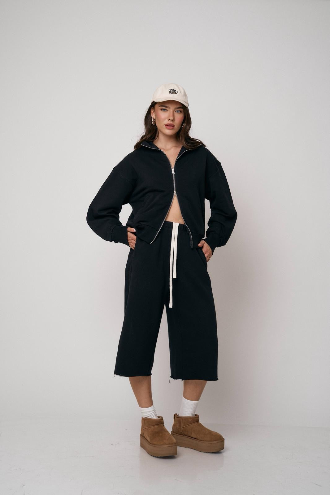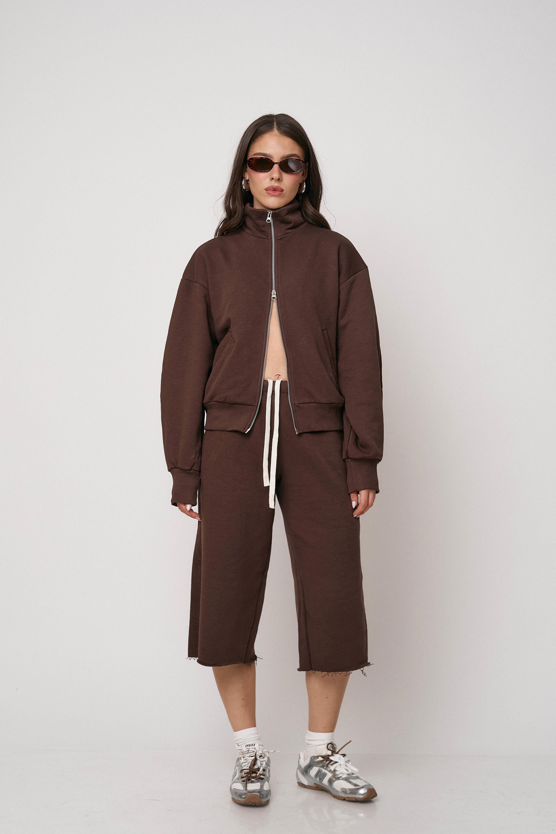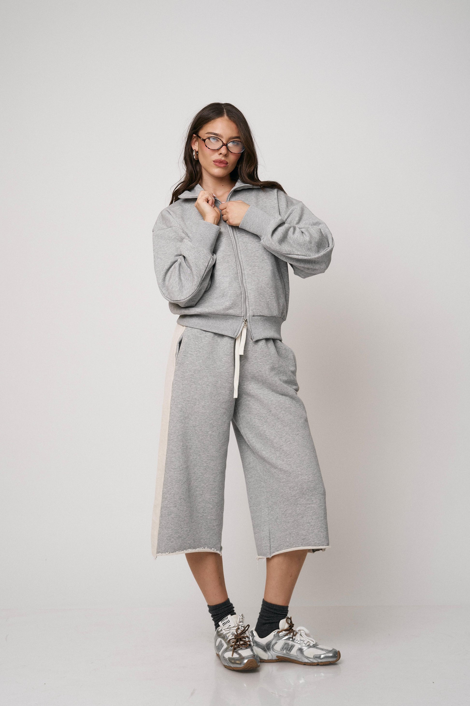 סט נוח ומחמיא הכולל ז’קט עם רוכסן וסרגלים רחבים. שילוב מושלם של נוחות וסטייל מודרני ליום-יום