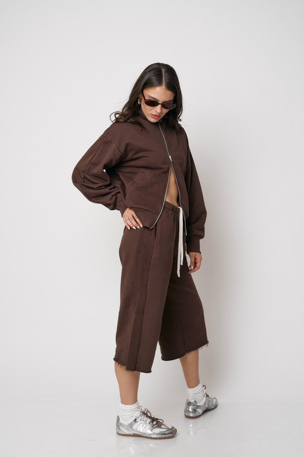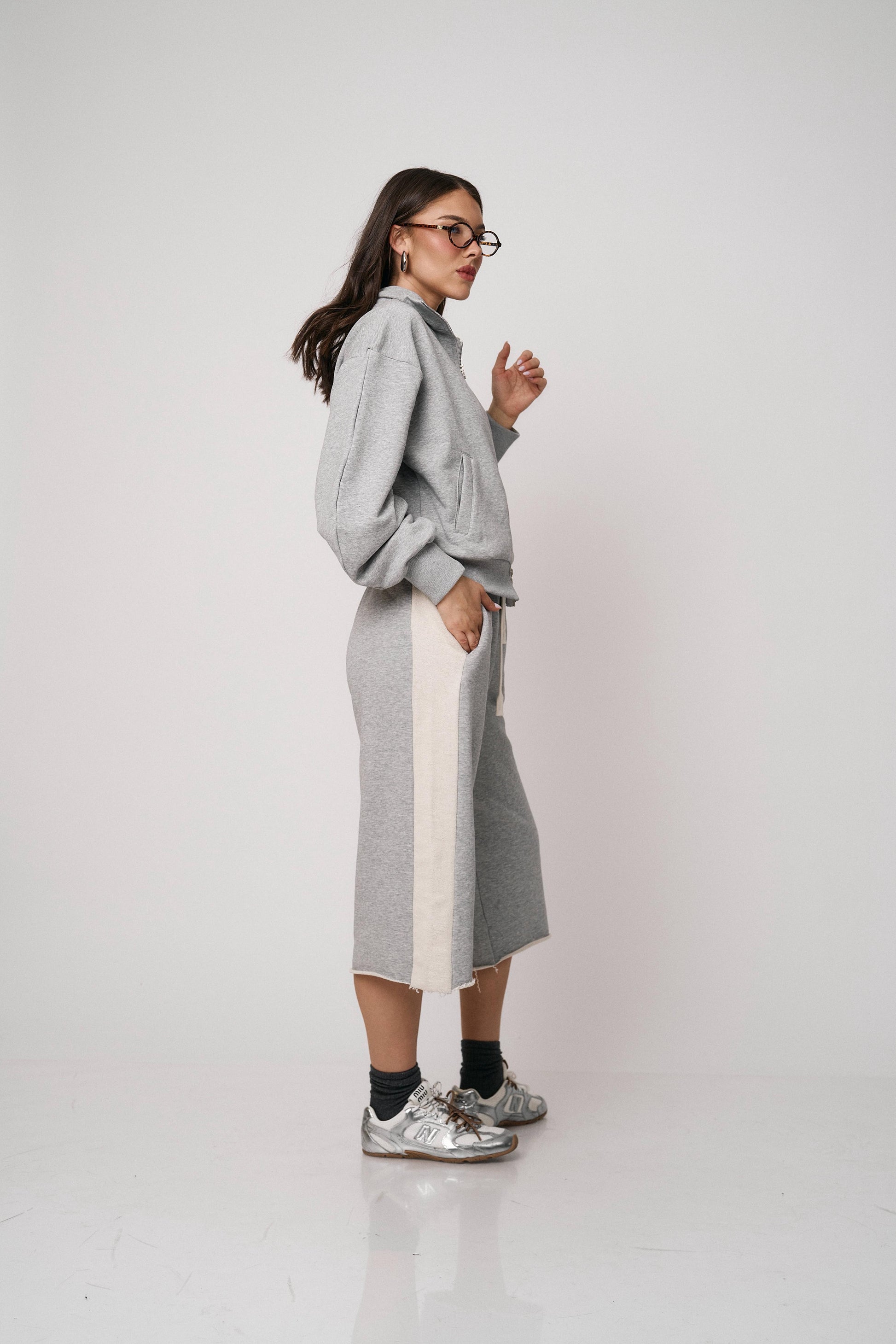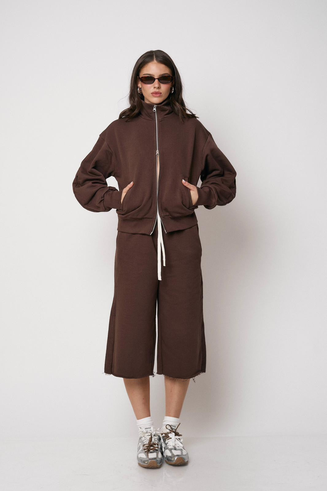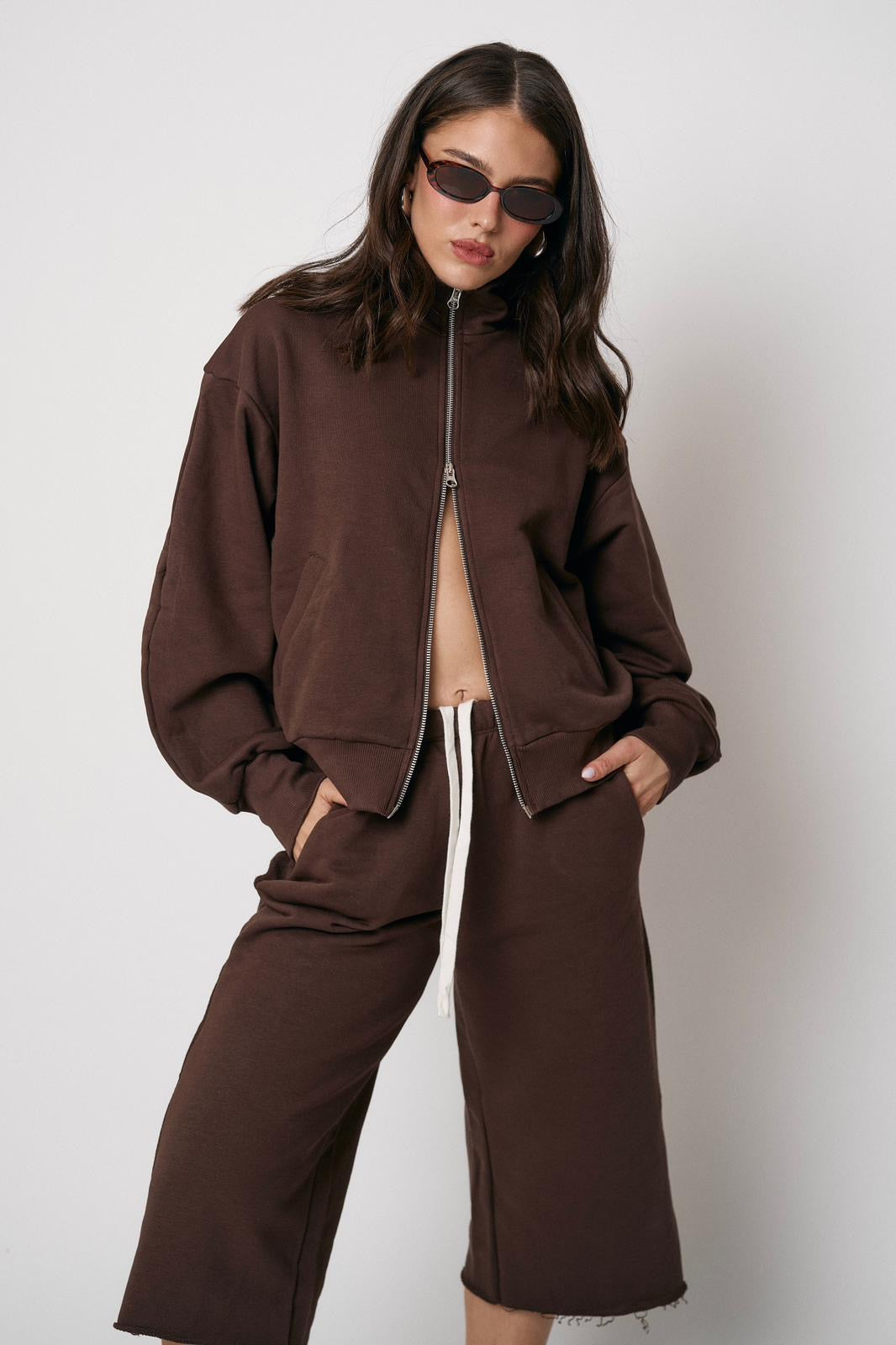 סט נוח ומחמיא הכולל ז’קט עם רוכסן וסרגלים רחבים. שילוב מושלם של נוחות וסטייל מודרני ליום-יום