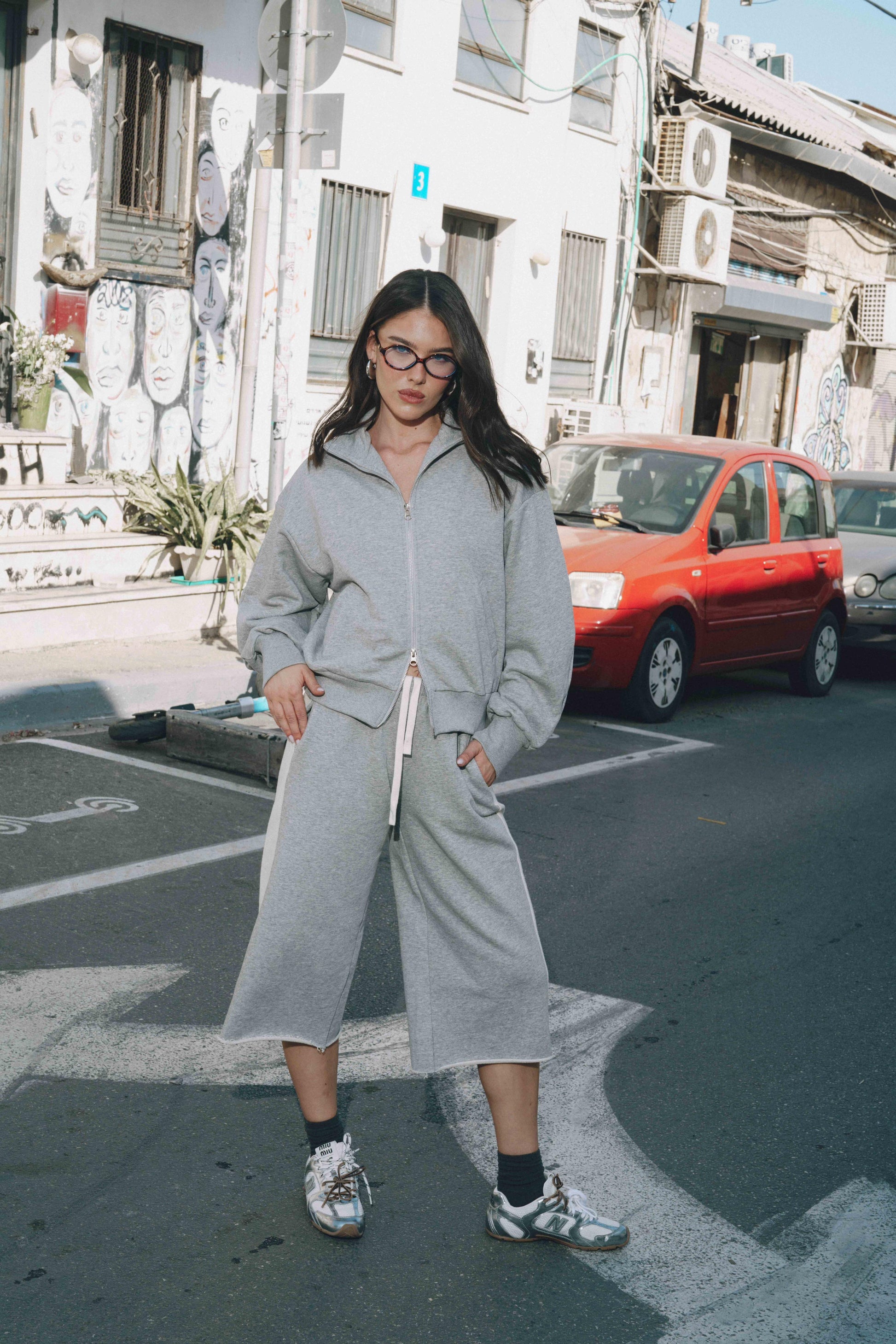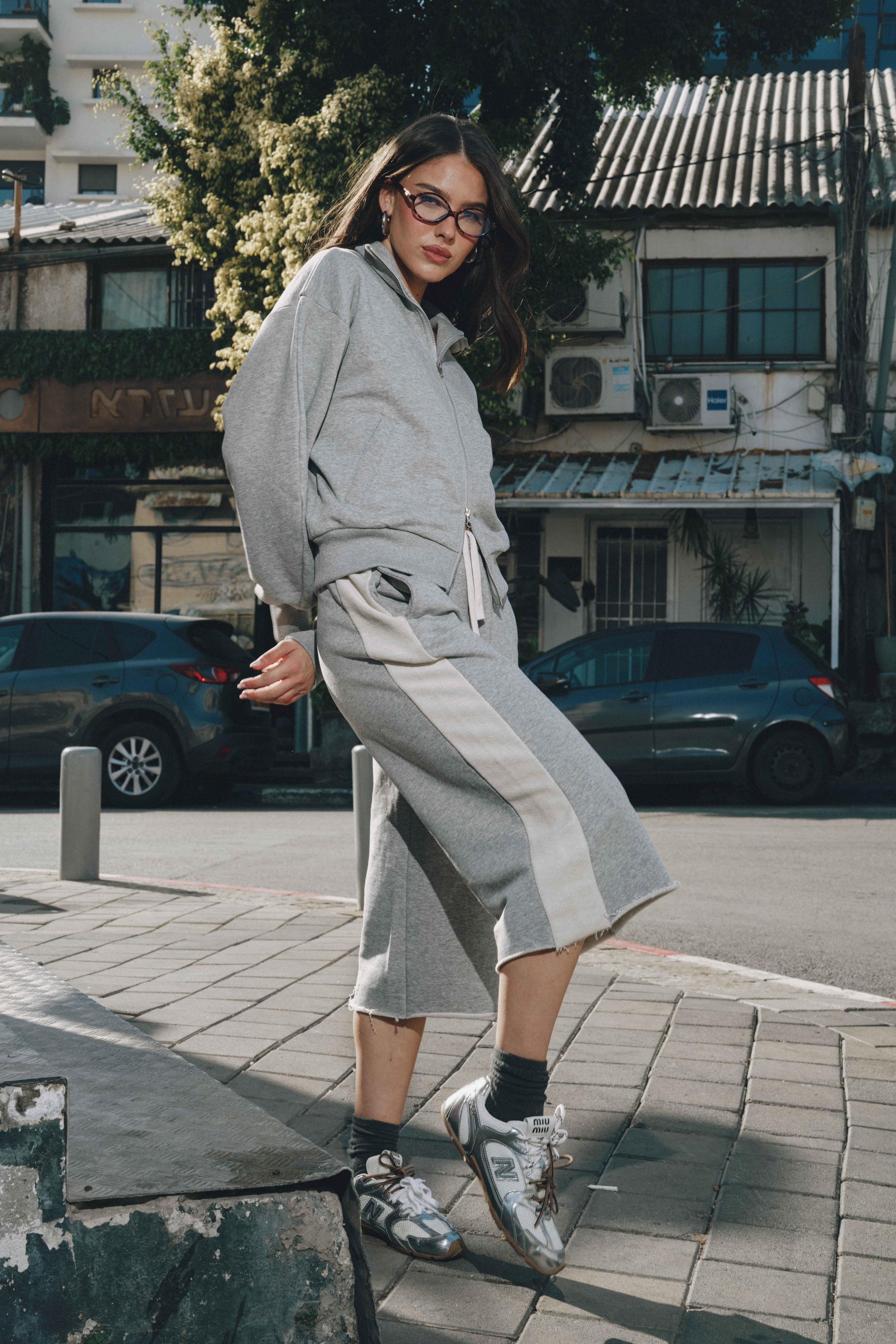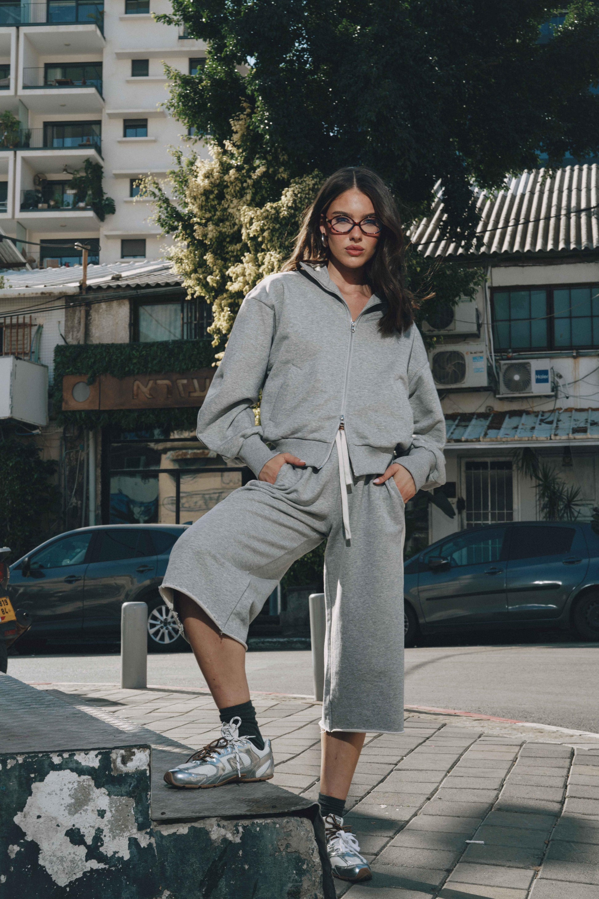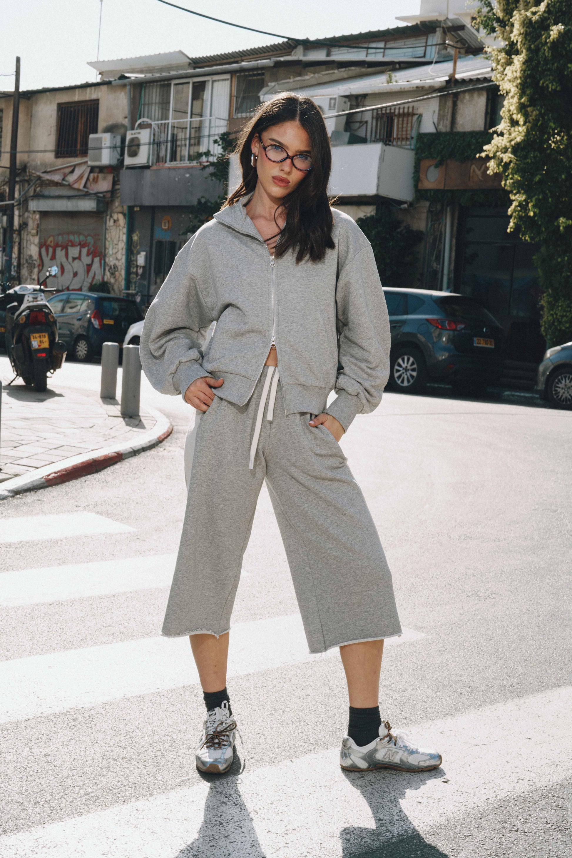 סט נוח ומחמיא הכולל ז’קט עם רוכסן וסרגלים רחבים. שילוב מושלם של נוחות וסטייל מודרני ליום-יום