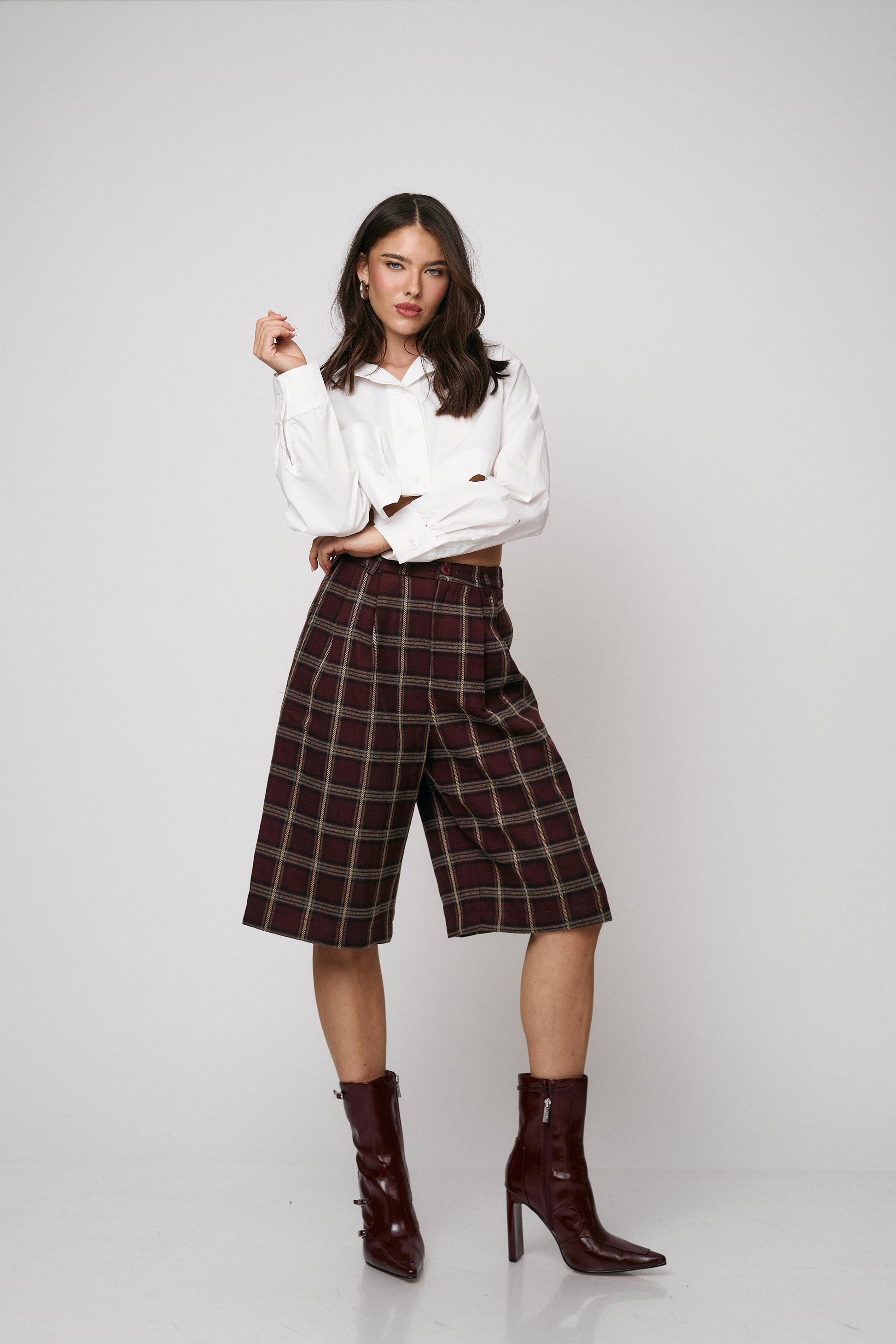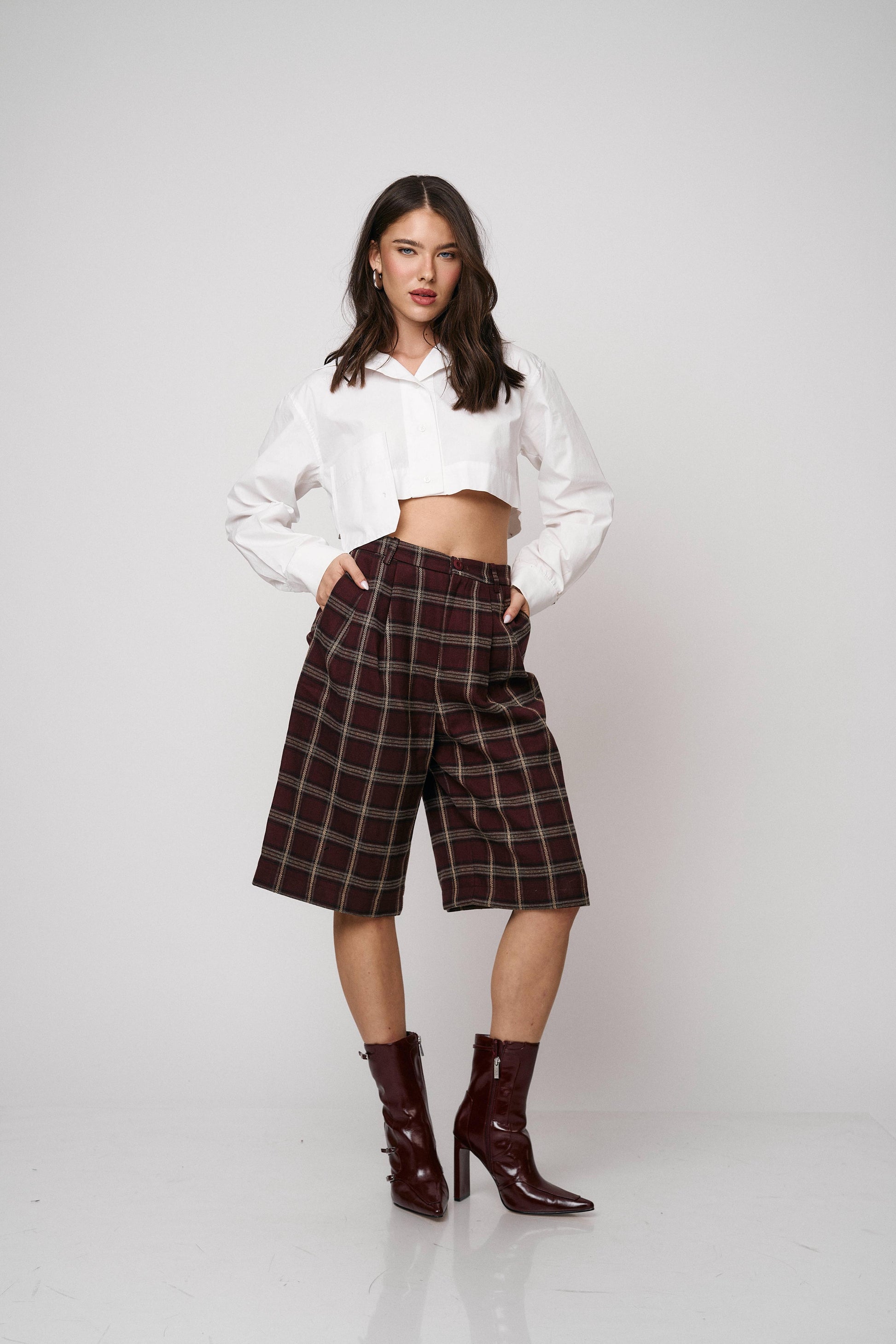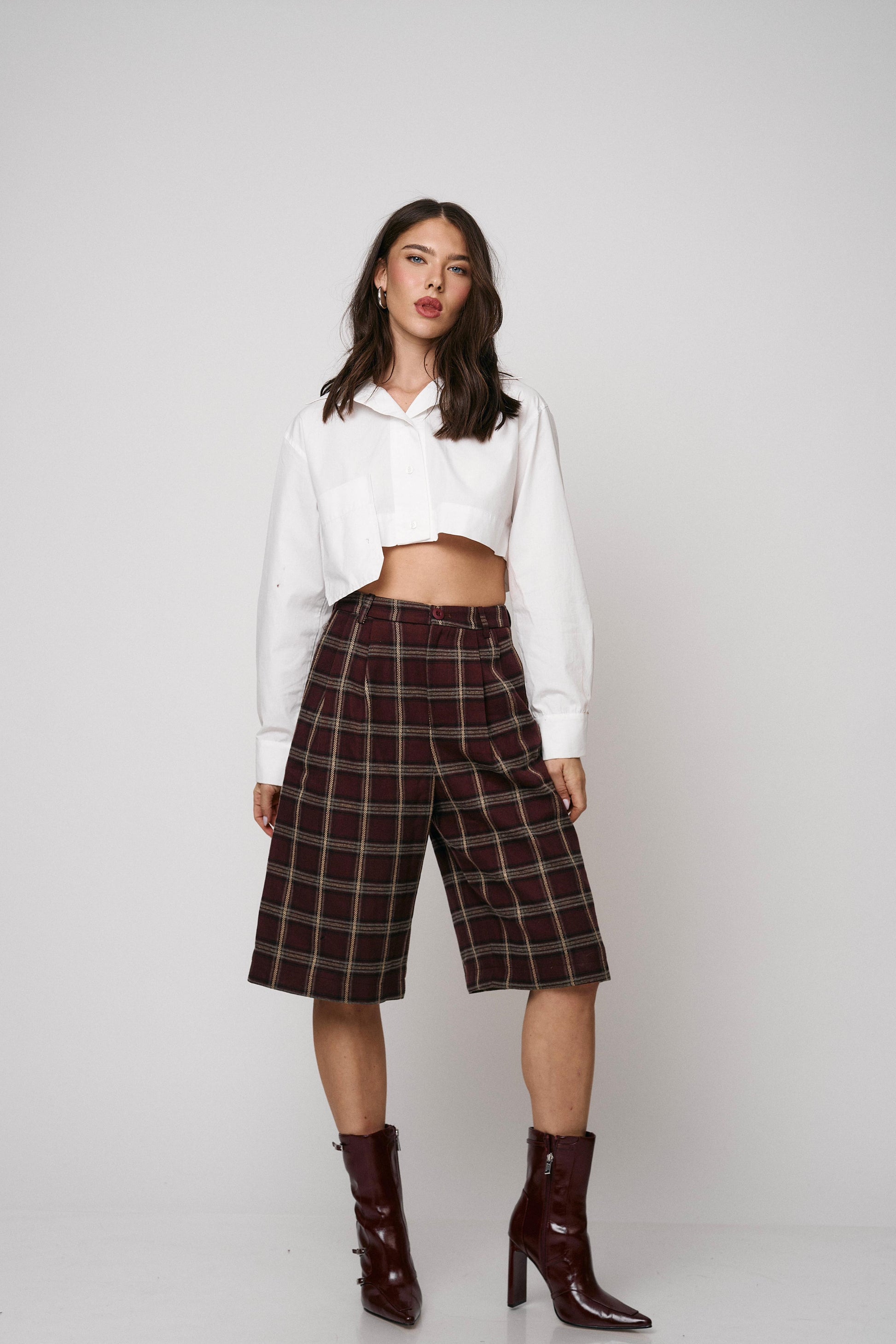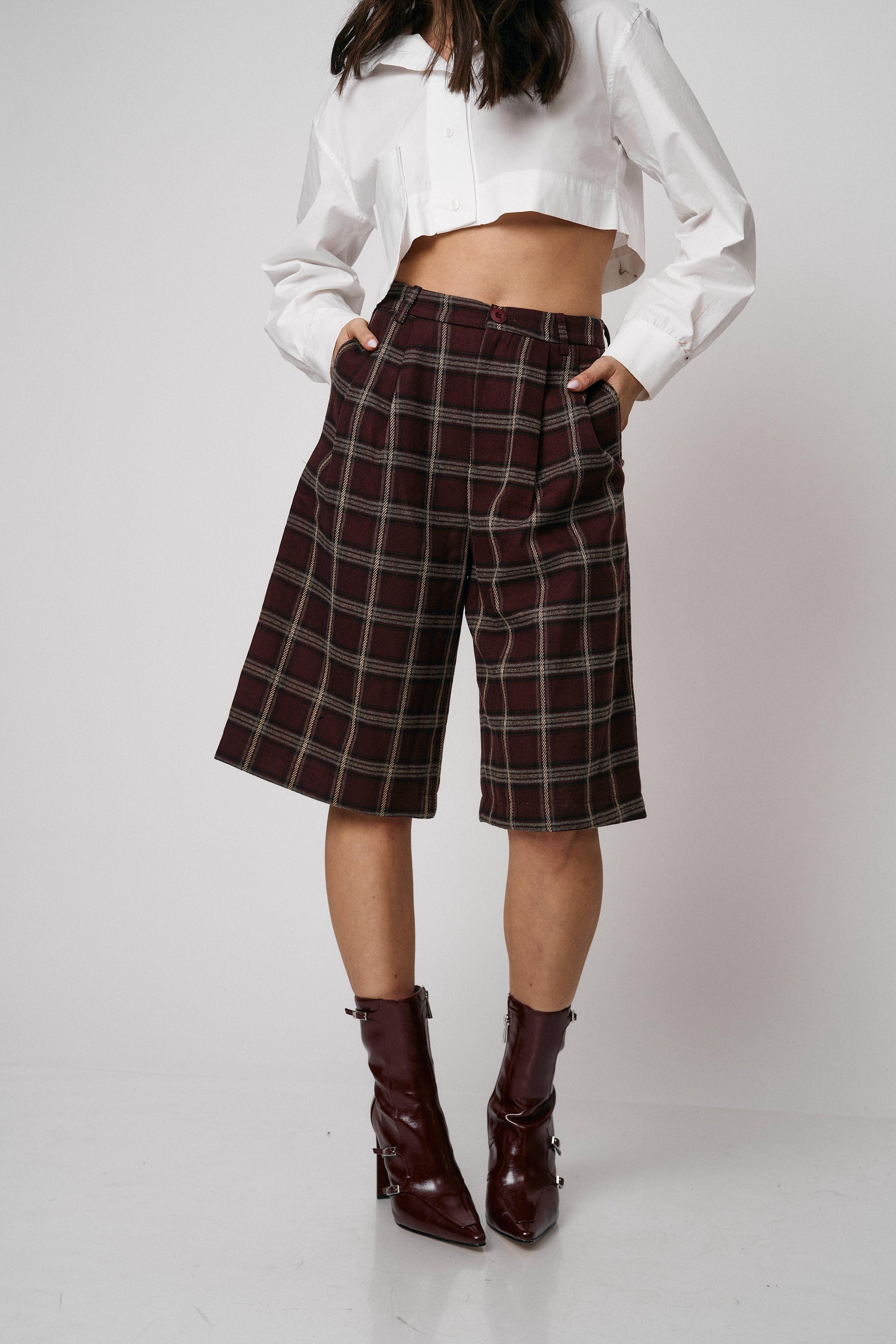 מכנס קלאסי בגזרת ברמודה עם הדפס משבצות מודרני. נוח, מחטב ומתאים ללוקים יום־יומיים או יציאה