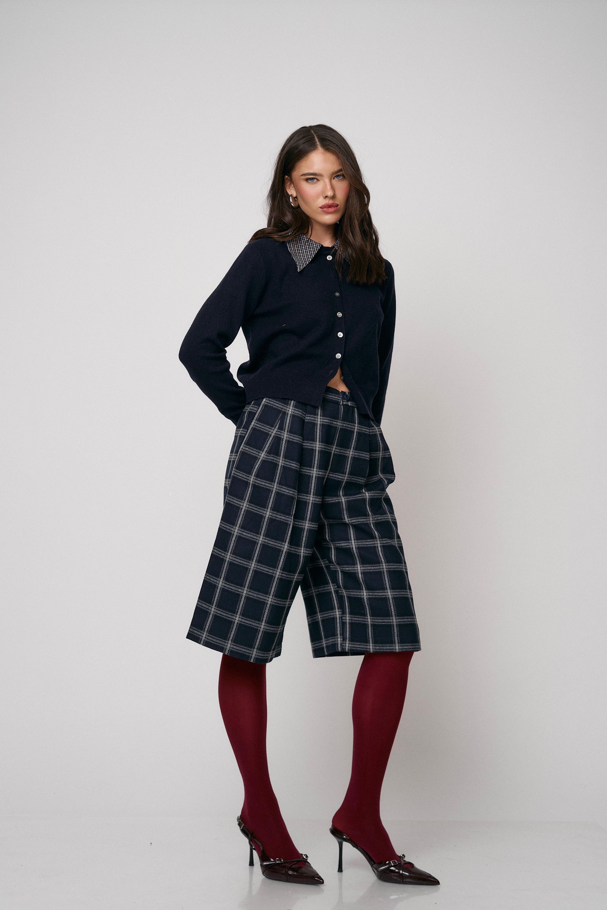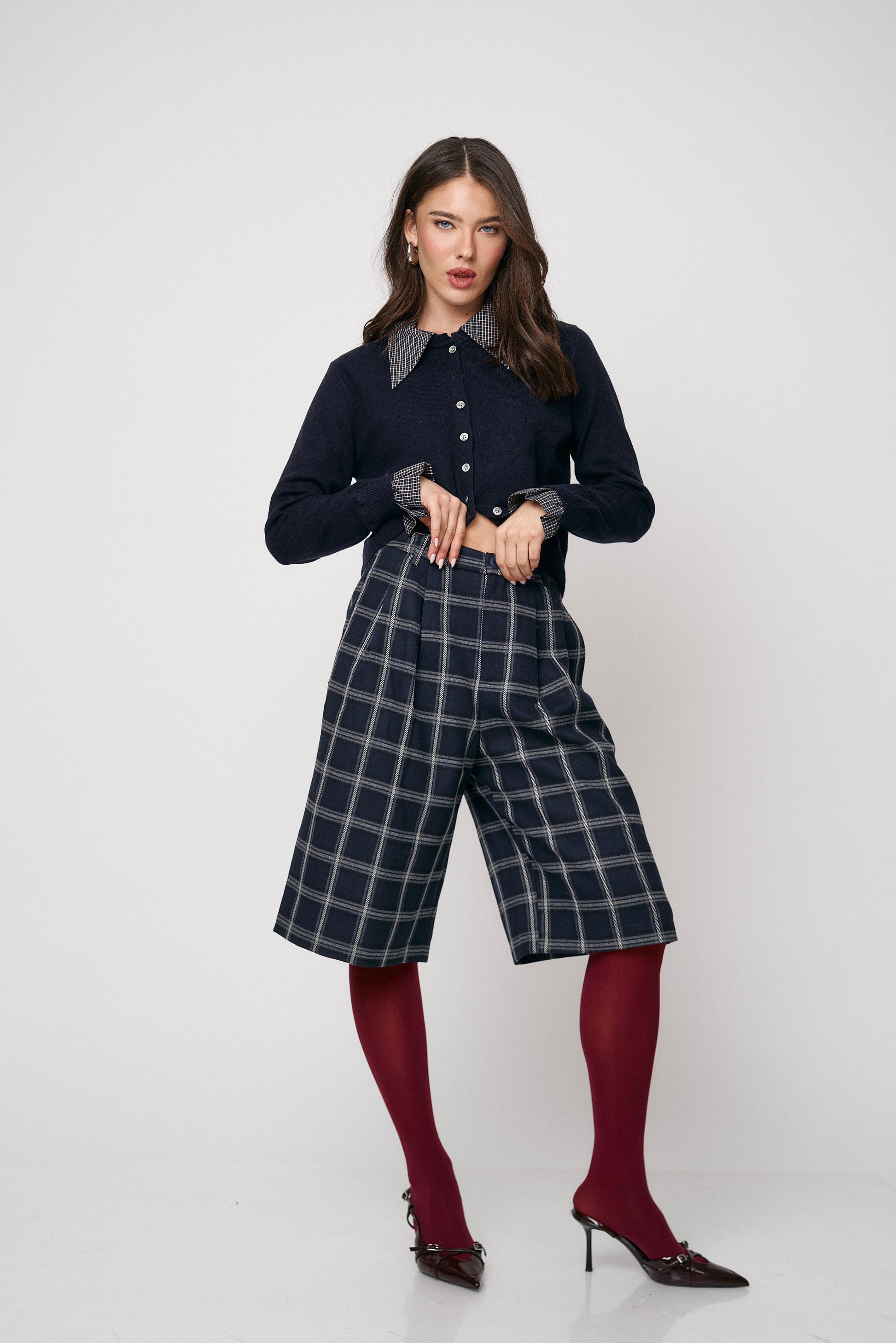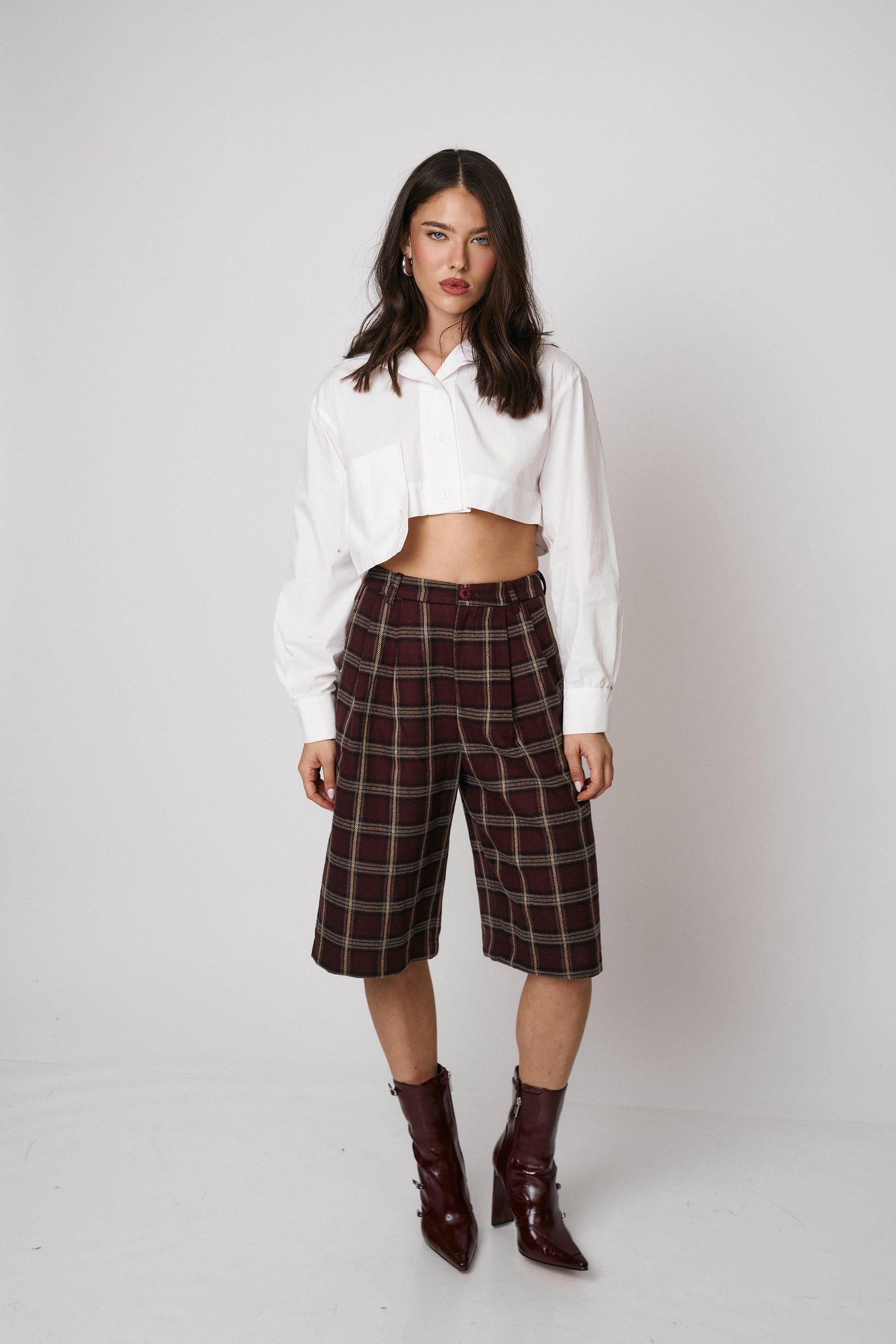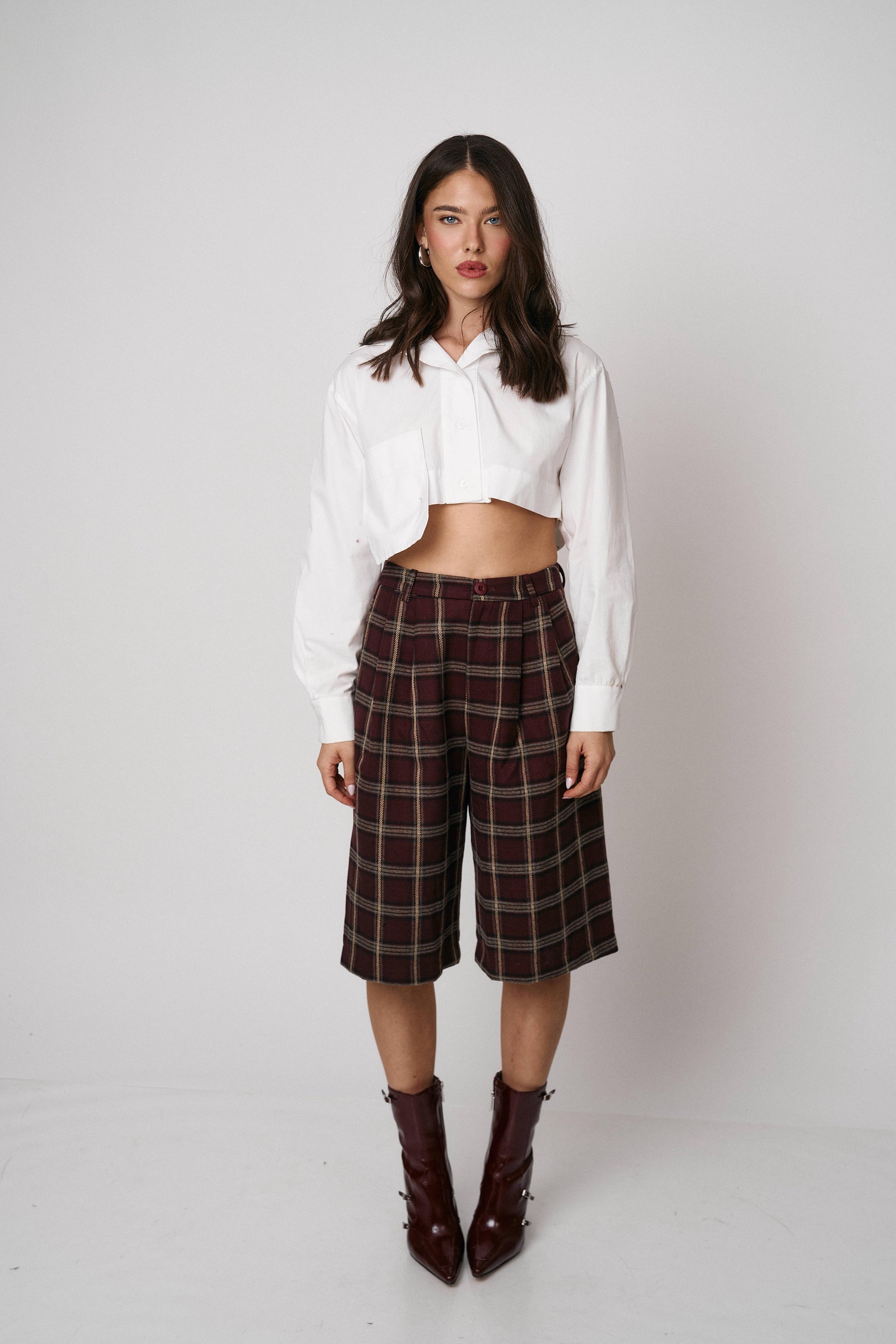 מכנס קלאסי בגזרת ברמודה עם הדפס משבצות מודרני. נוח, מחטב ומתאים ללוקים יום־יומיים או יציאה