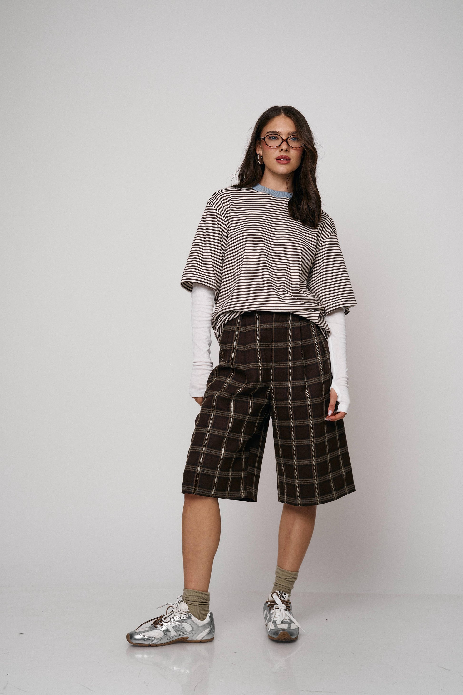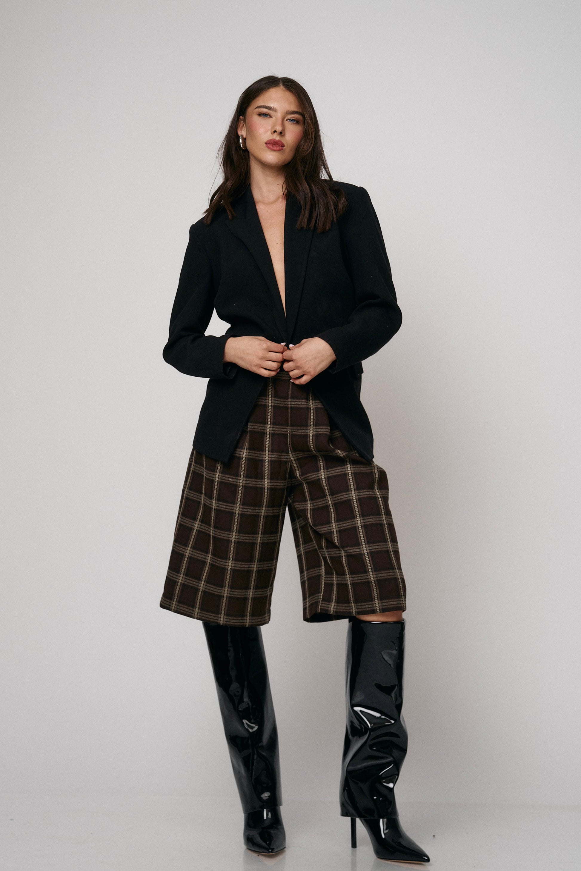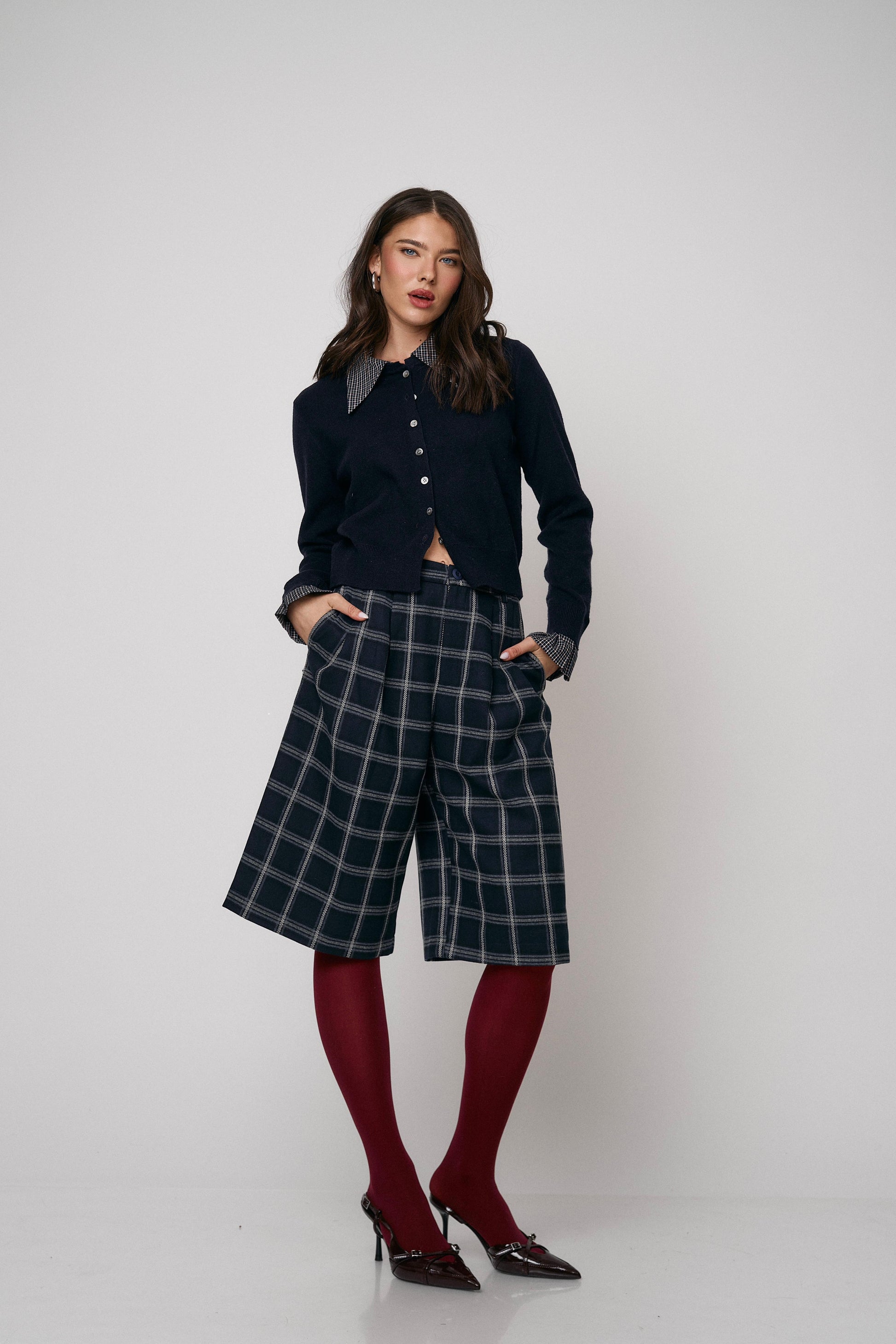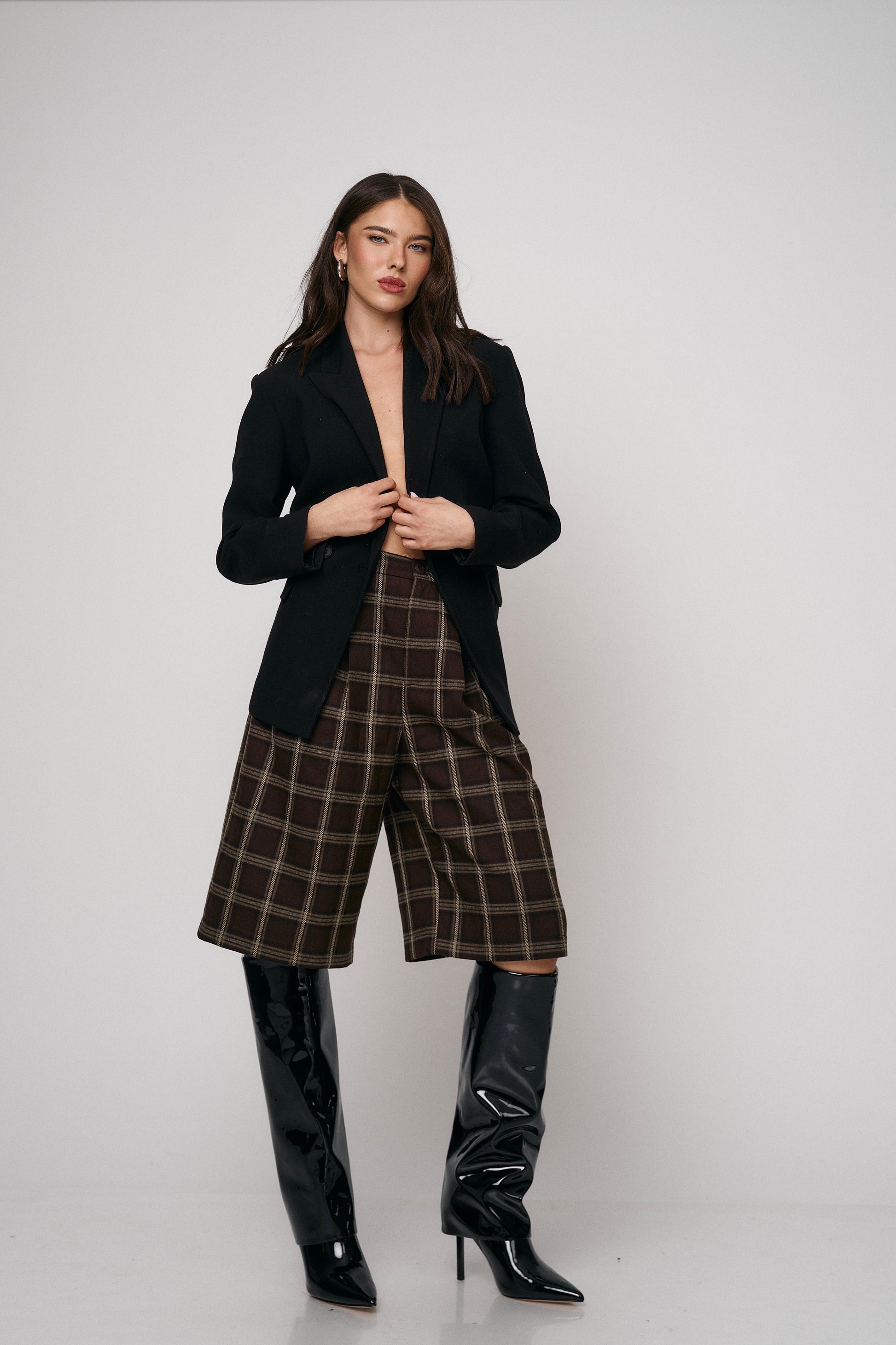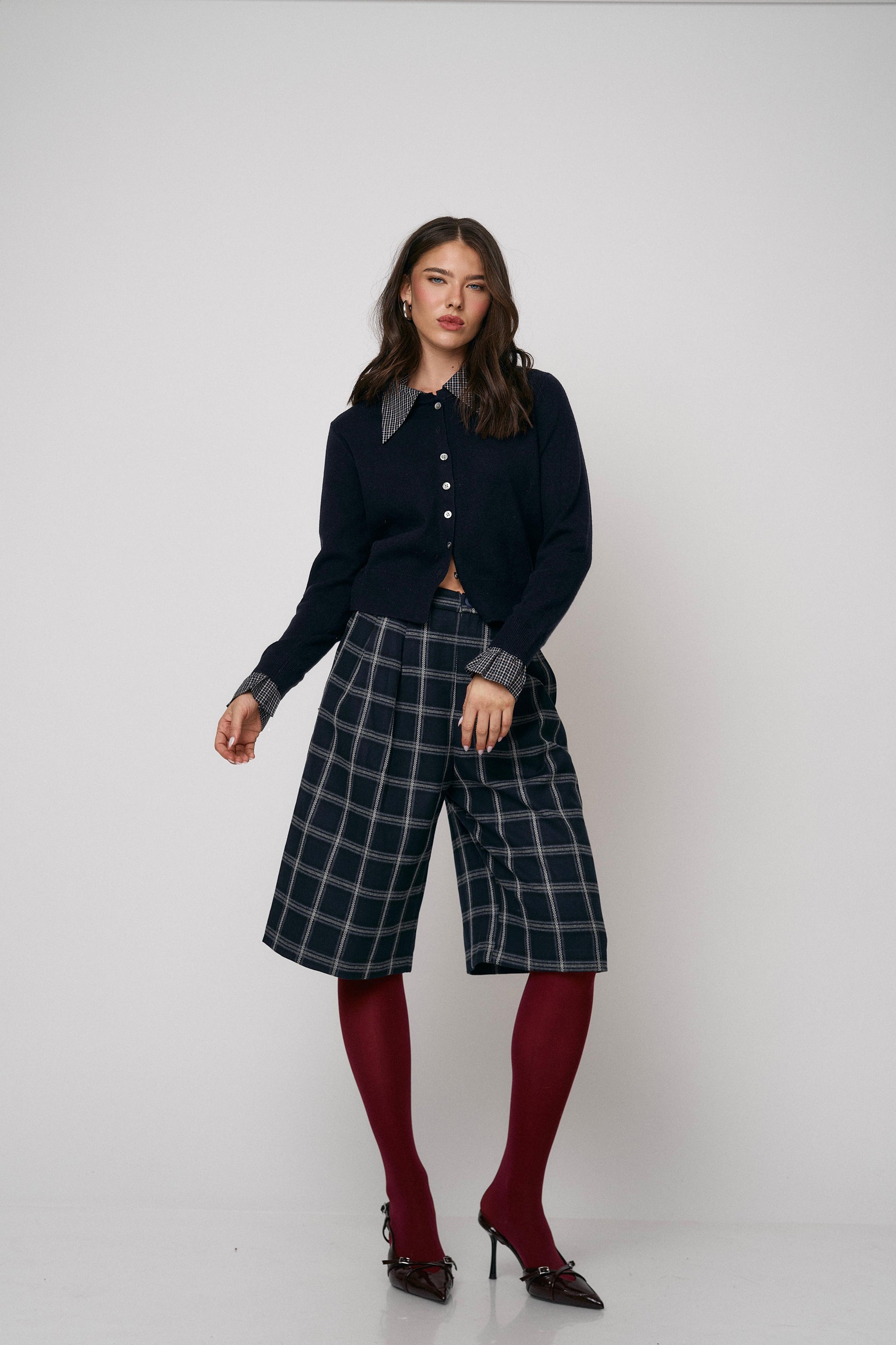 מכנס קלאסי בגזרת ברמודה עם הדפס משבצות מודרני. נוח, מחטב ומתאים ללוקים יום־יומיים או יציאה