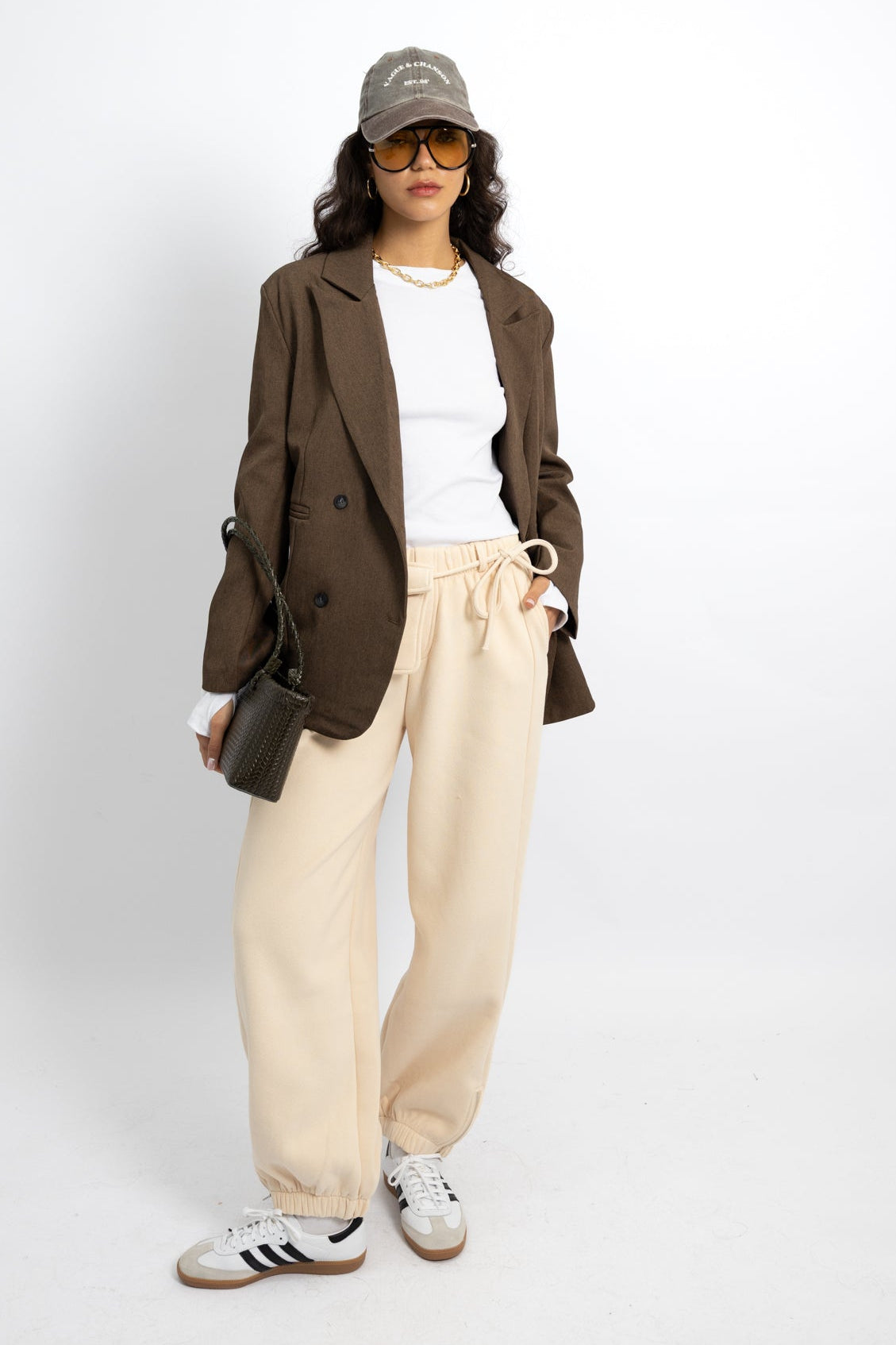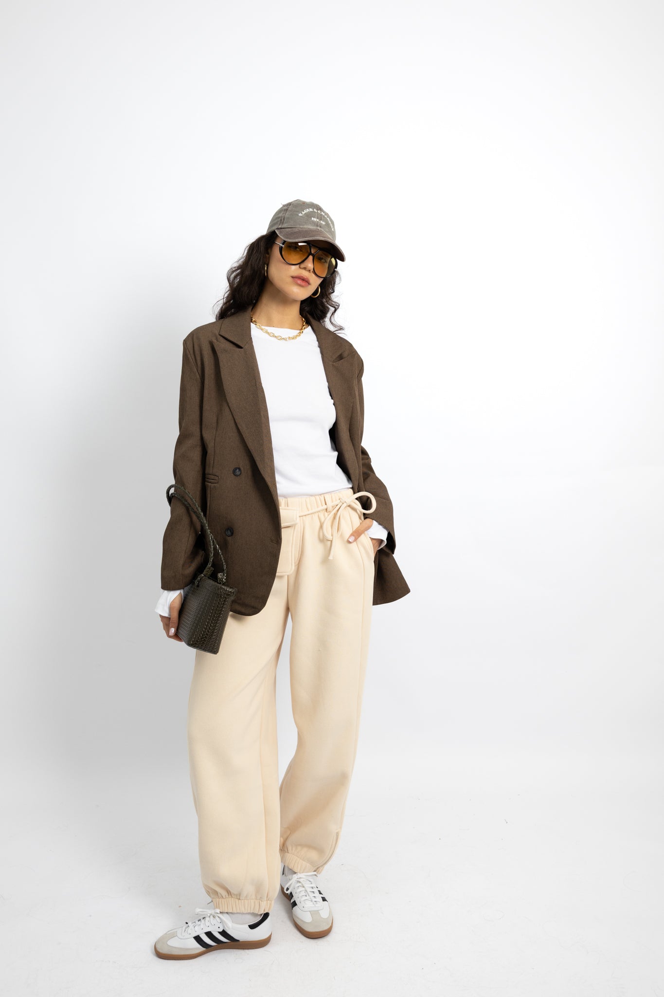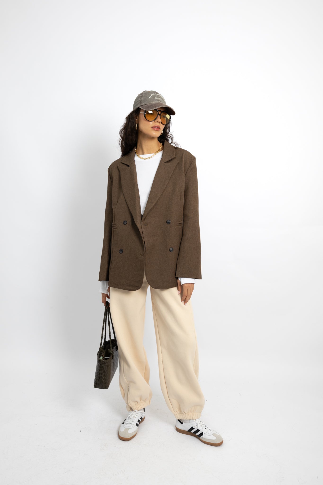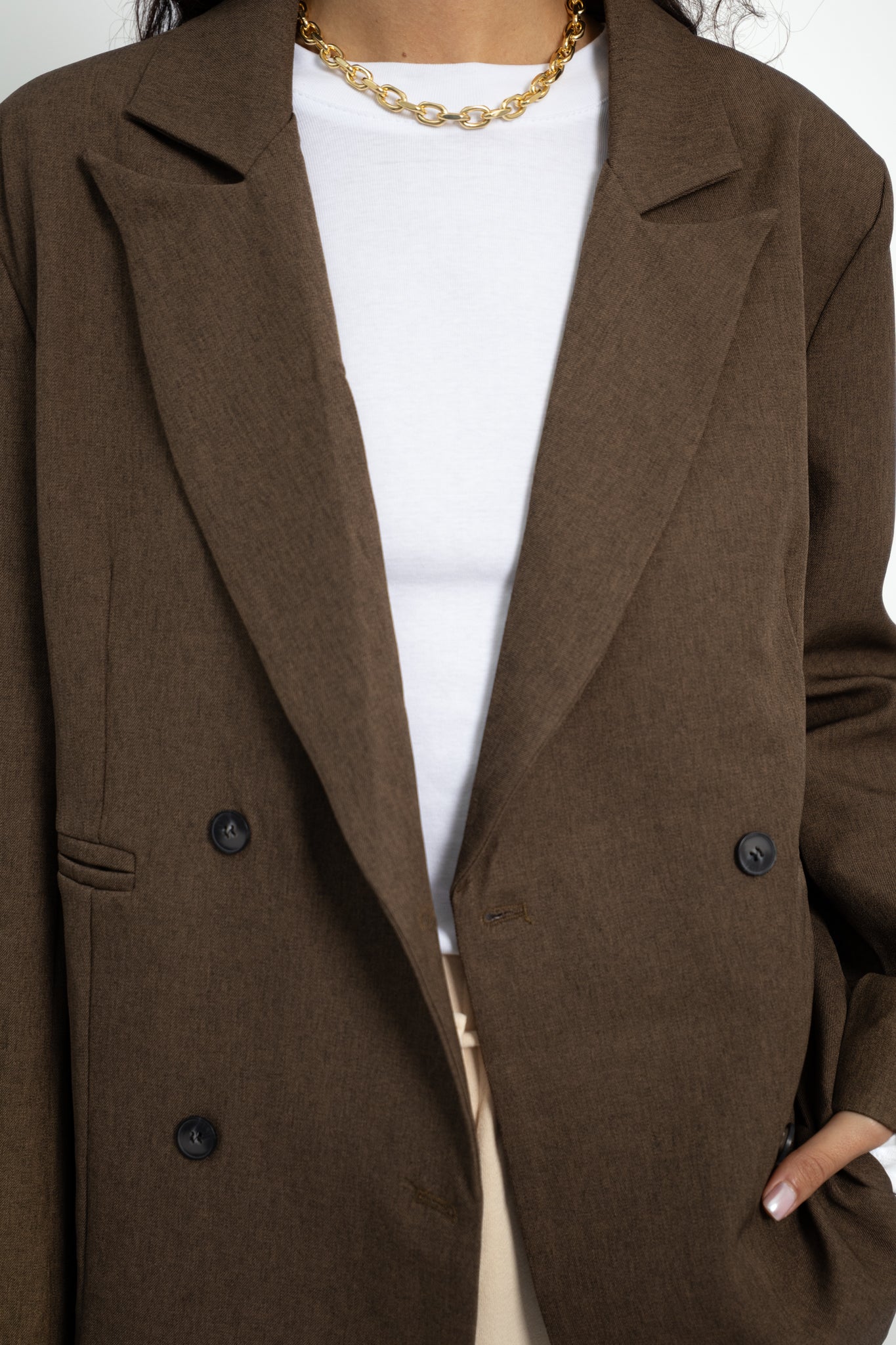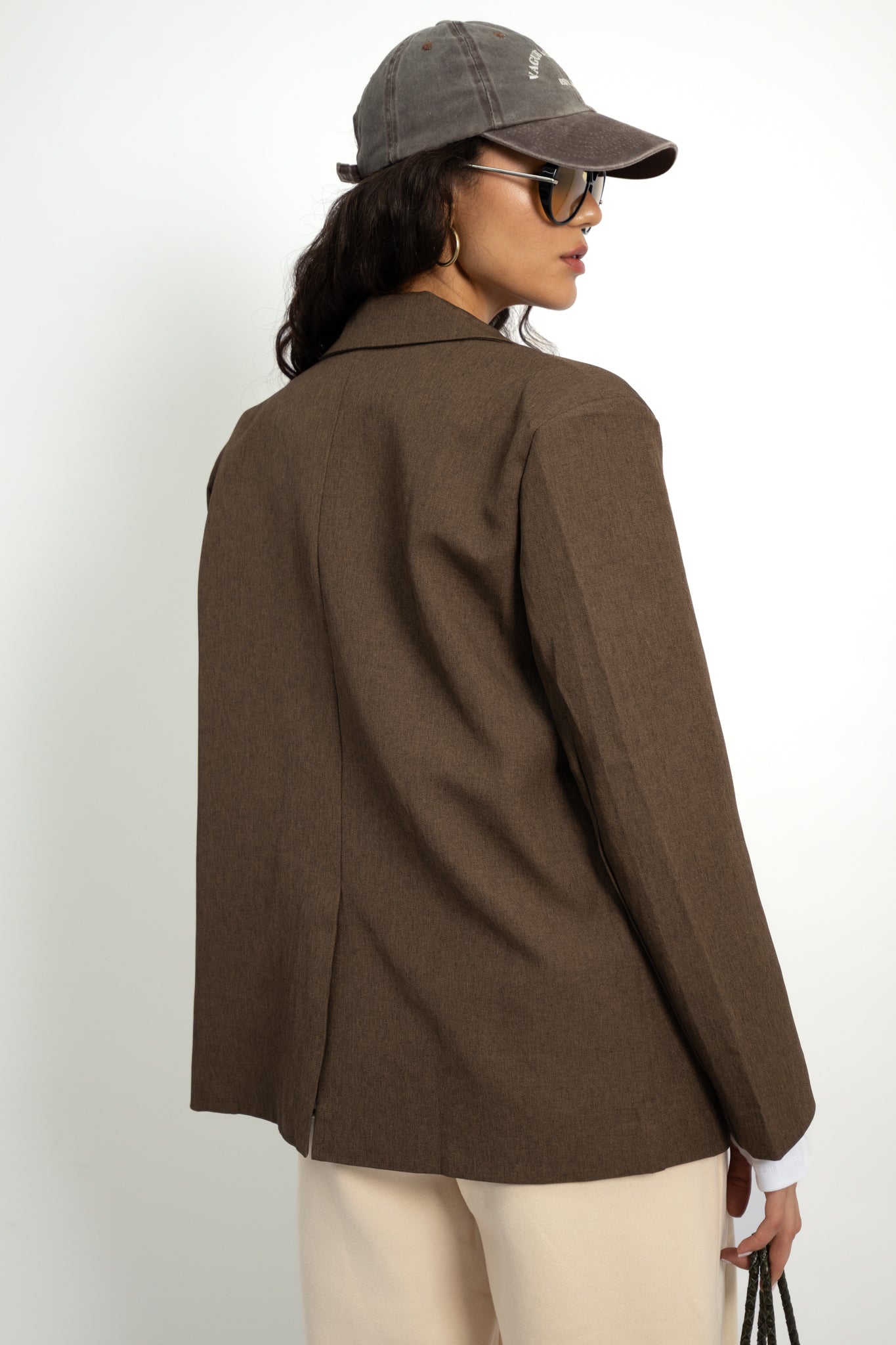 ג׳קט חום משוחרר בגזרה מחויטת, מוסיף סטייל נקי ומדויק לכל לוק יומיומי או ערב.