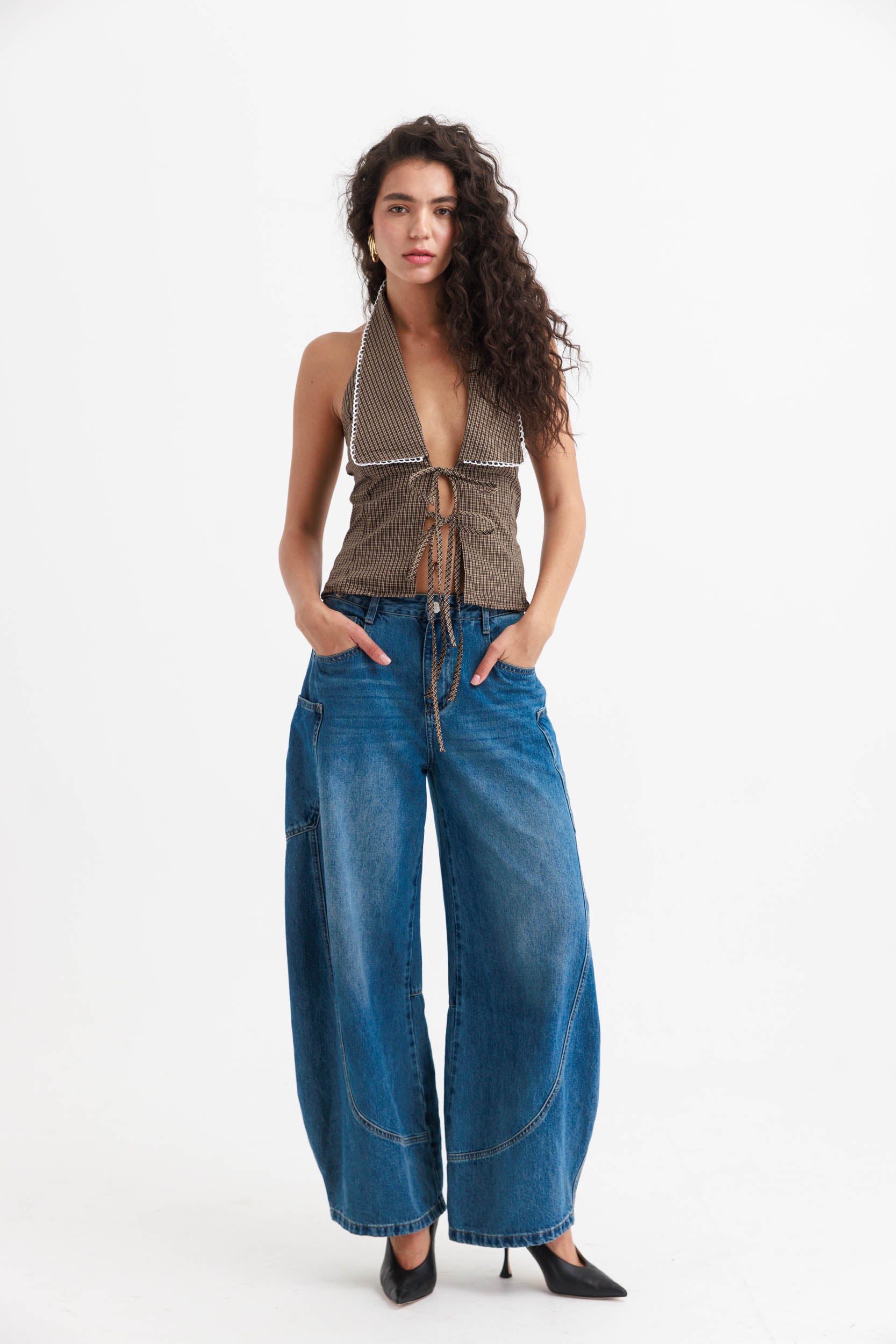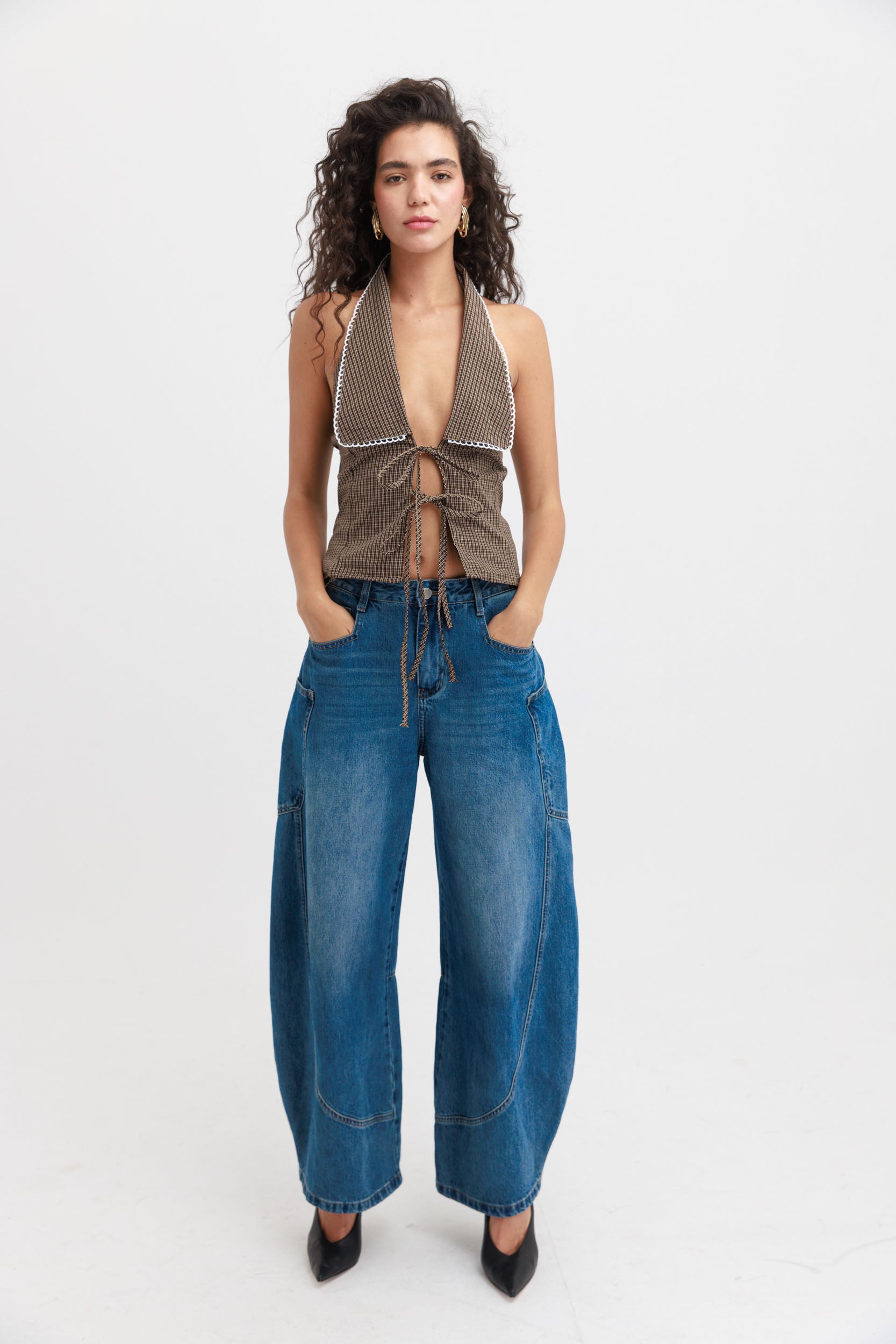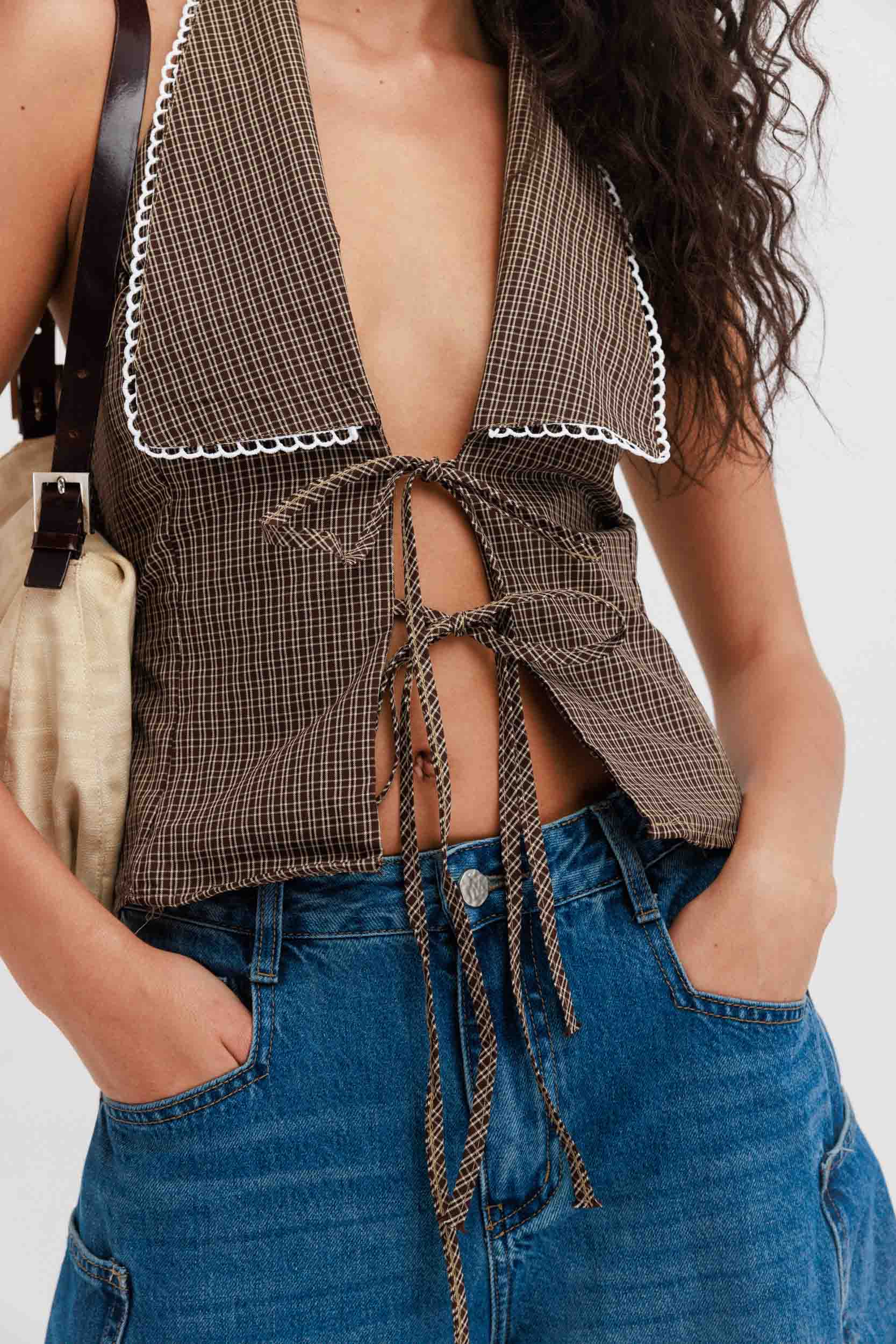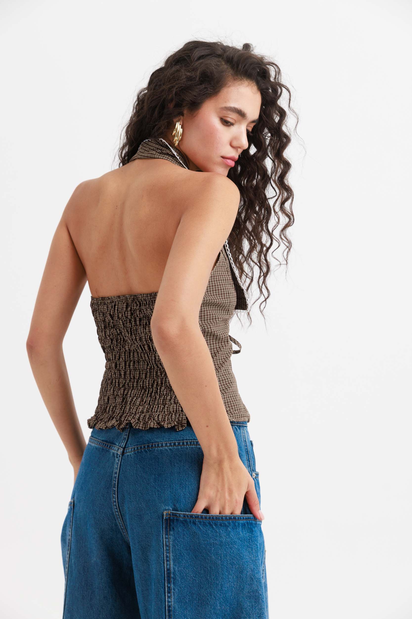 הפריט עשוי בד קלילה בהדפס משבצות חומות דקות, עם קולר רחב שממסגר את המחשוף