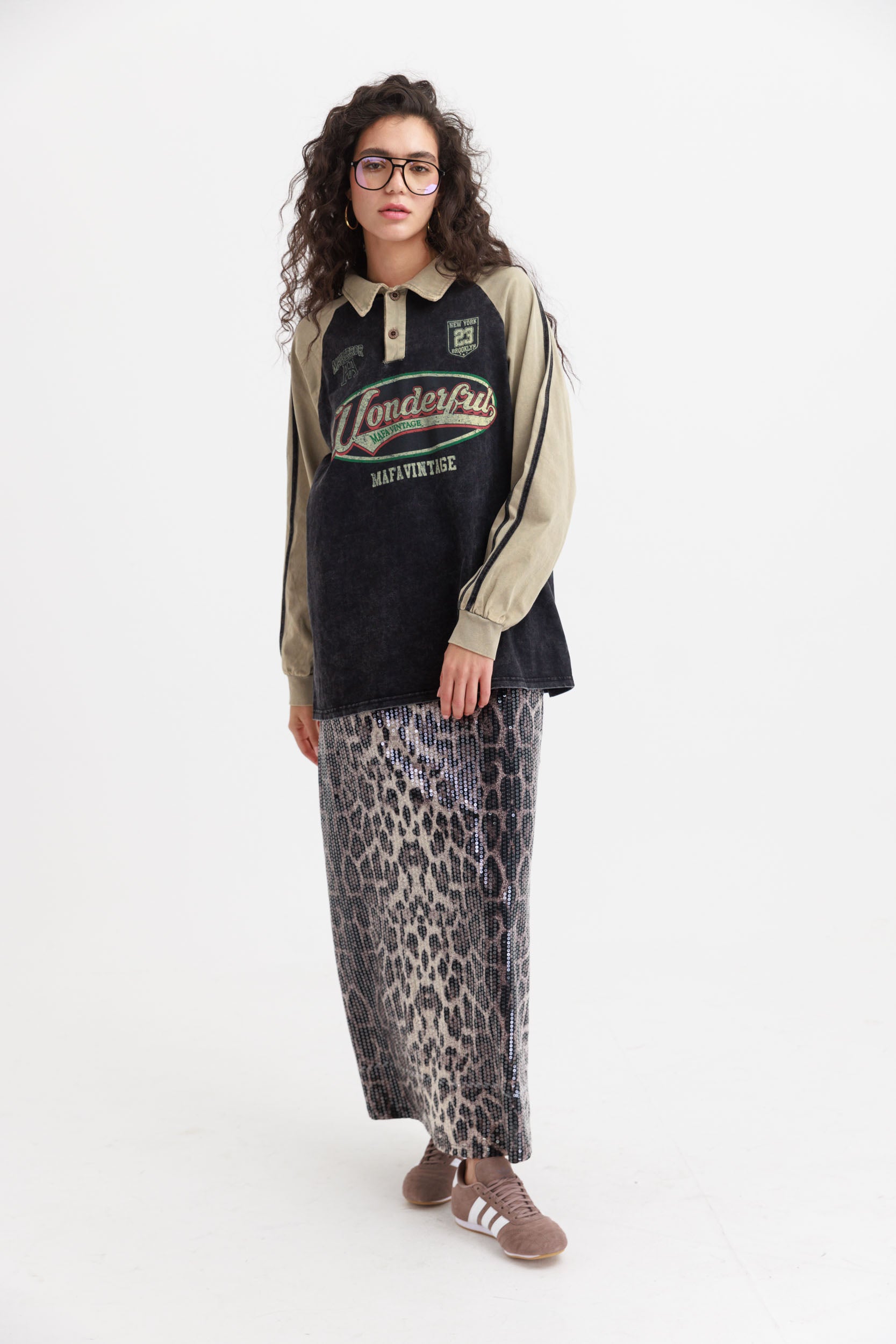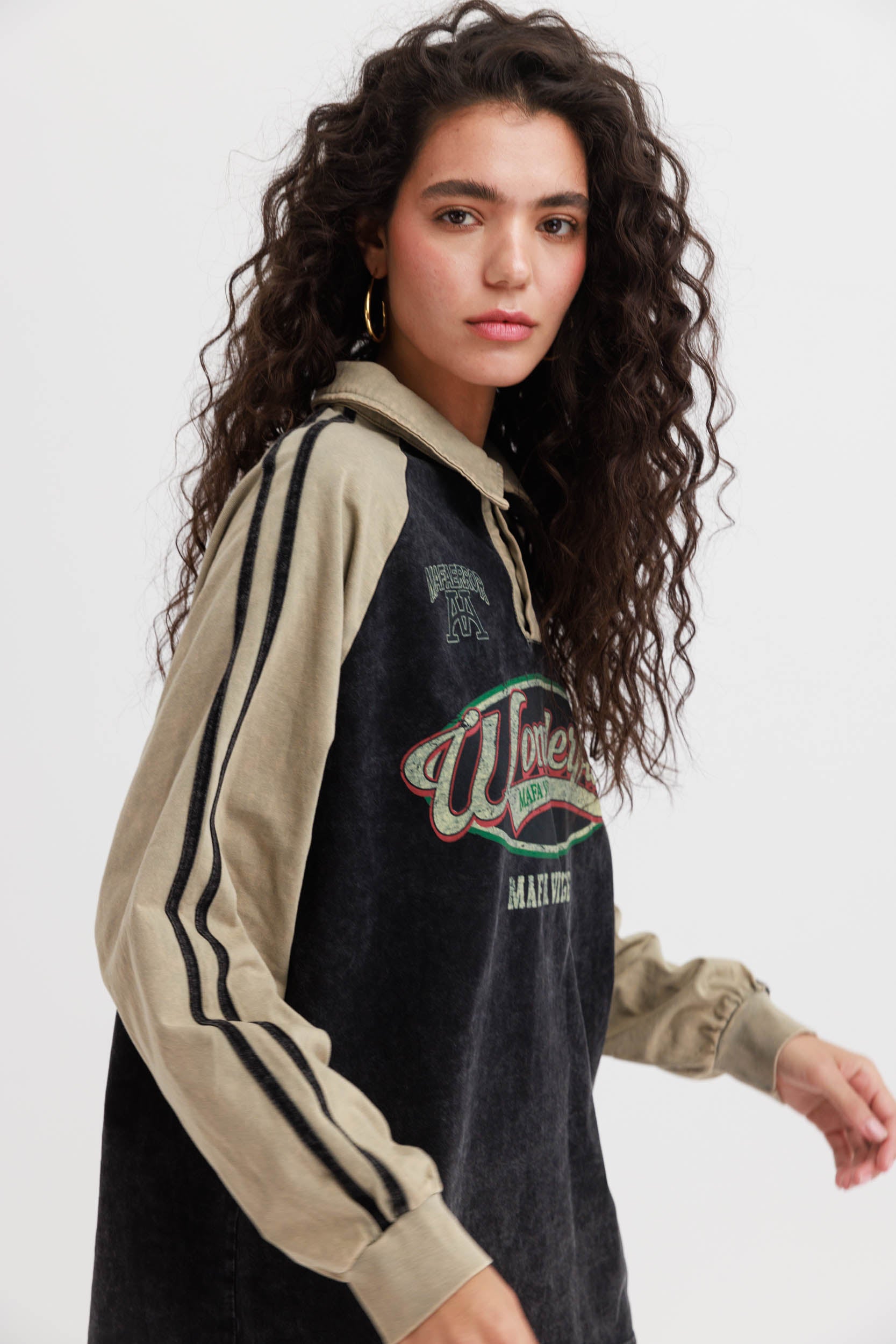 חולצת פולו בסגנון קולג' בגזרת אוברסייז עם שילוב שרוולים בקונטרסט