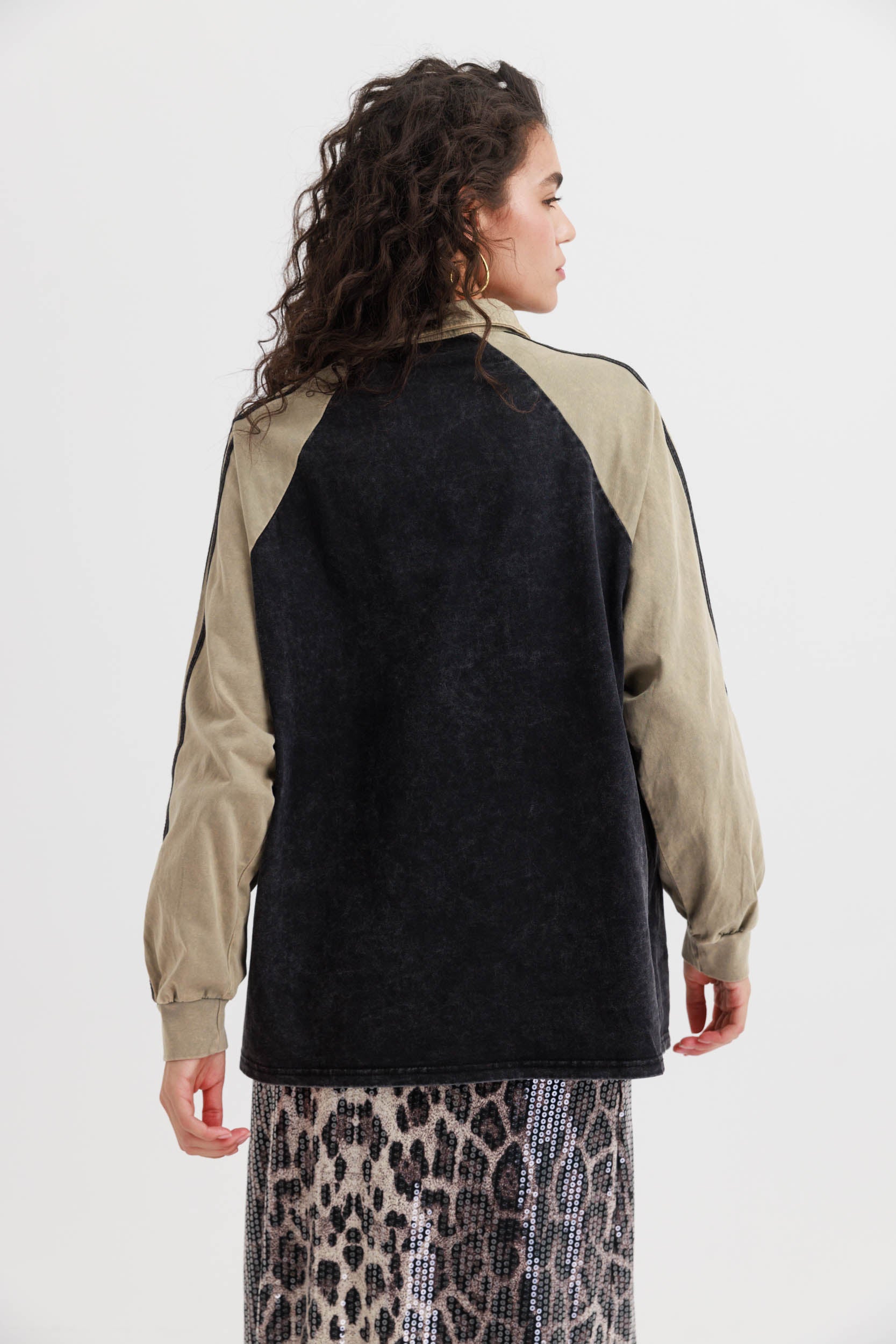 בד ווש כהה עם הדפס י וקווי סטרייפ לאורך השרוולים