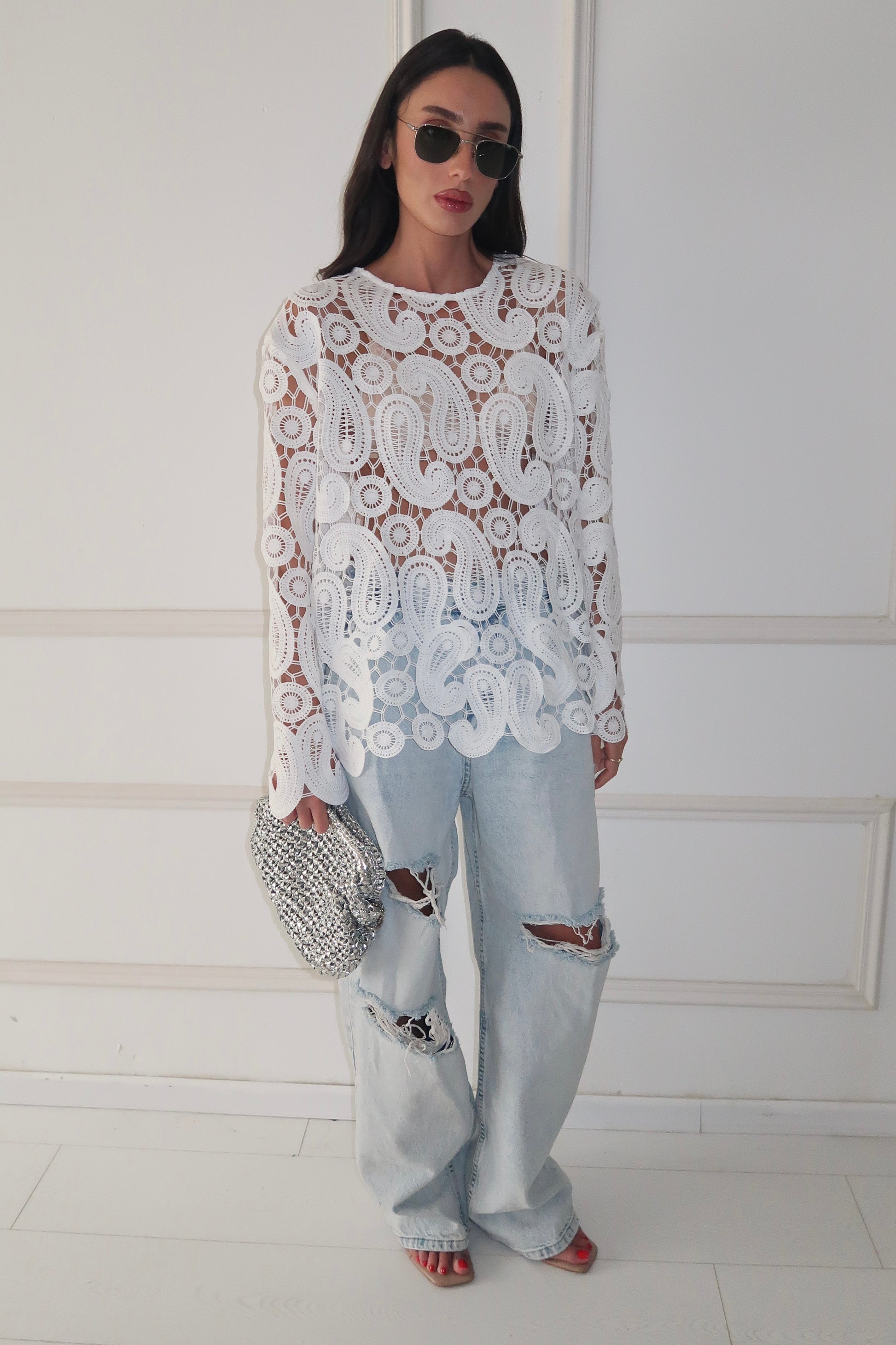 חולצה עם דוגמאות פייזלי עבות, שקופה במראה יוקרתי ונינוח. מתאימה לשילוב עם ג’ינס קרוע לאאוטפיט אורבני-חגיגי, או מעל מכנסיים מחויטים ללוק ערב