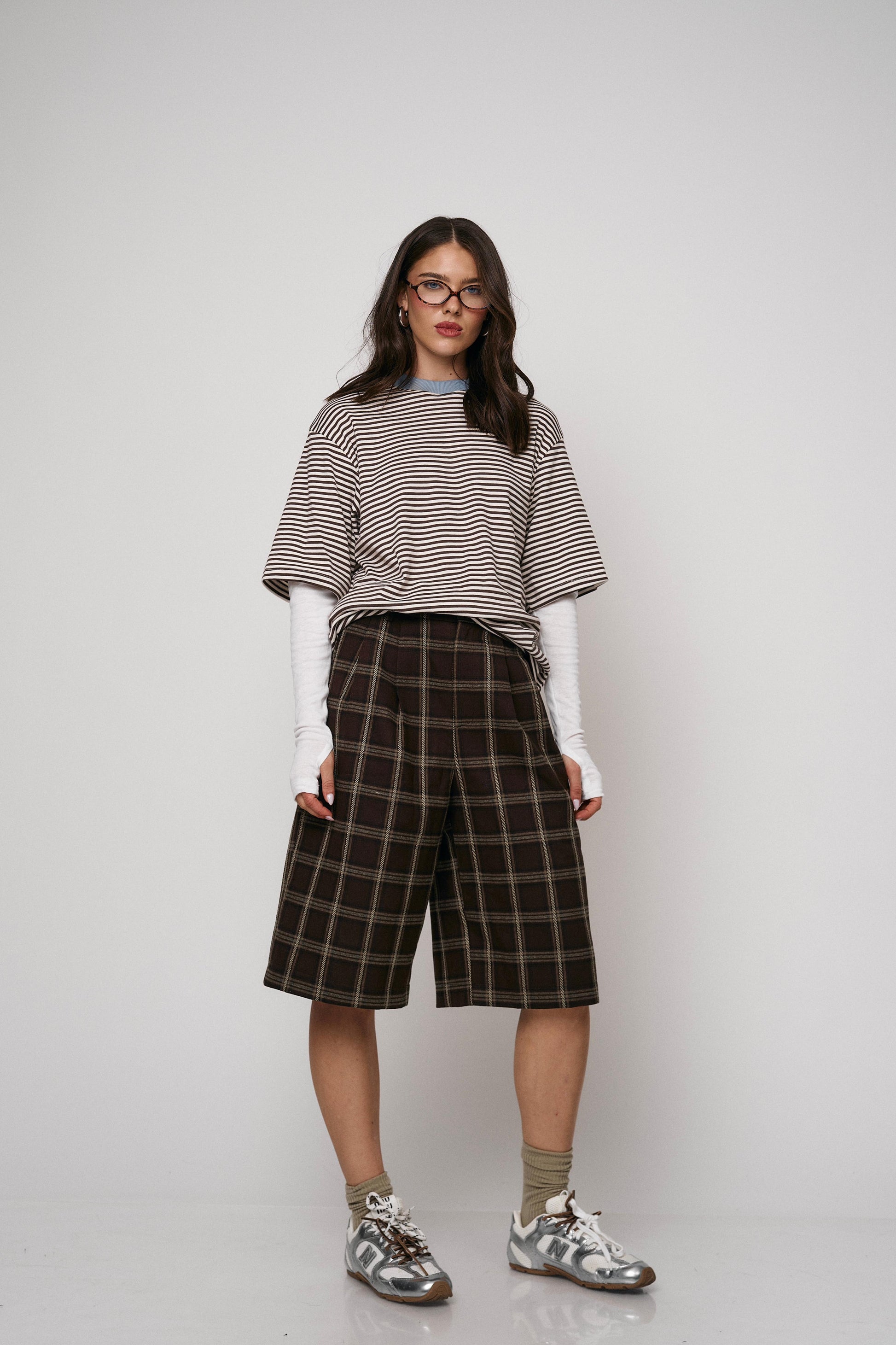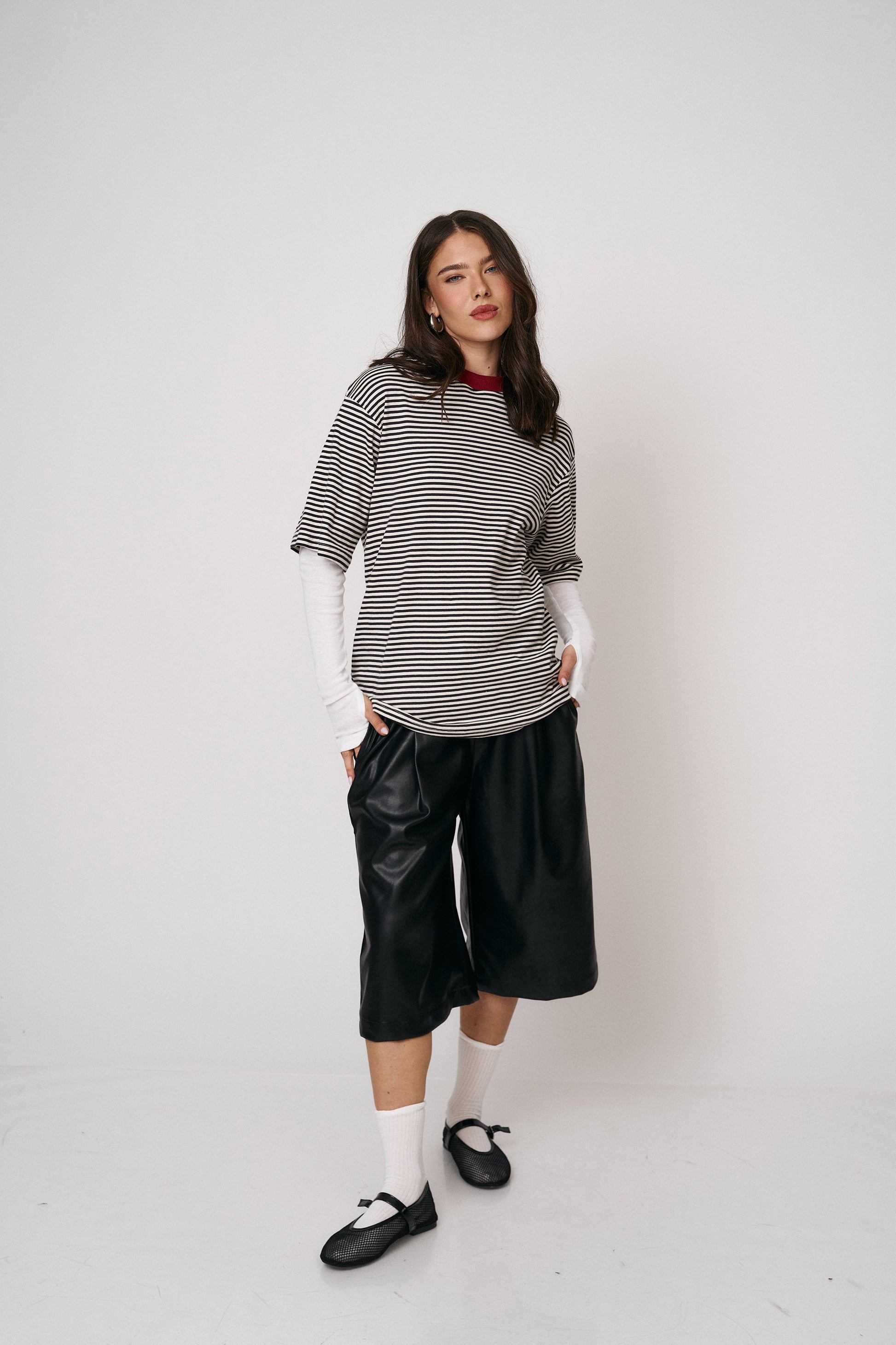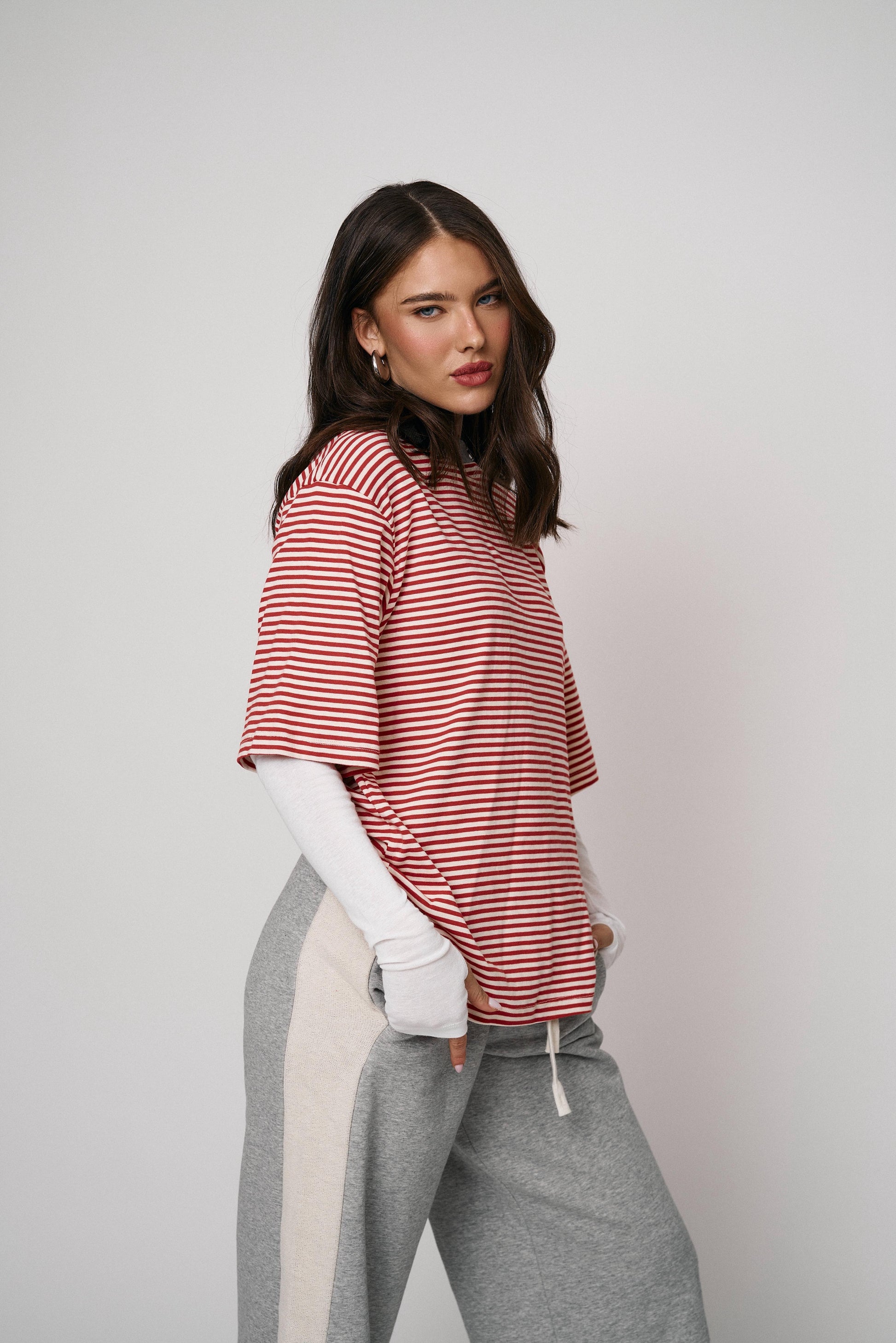 טי־שירט אוברסייז משוחררת עם פסים, מראה שכבות טרנדי ונוח, מושלם ללוק יומיומי