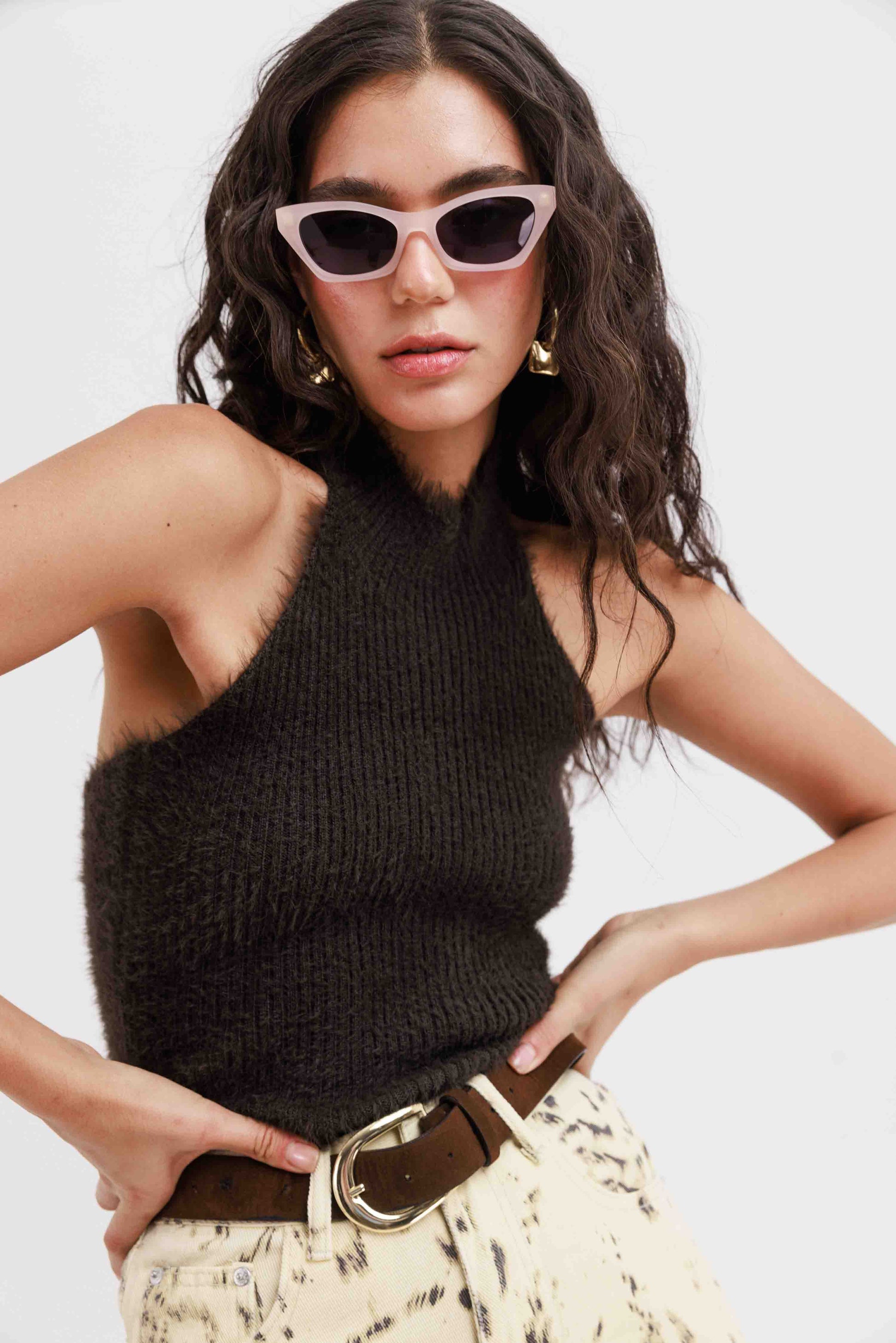 טופ סריג ללא שרוולים במרקם פלפי עדין ובגזרת צווארון גבוה