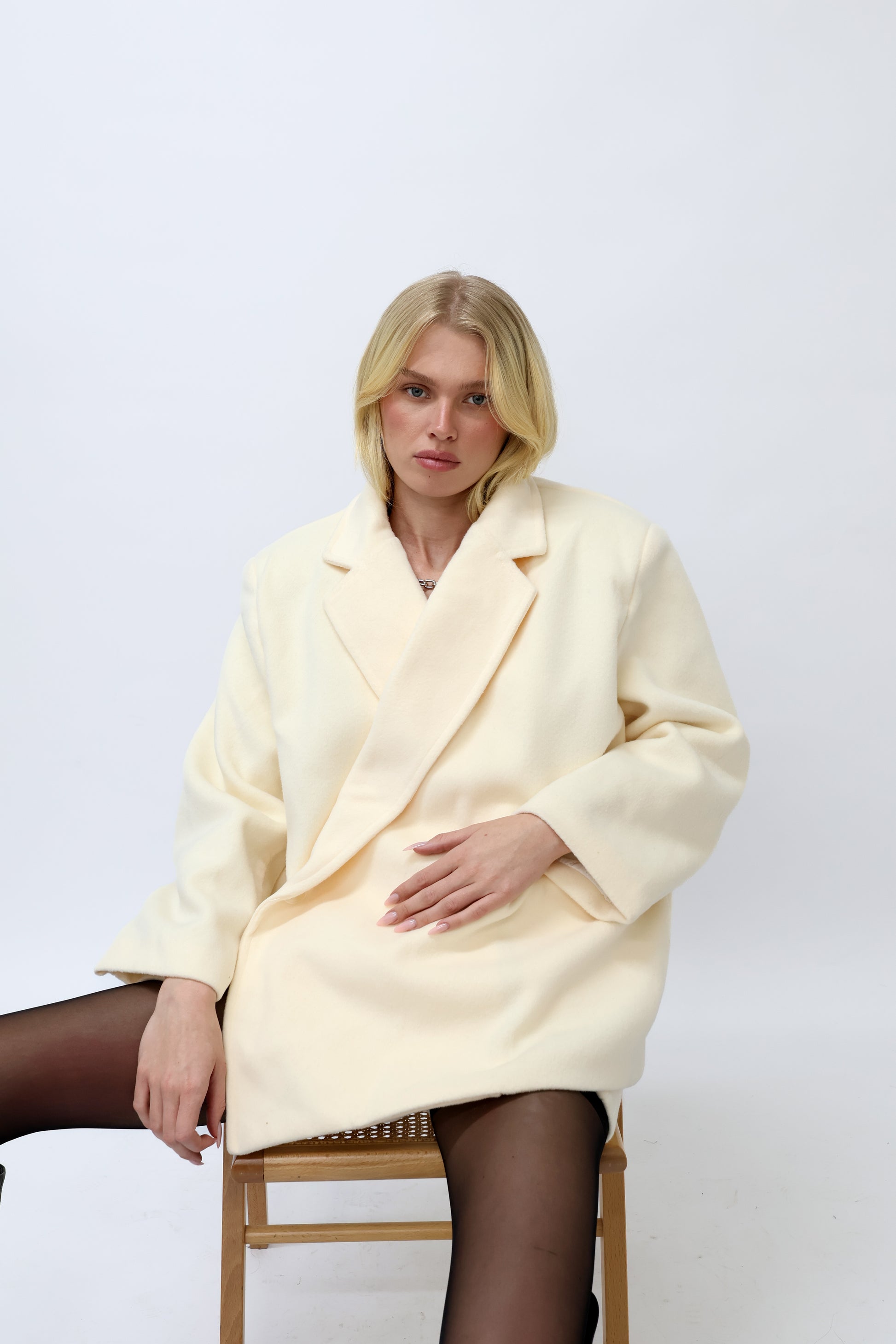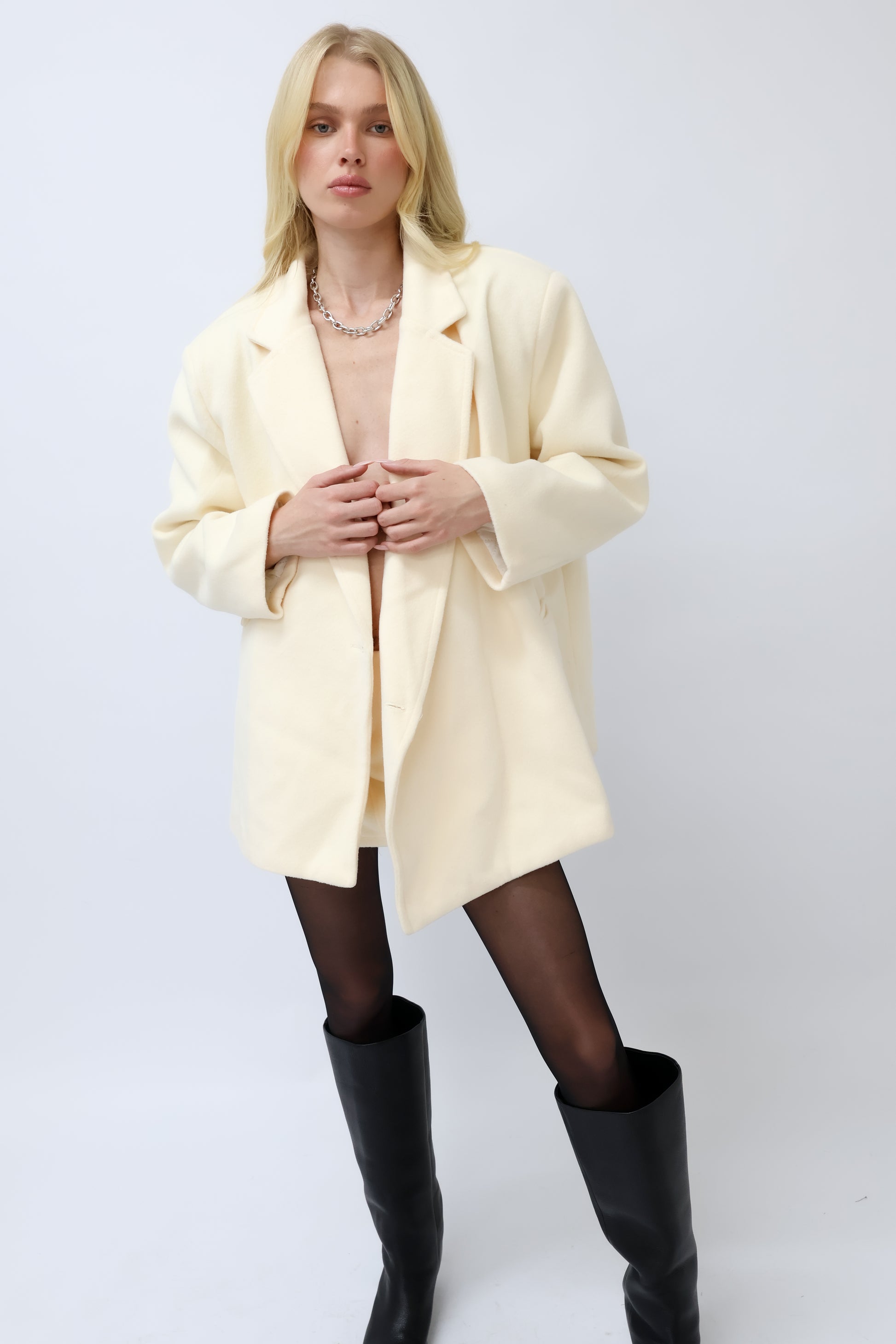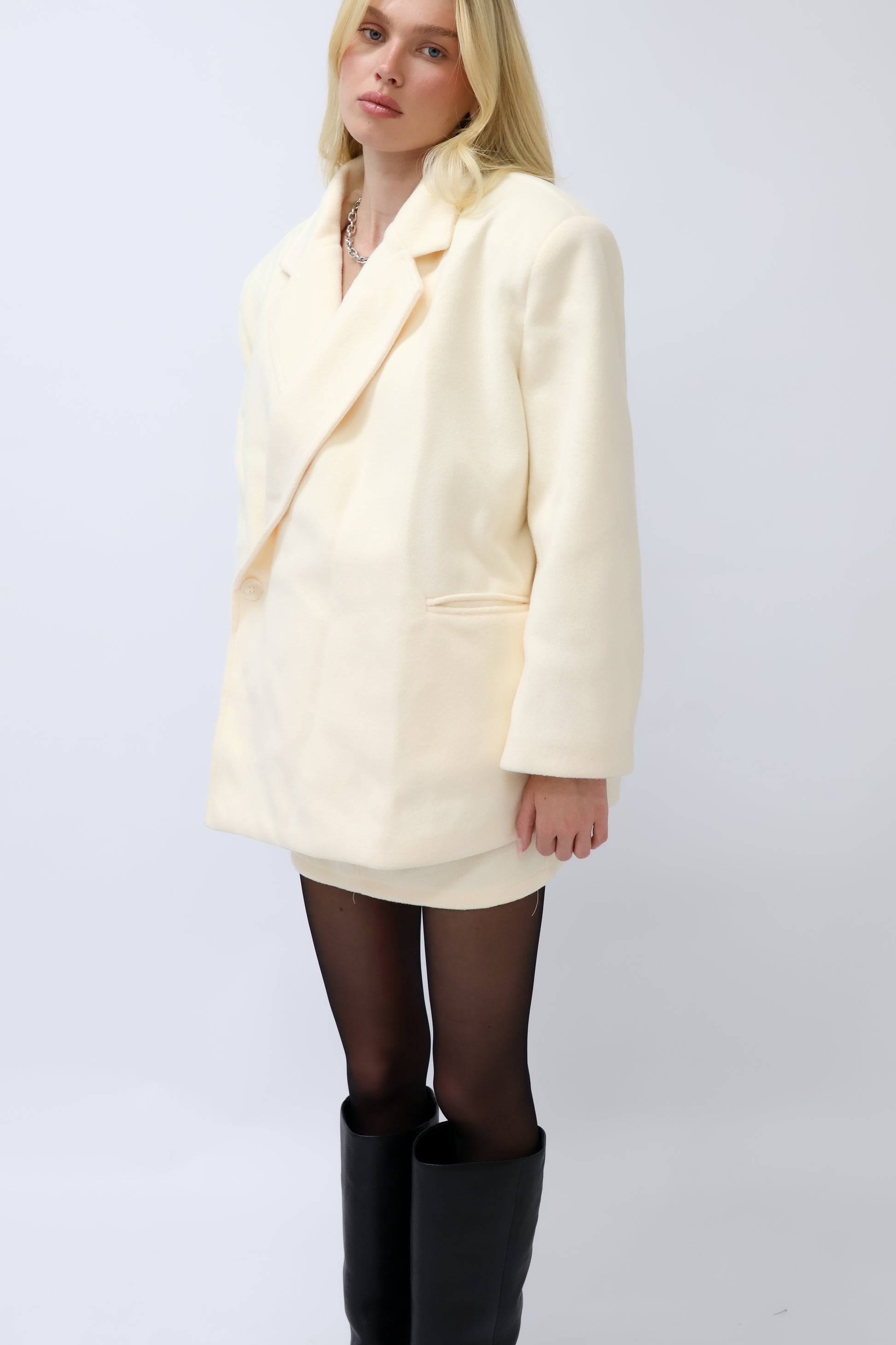 חליפת צמר שני חלקים בגוון שמנת, בלייזר אוברסייז ברכיבה צדדית וחצאית מיקרו מיני