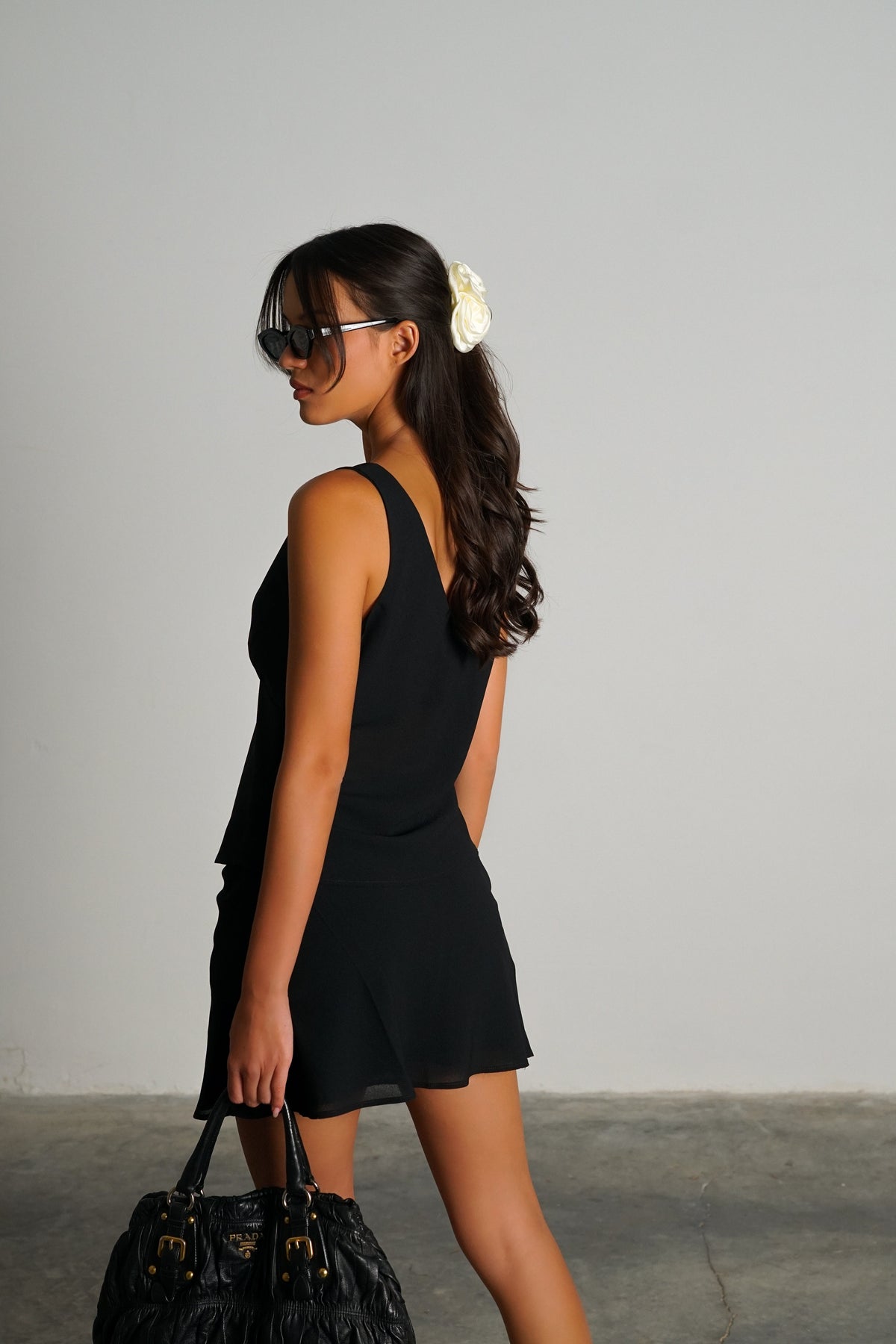 חליפת שני חלקיםA טופ עם מחשוף וי עם פרח עדין | חצאית מיני גזרת קיימת בצבעים: לבן-שחור-צהובמידות: S 34-36 M 36-38 L 38-40