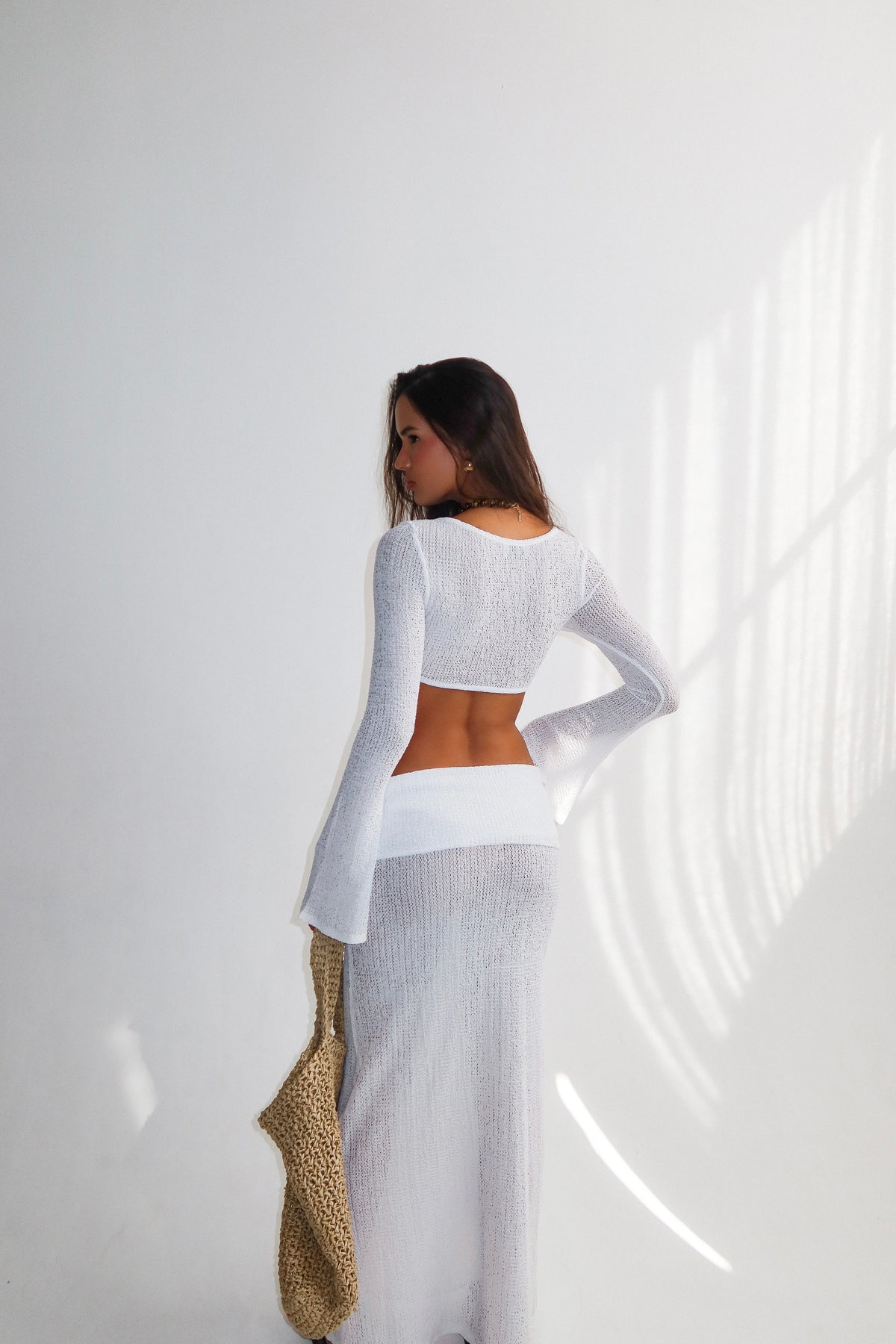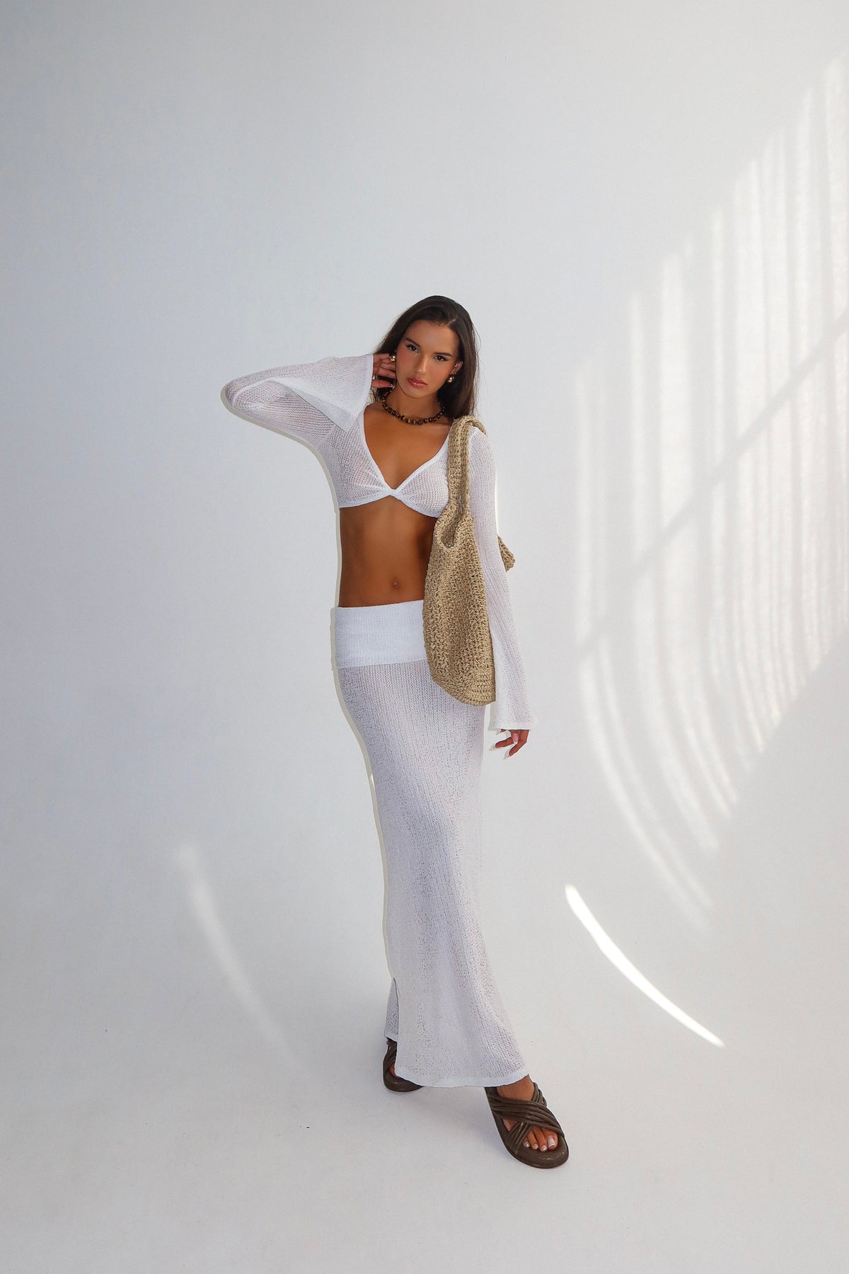 |טופ עם שרוולים ארוכים וטוויסט בחזה|חצאית מקסי בגזרה נמוכה עם קיפול באיזור המותןקיים בצבעים: חום-לבן-שחורמידות S 34-36 M 38-40