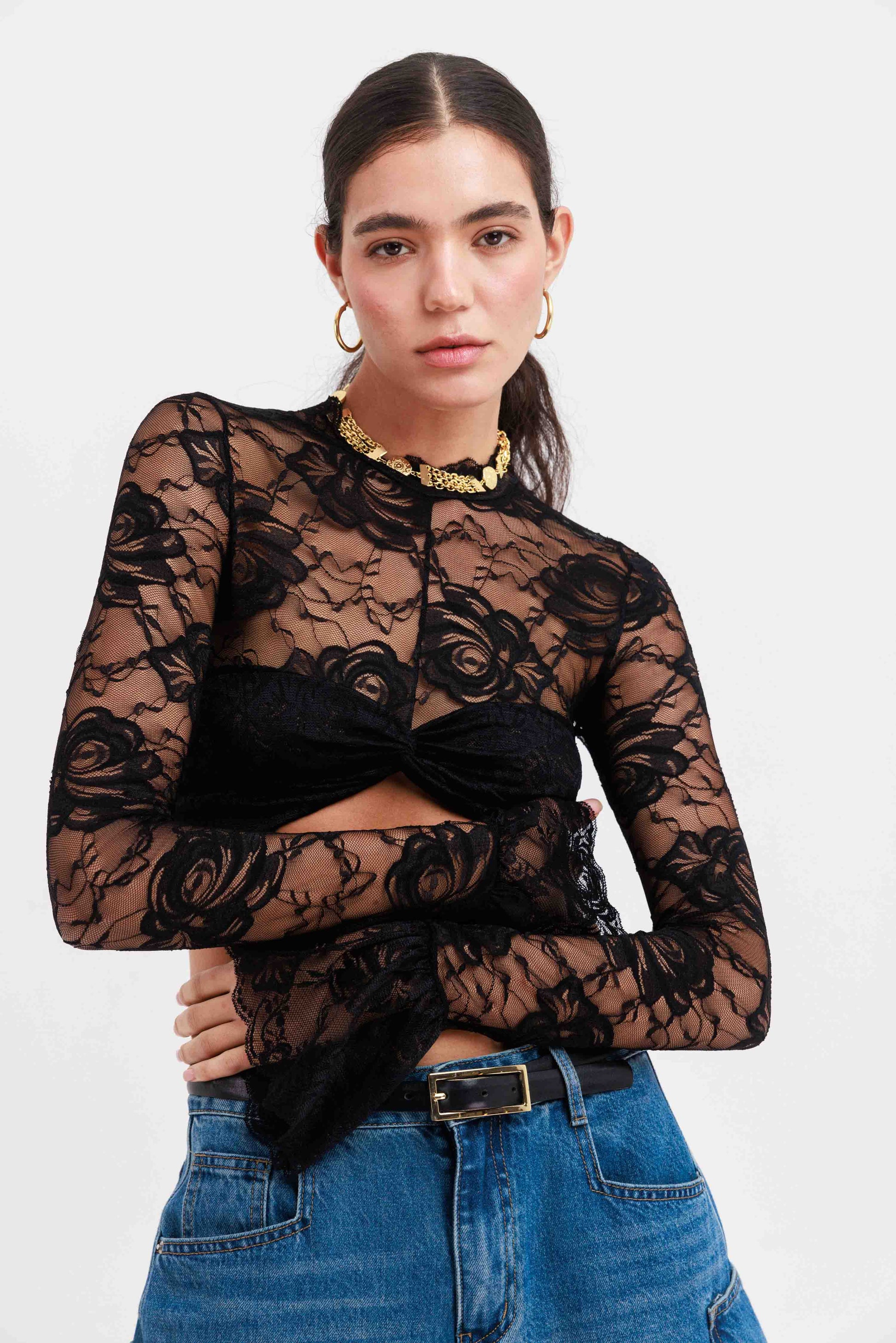 חולצת קרופ צמודה מבד תחרה עם שרוול ארוך עם סיומת מלמלה רחבה, עיטורי פרחים עדינים וכיווצים באזור החזה