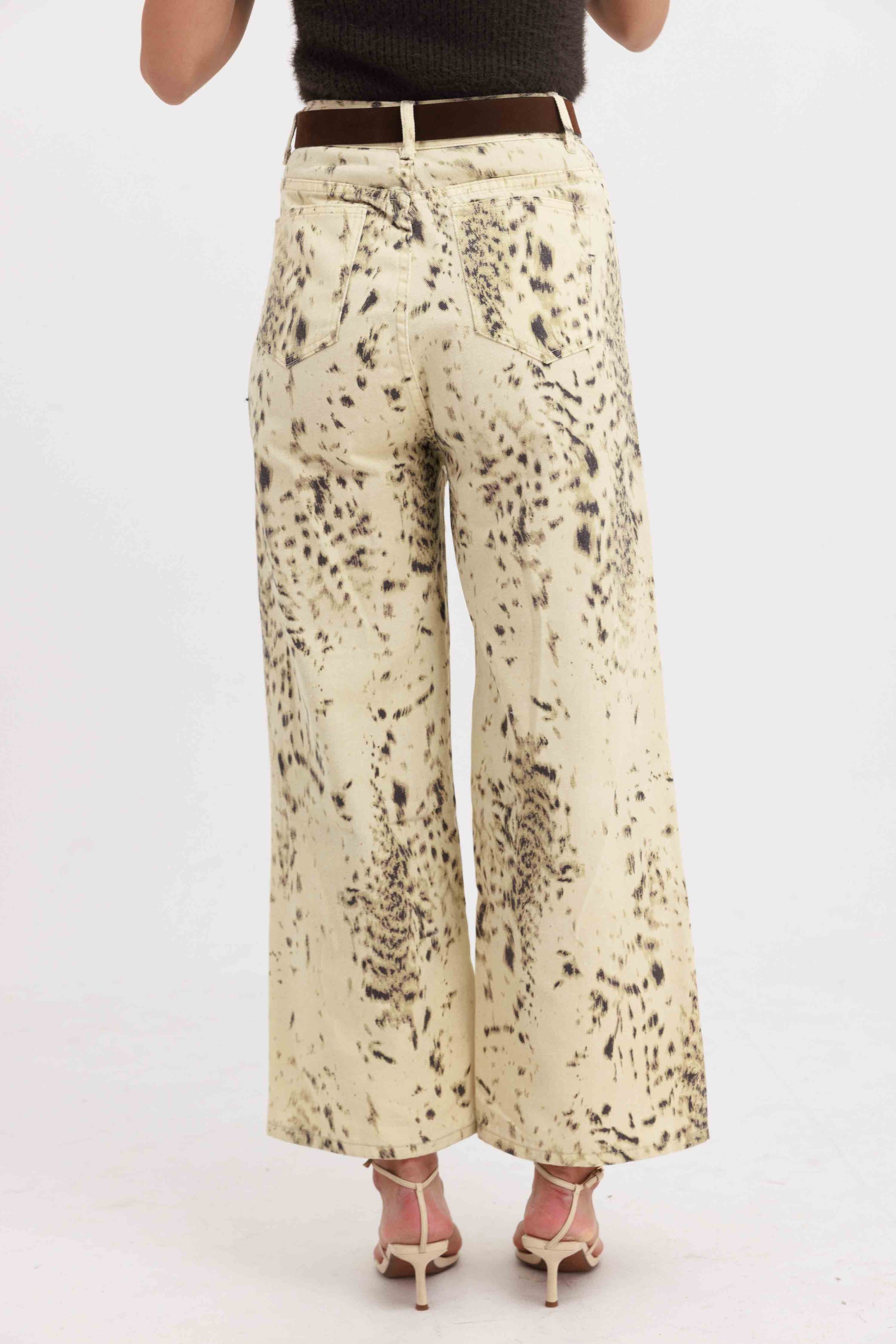 מכנסי ג׳ינס בגזרה רחבה עם הדפס בסגנון טאי-דאי עדין, המעניק למכנסיים מראה אקלקטי וצבעוני