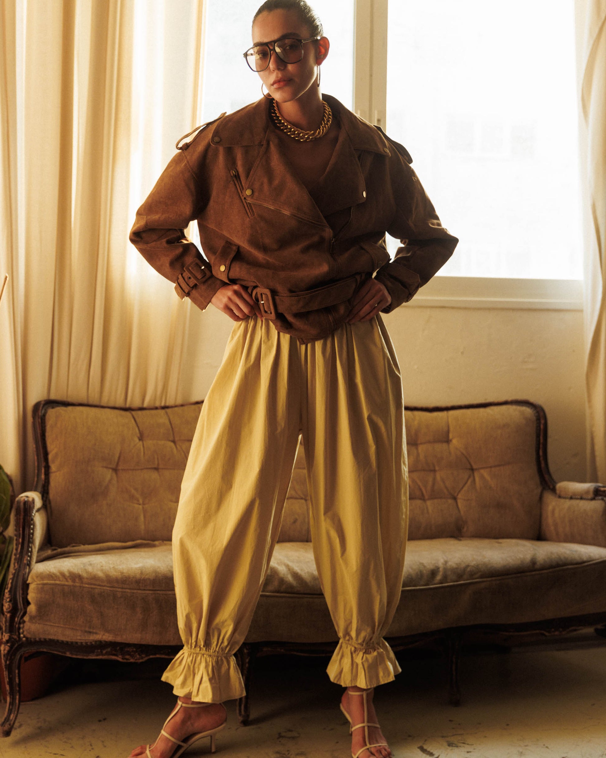 מכנסיים רחבים בגזרת בלון עם מותן אלסטית בזכות חגורת גומי המאפשרת התאמה נוחה ומגוונת