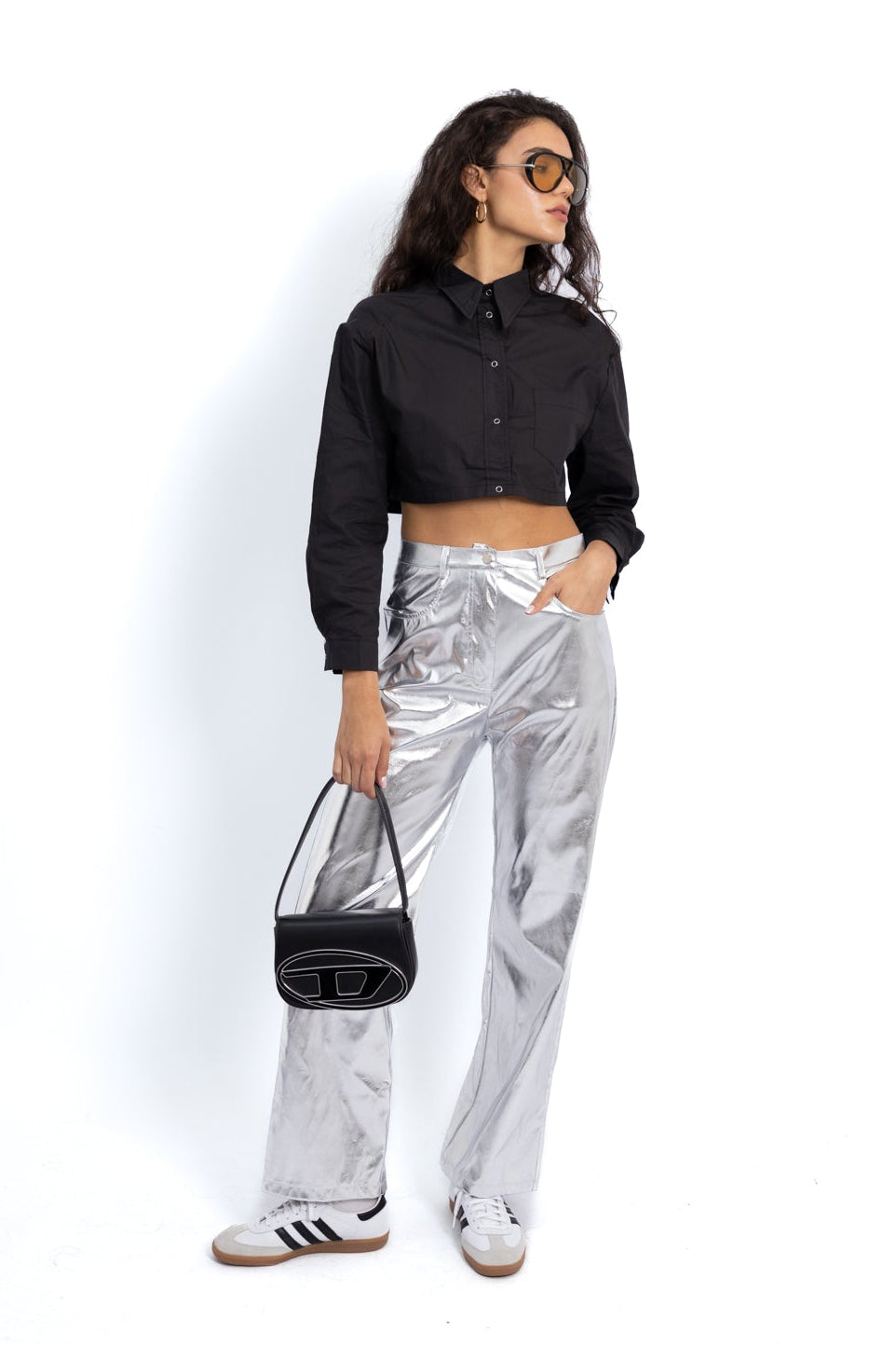 מכנס כסוף ארוך זוהר ומבריק עם סט כיסים קדמי וסגירת כפתור ורוכסן